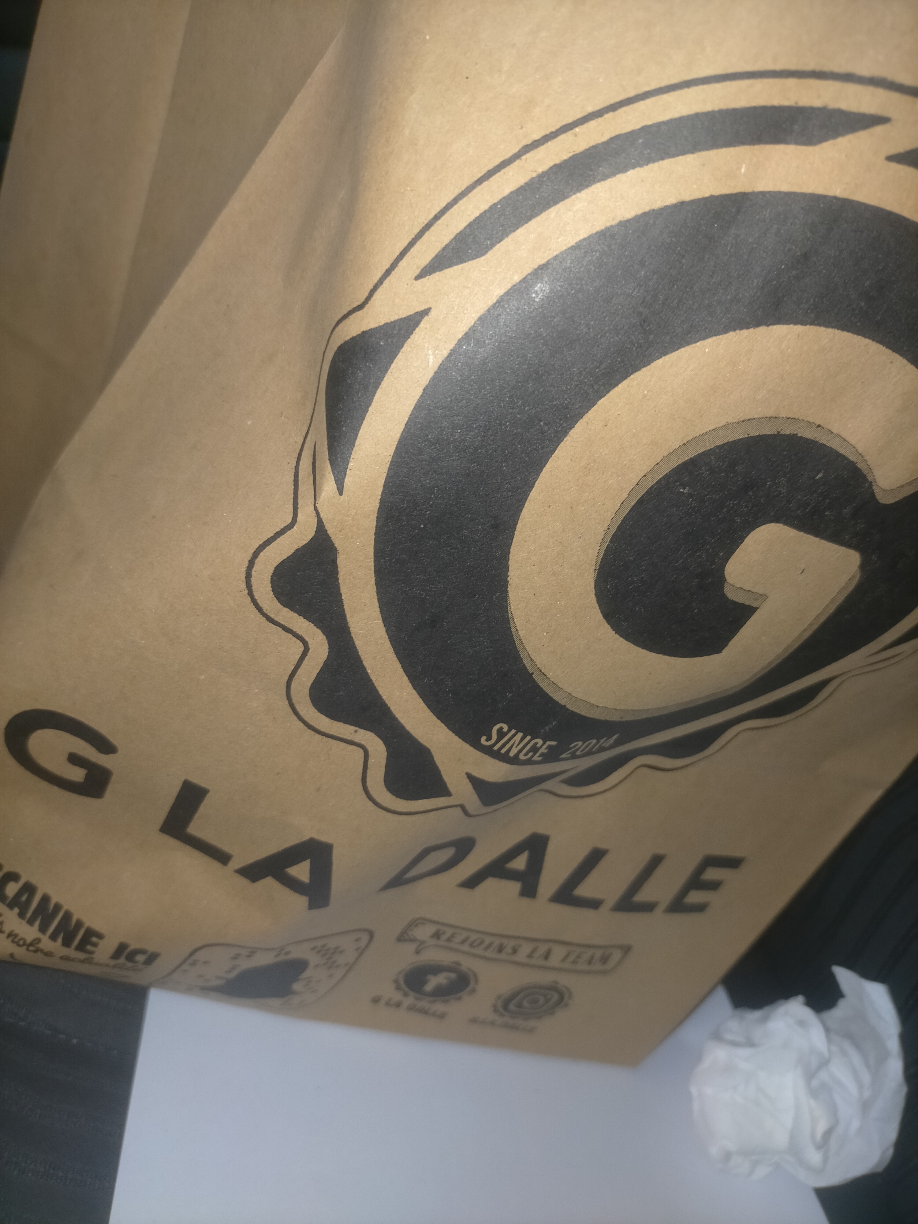 Nous avons décidé de tester G LA DALLE, premièrement dès que l’on rentre dans le restaurant on voit et comprend l’ambiance qu’il y a… Nous avons été servis plutôt dans les temps, mais il manquait un burger qui nous a été donné par la suite (nous avons tout de même eu une canette en plus ainsi que des frites), un burger était froid, les nuggets de poulet molles et mousseuses, les chilli cheese très écœurants. Au final nous avons mangé en ayant l’impression d’être dans le kebab du coin plutôt que dans un fast food. Je recommande un bon macdo quitte à manger un fast food.