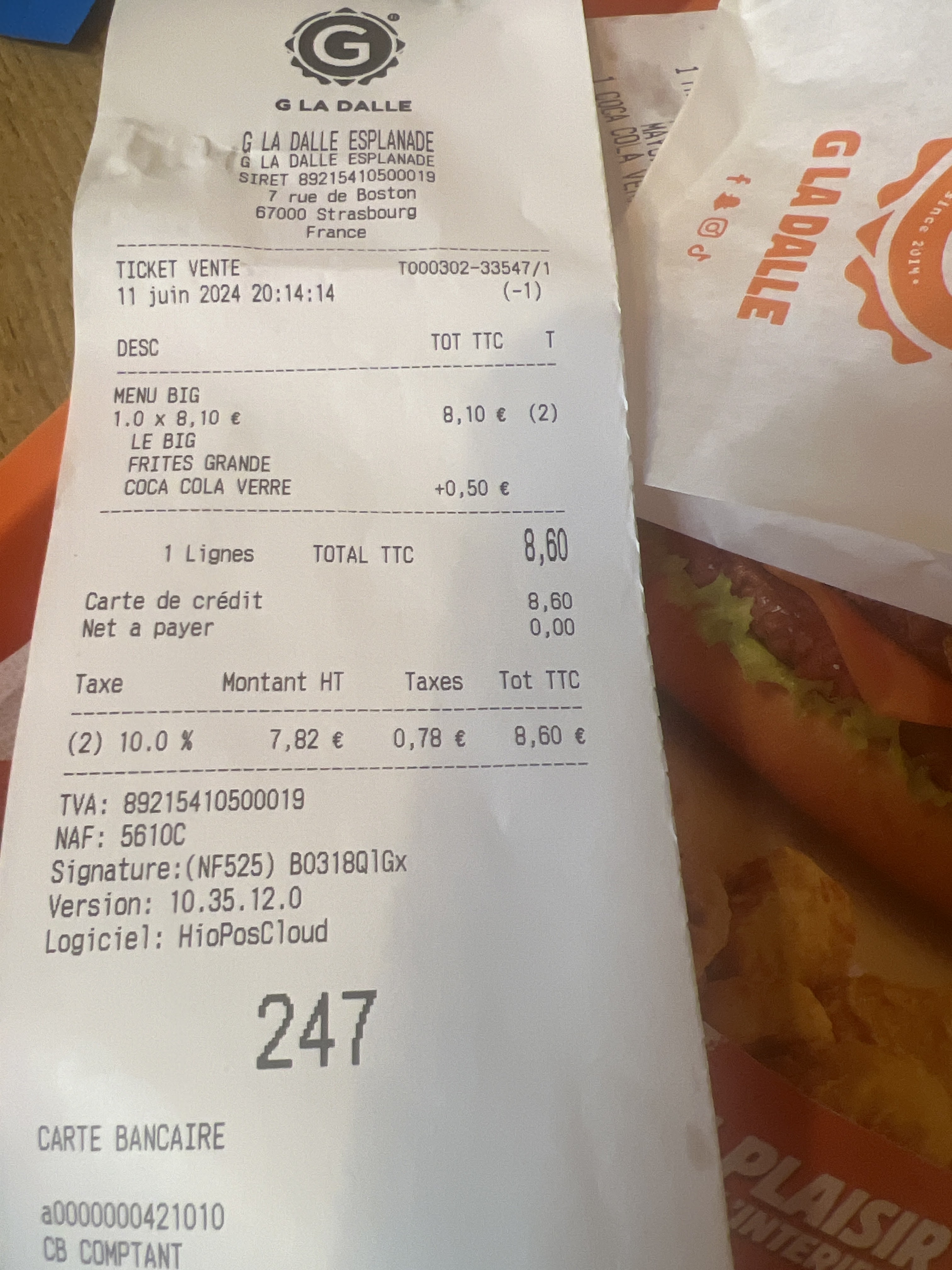 J'ai commandé le 25/01/2022 G la dalle c'est pas un truc fou! 2 cheeseburger sans goût! Des morceaux de frites ! Bref nul nul nul Ah ouai j'ai demandé un tropico en verre je reçois un fanta orange 🤦🏽♂️ Je préfère un bon sandwich kefta maison que votre arnaque !