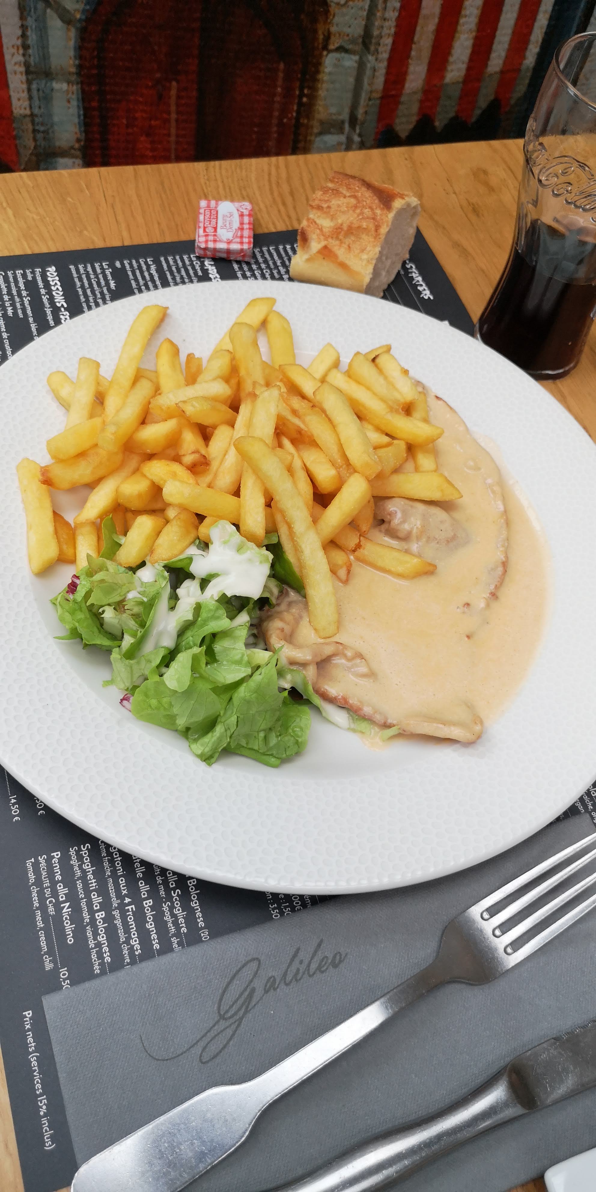 La pâte de la pizza était très bonne mais pourquoi mettre un hachis de jambon trop copieux et par contre pas assez de fromage pour la mousse au chocolat je fais mieux. Déçue 😞. J'ai déjà mangé au galiléo c'était bon. Donc bof pour les pizzas. Repas du 08/10/23 escalope bolognause très moyen, manque de certains produits,bonne crème brûlée. Mon mari a pris un whisky 4cl mais plus 2cl pour 7 euros. Noté pour 2 personnes 101 euros je trouve ça assez cher.