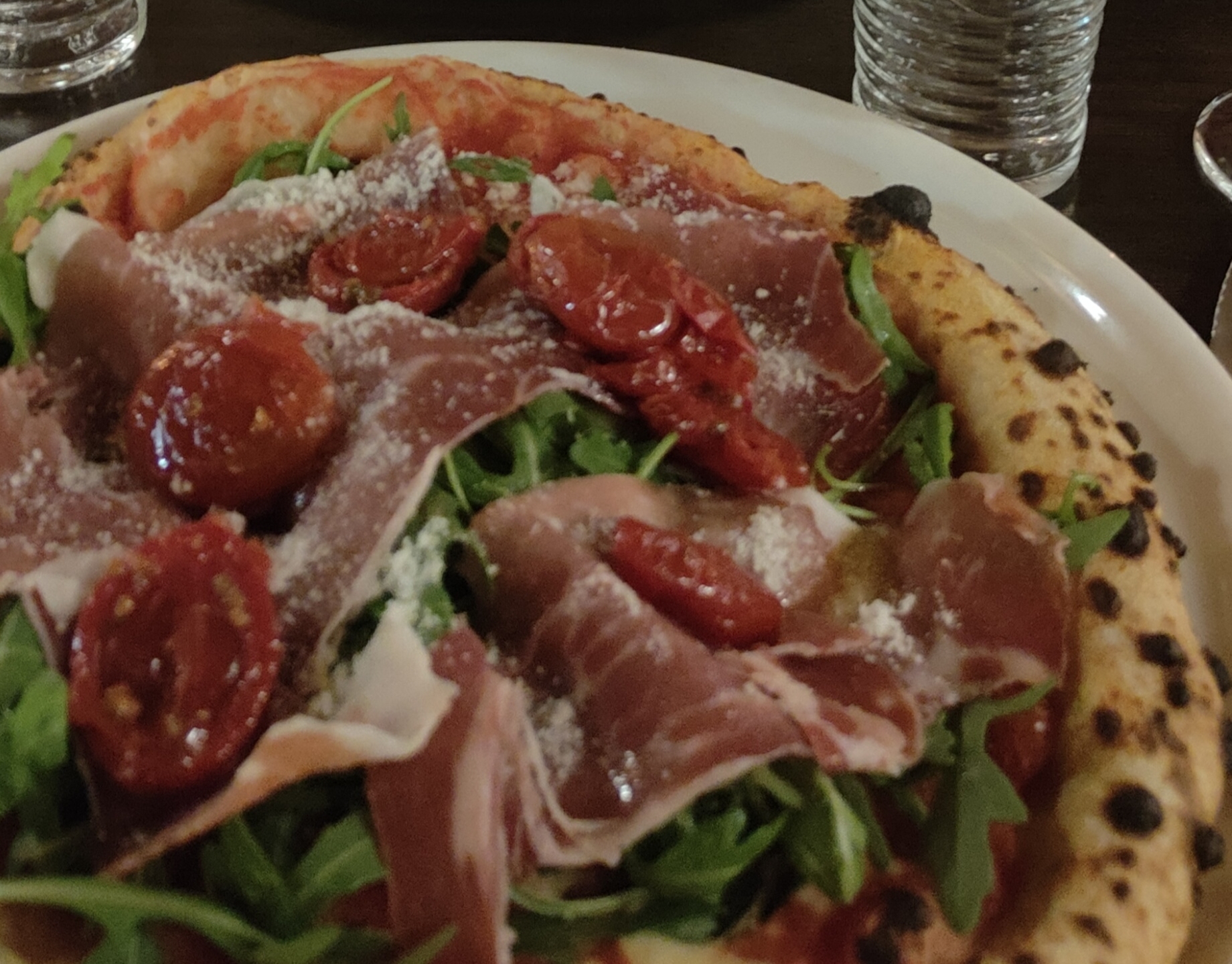 Pizza parmesane avec la roquette cuite la mozzarella en bille fondu déçus en plus pas grand chose sur la pizza