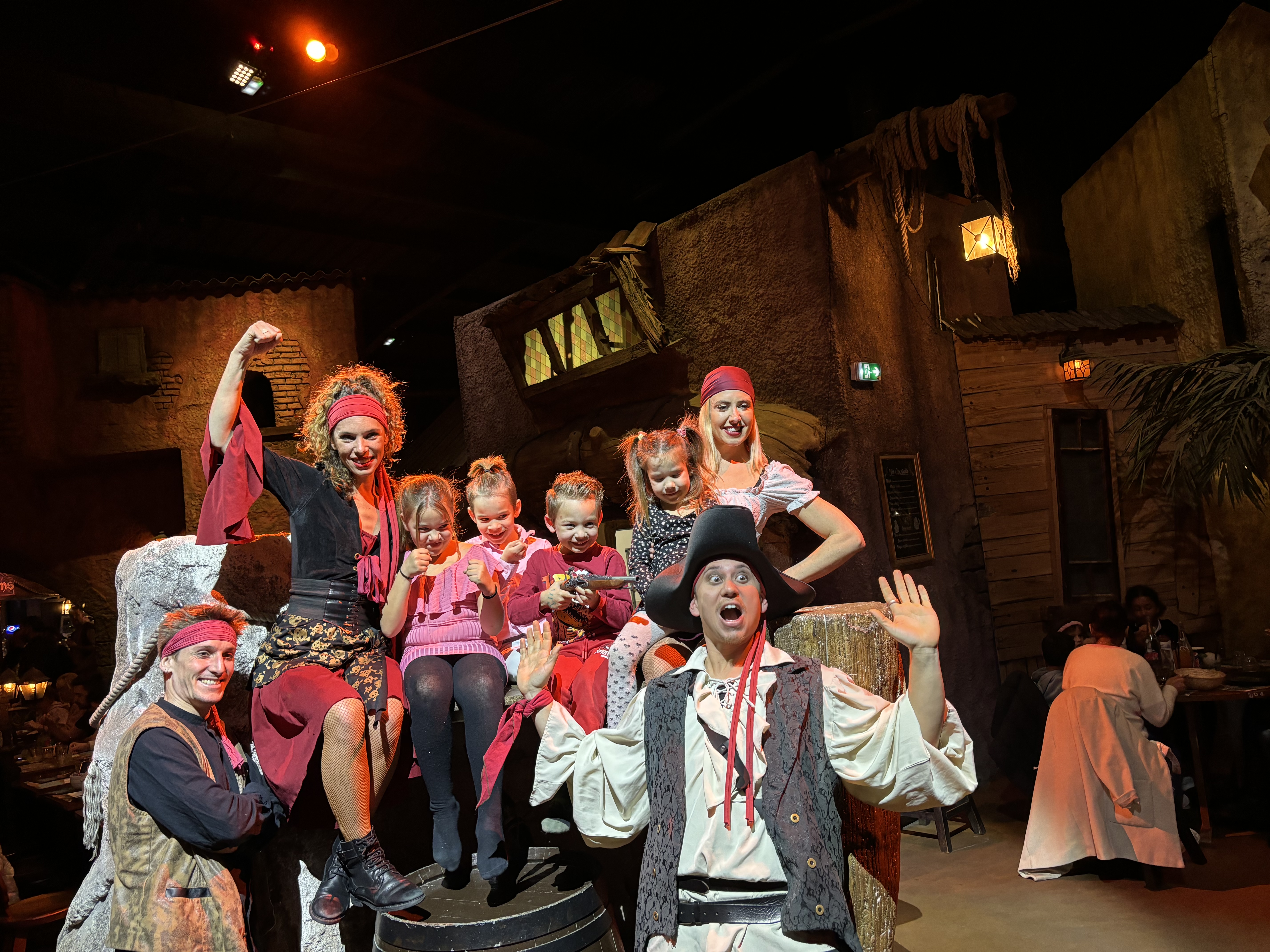 Superbe expérience ! Le cadre est sublime, la mise en scène vraiment bien exécuté par les personnes y travaillant. Air de jeux, rencontre photo, boutique, passage des pirates à table et un spectacle magnifique en prime. La nourriture est de qualité ! Il n'y a par contre aucun plat à la carte et c'est bien dommage (obligation de prendre un menu avec soit 1 entrée ou 1 dessert) Prix excessif, des suppléments de partout mais je vous recommande de tester l'endroit au moins 1 fois malgré tout, ca vaut vraiment le detour : 30 euros adulte 12 euros enfant :)