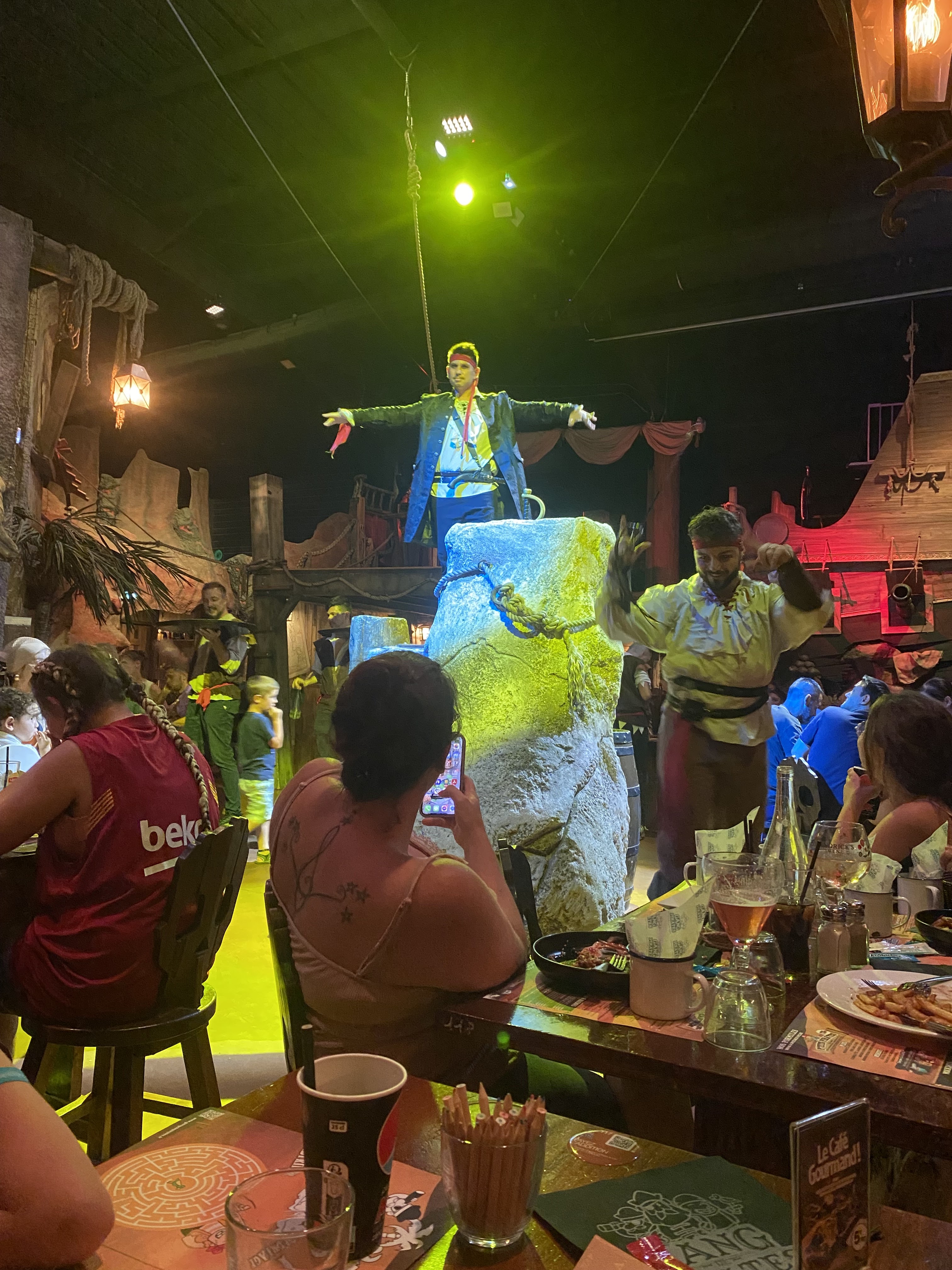 Nous sommes venus avec des enfants (jumeaux 2 ans et aînée 6 ans) et de la famille le 30 avril 2024. Des restaurants comme il en existe plus. Un coin jeu pour les enfants, un décor magnifique digne des attractions Disney, même les tables vaiselles et carte des vins sont dans le thème. Un spectacle qui dure presque 30 mn. Des serveurs qui sont supers attentionnés, les intermittents ont toujours une attention pour les clients : ils sont venus plusieurs fois à notre table faire les pirates. Petits et grands on en prend pleins les yeux. Le repas est copieux et bon. Le prix reste abordable entrée plat dessert 29,99 € avec au moins 4 à 5 choix différents sur chaque. Formule enfant 14,99 € plat dessert et une boisson. Et petit plus pour la directrice qui a pris notre fille sous son aile durant tout un spectacle pour la mettre à l'aise et la faire voyager. Sans compter l'ambiance, les anniversaires qui ont eu lieu (5 ce soir là où tout le monde chantent, même nous les clients). L'accueil top. Vraiment rien à dire je le recommande à 2000 % et on reviendra à nos prochaines vacances. RÉSERVATION FORTEMENT CONSEILLÉE pour ce restaurant prisé. Merci à tous à bientôt. Touristes du département 36