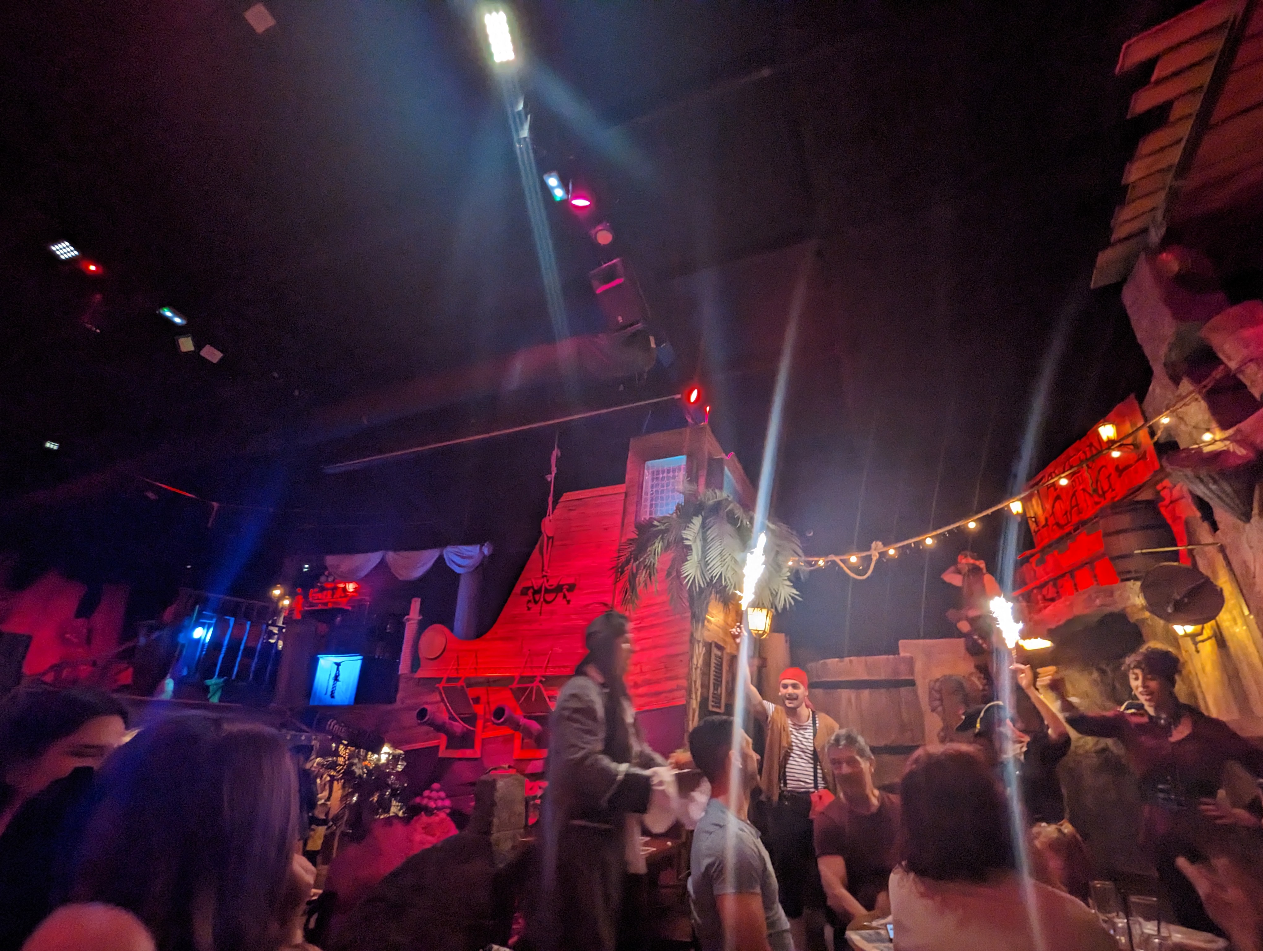 Ambiance pirate garantie des l’entrée, un vrai décor de cinéma ! ( les toilettes sont une vraie réplique de cabine on se penserait parti en mer) Le personnel est charmant et tout à fait dans son rôle, la nourriture est copieuse et délicieuse, le prix est correct vu la qualité. Le spectacle est très réussi, drôle et plein de surprises. J’y retournerai sans hésiter et je recommande chaudement.