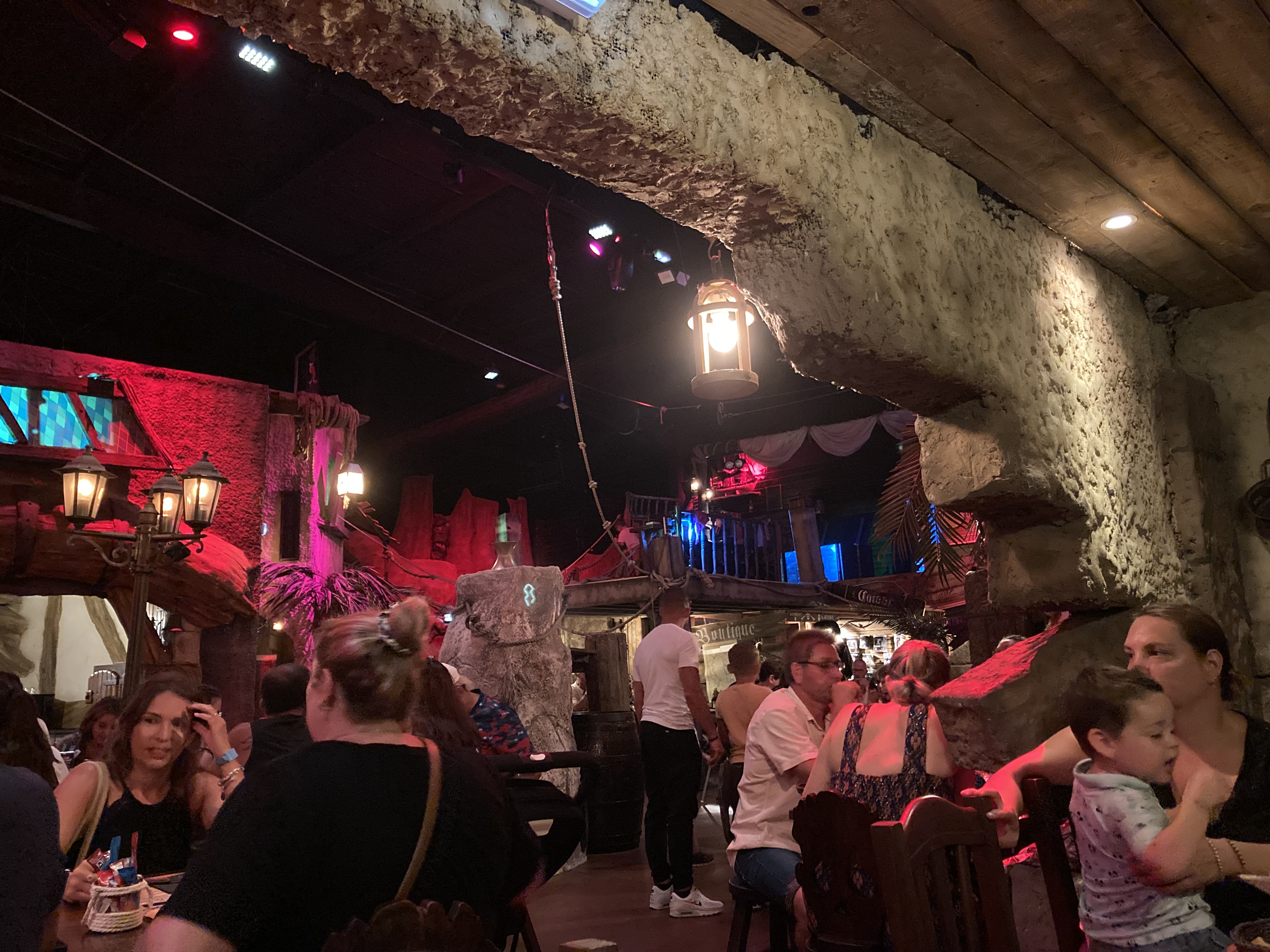 Ambiance pirate garantie, Décoration digne de Disney. Repas copieux nous avons pris le menu plat dessert burger barbe noir et coupe voleur Dame. (Spécial halloween). Spectacle bien ficelé et service souriant. Un très bon moment passé en famille. Niveau prix un peut chère mais le cadre, le spectacle et l'ambiance valent le coup😉