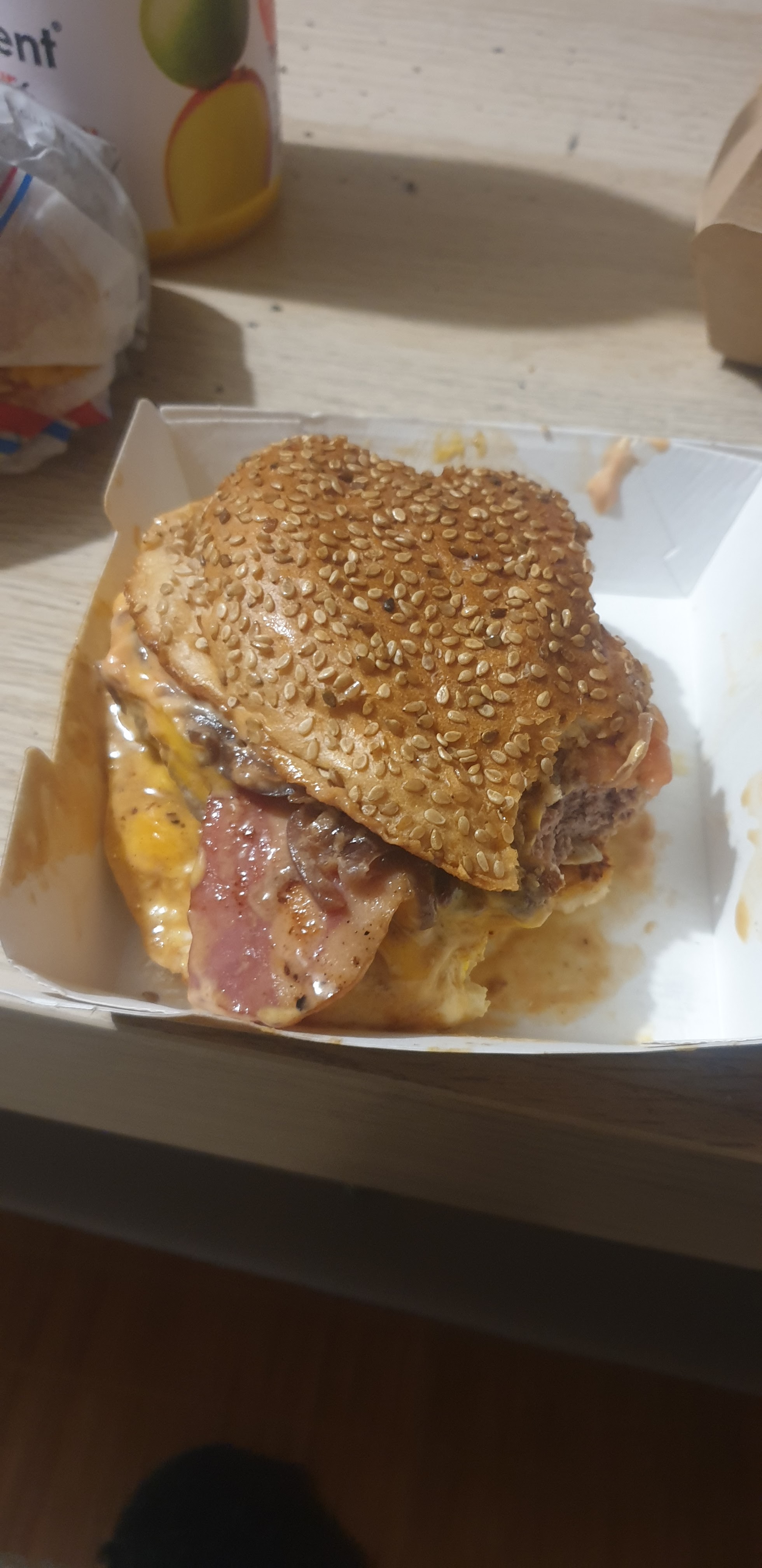 Jai commander un double cheese Je vois que dans les commentaire il y a deja eu une reproche sur les emballage. Apparament sa na pas ete rectifier car jai eu le meme probleme!! Mise apar les frite qui eont bonne le reste est a revoir vous mettez beaucoup de sauce et/ou fromage pour masquer que la viande est extra sec! L oeuf hyper cuit aucun interet et ne mettre qu'une miserable pauvre feuille de salade (conseil couper la cest plus agreable en bouche) avec une seul tranche de tomate.. j ai du retirer une tranche de viande tellement c etait sec et ecoeurant, meme comme sa je ne le finis pas impossible. Et pour le prix je mattendais a de la viande fraiche et un burger de qualiter. malheuresement le mcdo fait mieu que vous. Je ne vous recommanderai a personne de mon entourages