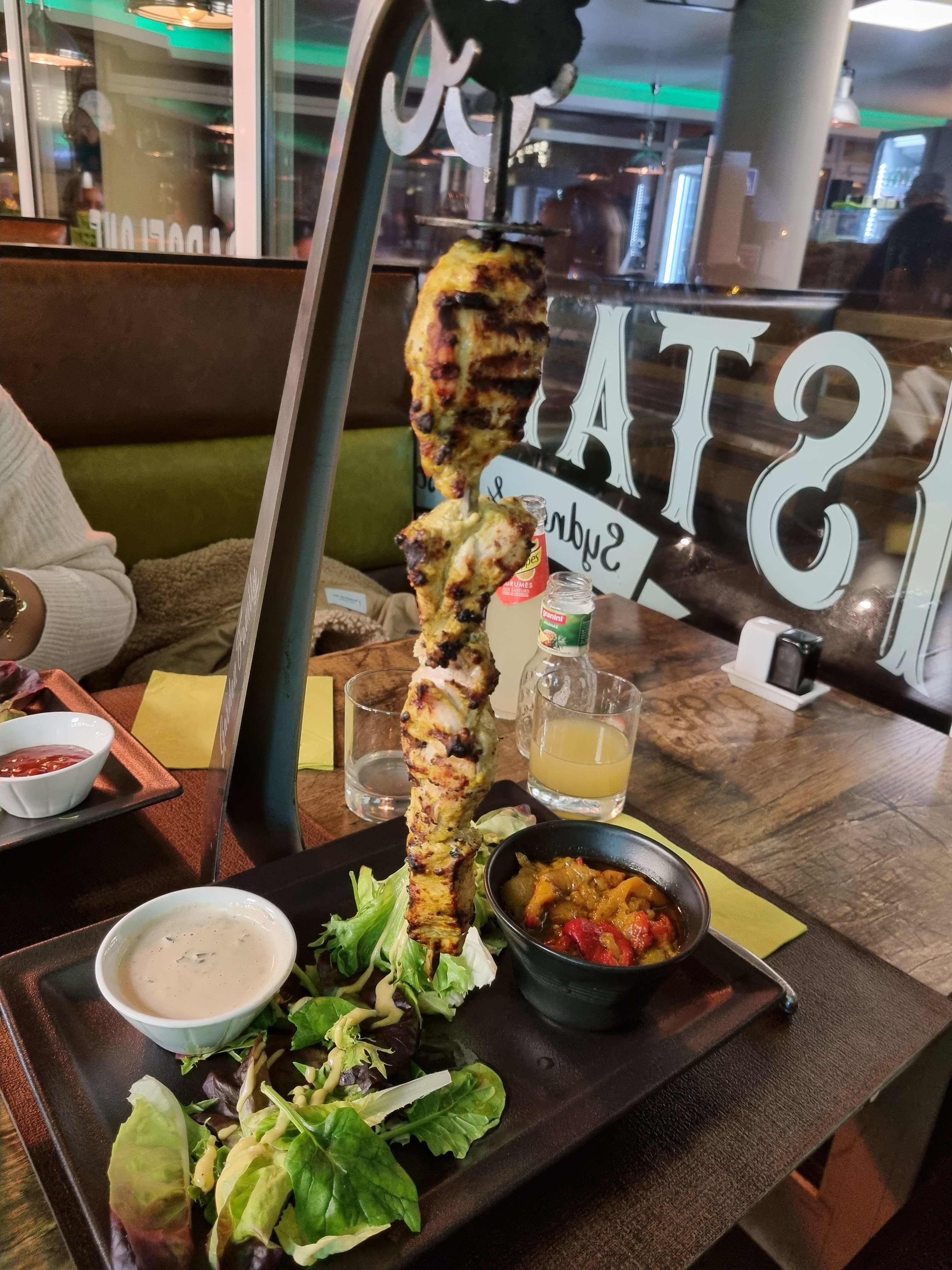 Établissement plutôt joli, propre et confortable. Personnel souriant et efficace. Service rapide. Les plats sont visuellement impressionnant, les brochettes suspendues font leur effet. La viande est de plutôt bonne qualité et la cuisson conforme aux demandes. Le problème pour moi venait plus de l'assaisonnement, je dirais pas fade mais... plutôt plat décevant. Mais ça semble varier selon le choix effectué, la brochette de poulet simple était excellente. La brochette de boeuf, les autres variantes de brochette poulet, les sauces... Il manquait quelque chose, un peu de peps... C'est dommage. Enfin, au vu de l'ensemble je trouve les tarifs un poil trop élevés. Néanmoins on reste tout de même dans du raisonnable. Bref c'est sympa, ça vaut le coup d'y faire un saut au moins une fois. Mais personnellement je ne reviendrai pas un client régulier.