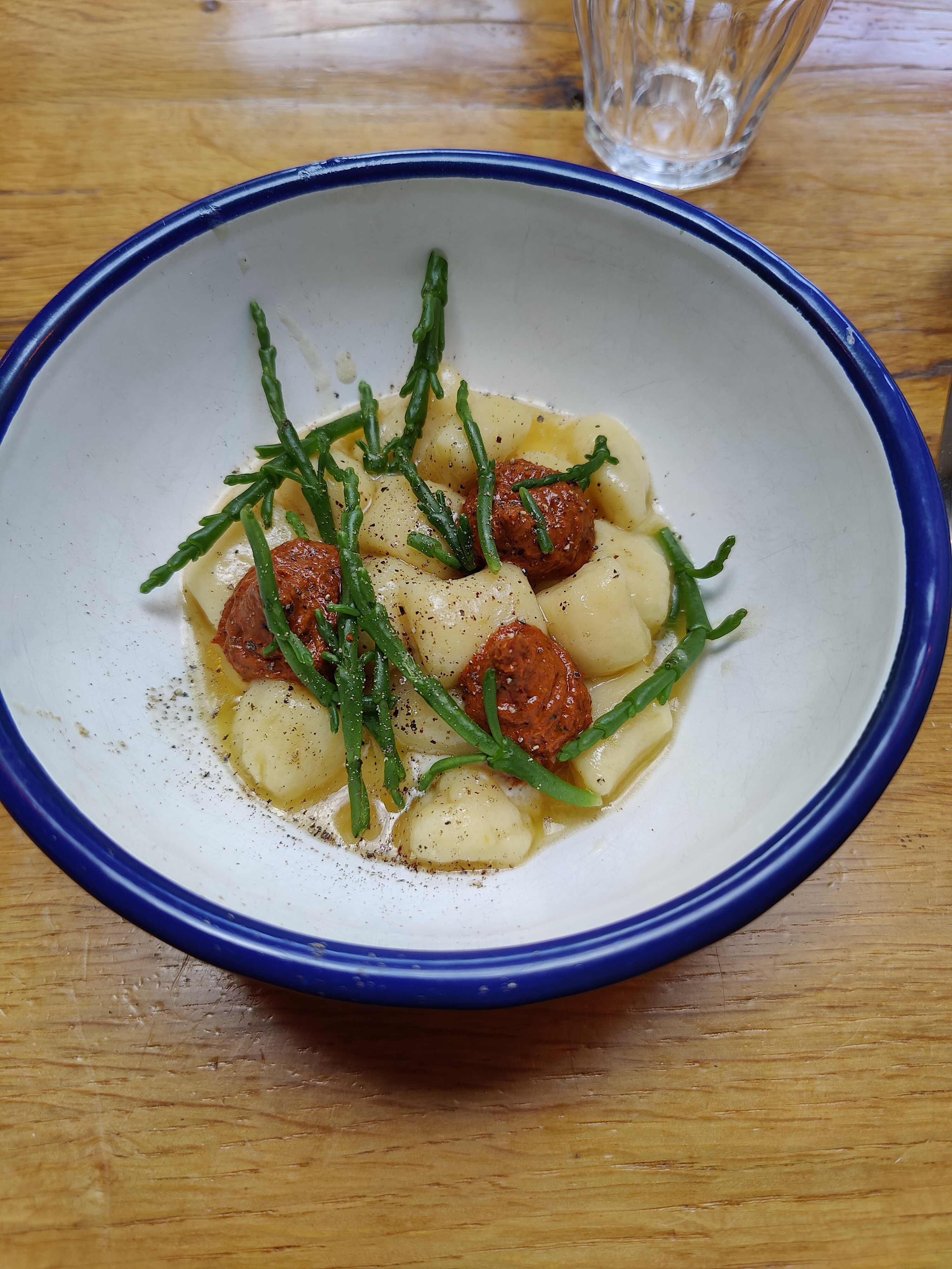 Nous avons partagé 4 tapas délicieux et surprenants, c'est donc une cuisine impeccable et innovante, tellement précieux et rare qu'il faut le souligner. Accueil très sympa et conseils avisés (sauf sur la quantité conseillée, on peut minimiser), vin rosé nature qui apporte une autre découverte délicieuse, bref je recommande chaudement cette adresse impeccable. un peu cher mais la créativité et la qualité compensent
