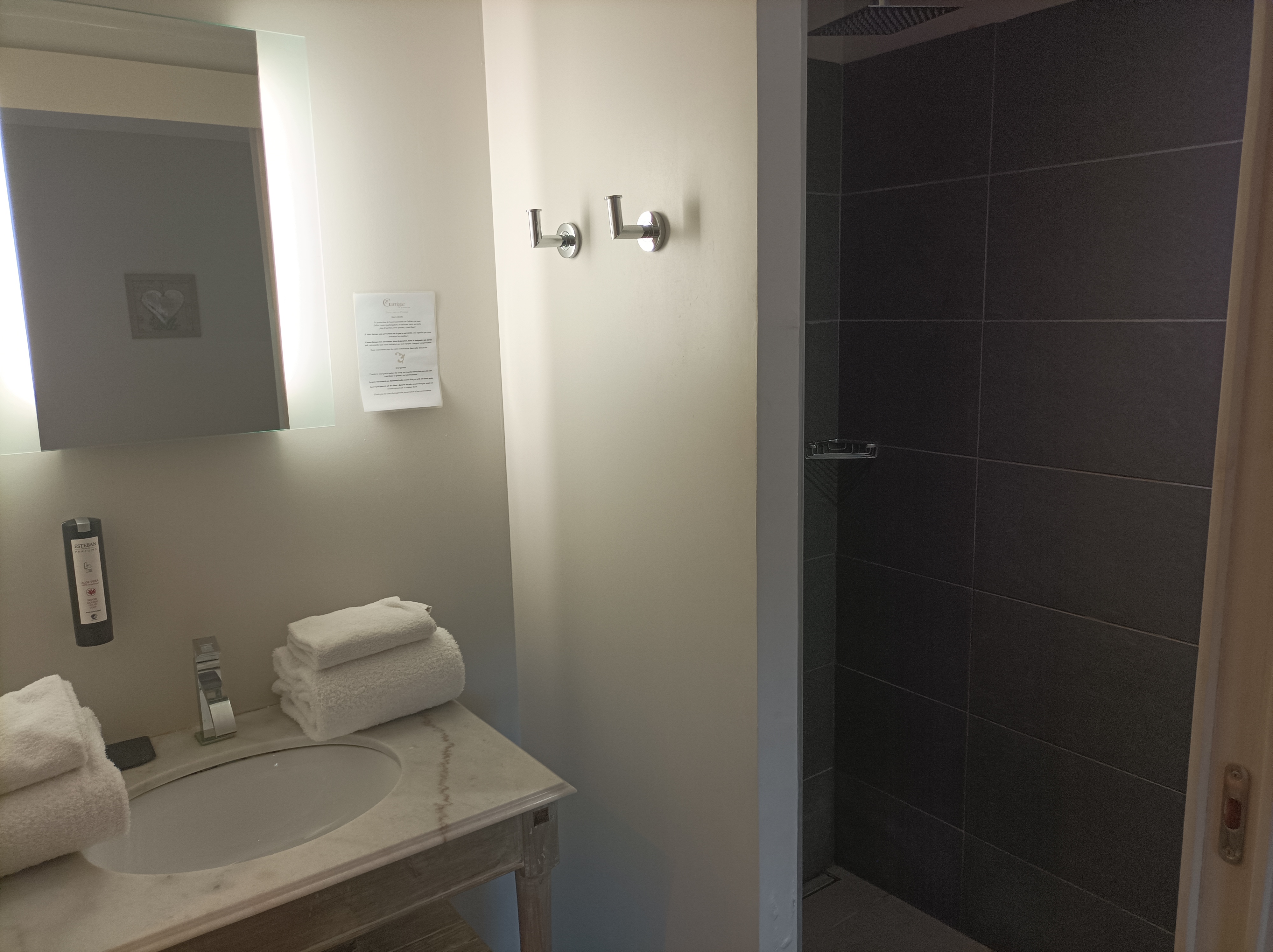 L'établissement est très bien et le service impeccable. La chambre est très belle, mais, la douche est tellement petite que je ne pouvais pas me tourner. Je pense qu'une chambre à ce prix et de ce standing ne peut pas se permettre d'avoir un couvercle de poubelle de salle de bain cassé. Une seule petite bouteille d'eau pour 2 et surtout, pas remplacée lors du nettoyage de la chambre. L'eau du robinet de la cuisine a une couleur savonneuse. Il y a a une petite cuisine, mais 2 verres, 2 tasses et basta. Une bouilloire est présente, mais il n'y a que du café, aucun thé ou tisane. Lorsque nous sommes arrivé à la chambre, nous sommes restés coincés devant la porte car la carte n'était pas enregistrée. Les peignoirs et chaussons n'étaient pas présent dans la chambre. La télévision est trop petite par rapport au recul jusqu'au lit ou au canapé. Dommage qu'il n'y ai pas de rideaux aux fenêtres car elles donnent sur les terrasses voisines. Le repas du restaurant est bien trop cher par rapport à la qualité et la quantité des assiettes. L'espace spa est sympa, mais l'ouvrir au personnes extérieures n'est pas une bonne idée compte tenu de sa taille. Il est vite plein, bruyant et il faut attendre. Le parking est trop petit, le samedi, nous n'avions pas de place où nous garer. Le petit déjeuner est bien et le lieu très agréable. L'ambiance générale est bonne, dommage que toutes ces petites choses misent bout à bout gâche un peu le plaisir et la plénitude. Quoiqu'il en soit, le personnel est vraiment très agréable et serviable.