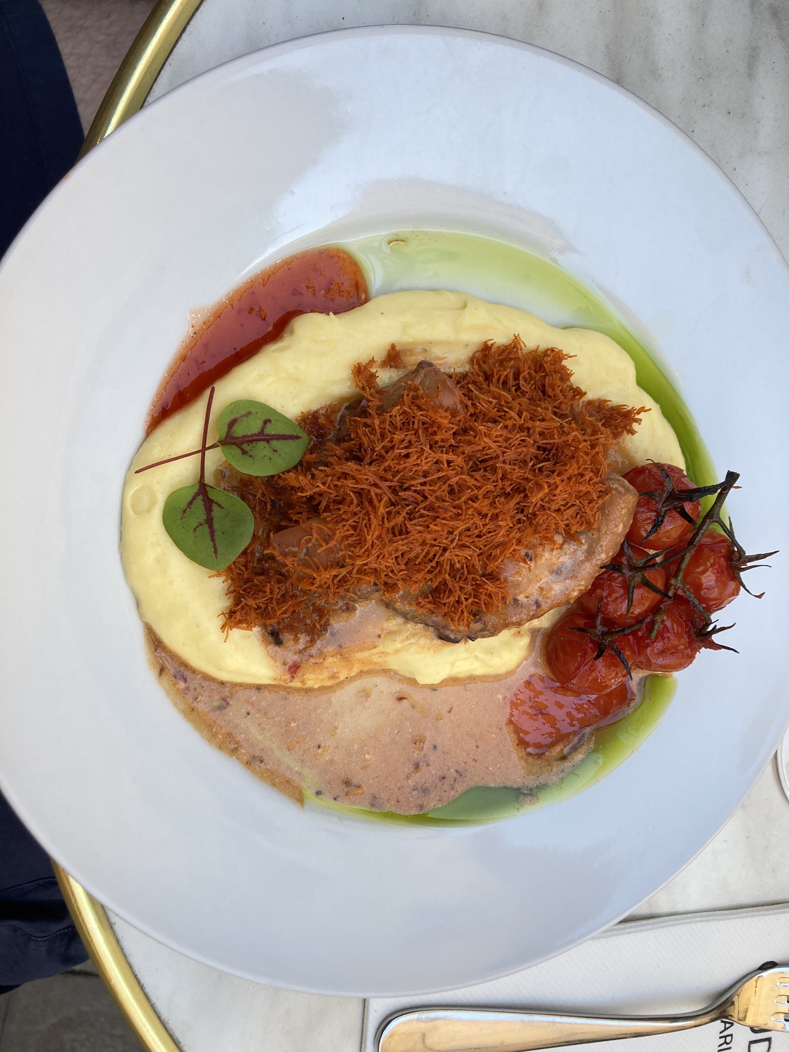 C'était sur la liste des recommandations de notre guide local, et cela s'est avéré génial ! J'ai pris une salade de taboulé aux lentilles en entrée, mais je ne suis pas sûr que taboulé soit le bon mot, car c'est assez original, avec de la coriandre et de la grenade, et bien plus encore. J'ai adoré et je dois me souvenir des ingrédients pour un délicieux panier-repas au travail. Ensuite, le médaillon d’agneau était surnaturel ! Il semblait contenir un mélange d'épices d'inspiration orientale, quelque chose que je reconnaissais mais que je ne pouvais pas nommer, alors j'ai passé chaque délicieuse bouchée à essayer de le comprendre. Ma meilleure hypothèse était quelque chose de similaire au ras el hanout, la serveuse a dit citrons, gingembre et coriandre, mais je suis presque sûr que ce n'était pas tout. Ce n'est donc pas un restaurant pour ceux qui recherchent des plats français « traditionnels », mais essayez-le si vous êtes heureux d'expérimenter des goûts originaux !