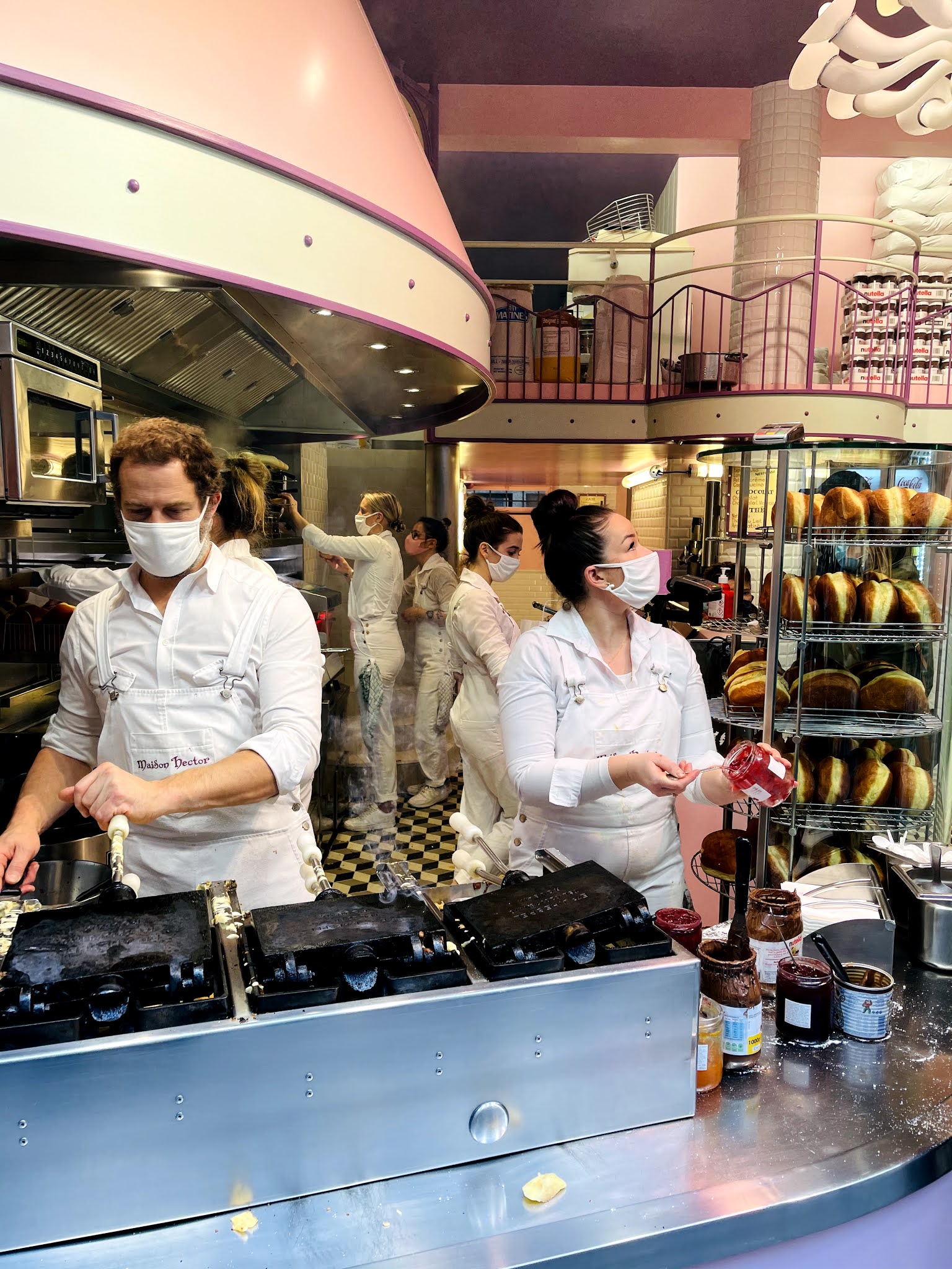 Les gaufres les baigner surtout celui à la framboise je le recommande Les sandwiches américains aussi Ras Les filles sont très charmante dans la salopette blanche 😂😂