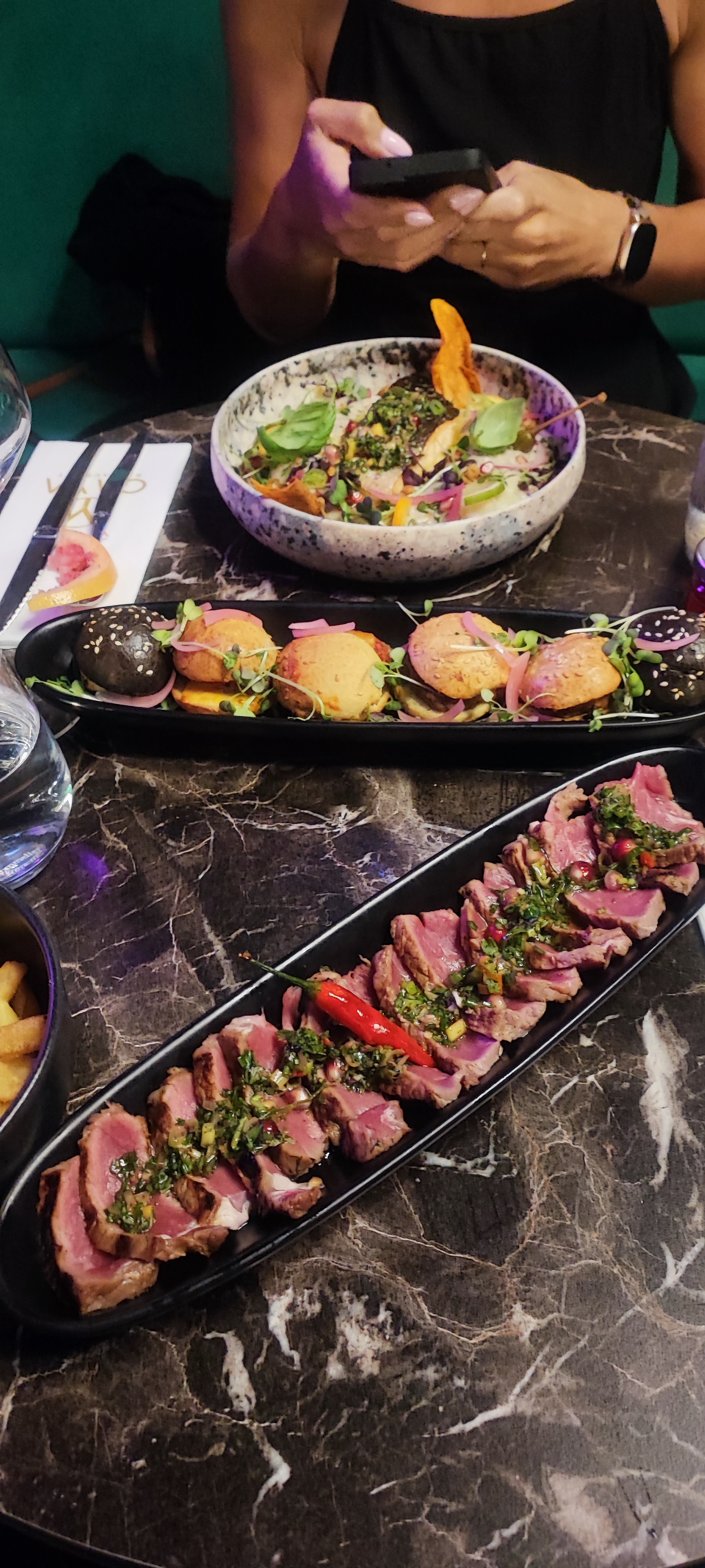 L’ambiance est très sympa, le concept des danseuses également et très jolie deco. En revanche la nourriture et le service à revoir absolument. La burrata est bonne mais 20 min d attente pour avoir du pain et du sel. Si on peut appeler ça des frites, huileuses et froides, viande sèche froide et trop cuite, quant à la présentation de l’assiette la photo parle d elle même ! Quand on paye le menu 60€ sans boisson, on s’attend quand même à voir autre chose ! Revoyez la qualité avant de pratiquer ces tarifs. On est mieux servi dans des snacks.