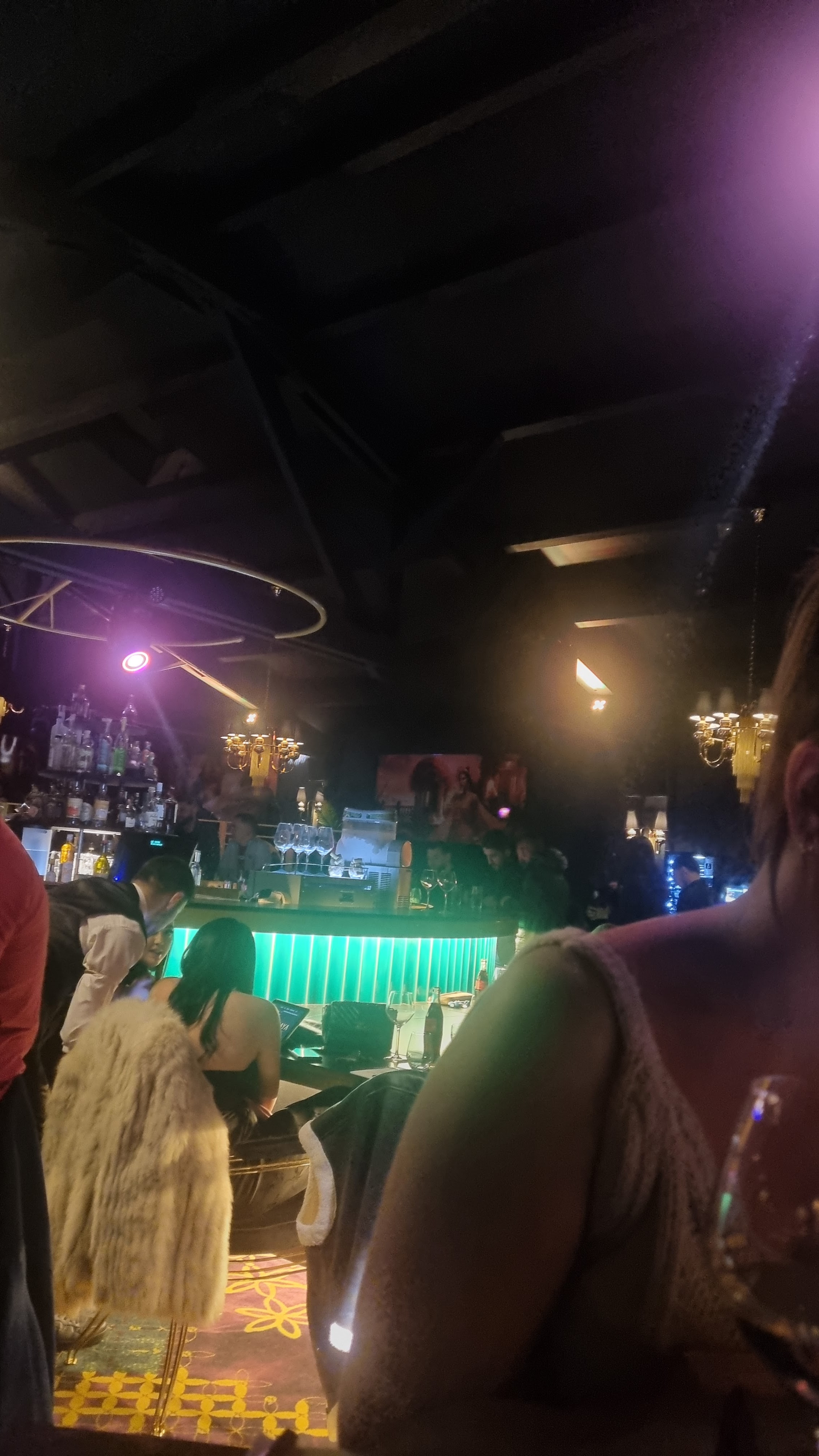Nous étions une table de 11 personnes, nous sommes arrivés à 21h30 et avons attendu 1h30 pour commencer l’entrée sans boisson. J’écris ce message à 1h15 qui est l’heure du “dessert”. Un menu à 59€ avec un repas froid et je vous passe les détails. (J’ai faim) Je ramasse la veste d’un autre client comme une personne “normale” je me prend une réflexion du serveur disant : vous souhaitez faire mon travail ? Désolée d’être éduquée et ne souhaite marcher sur la veste de quelqu’un. Je ne recommande pas et n’y retournerais pas. Très dommage car en revanche l’ambiance est incroyable