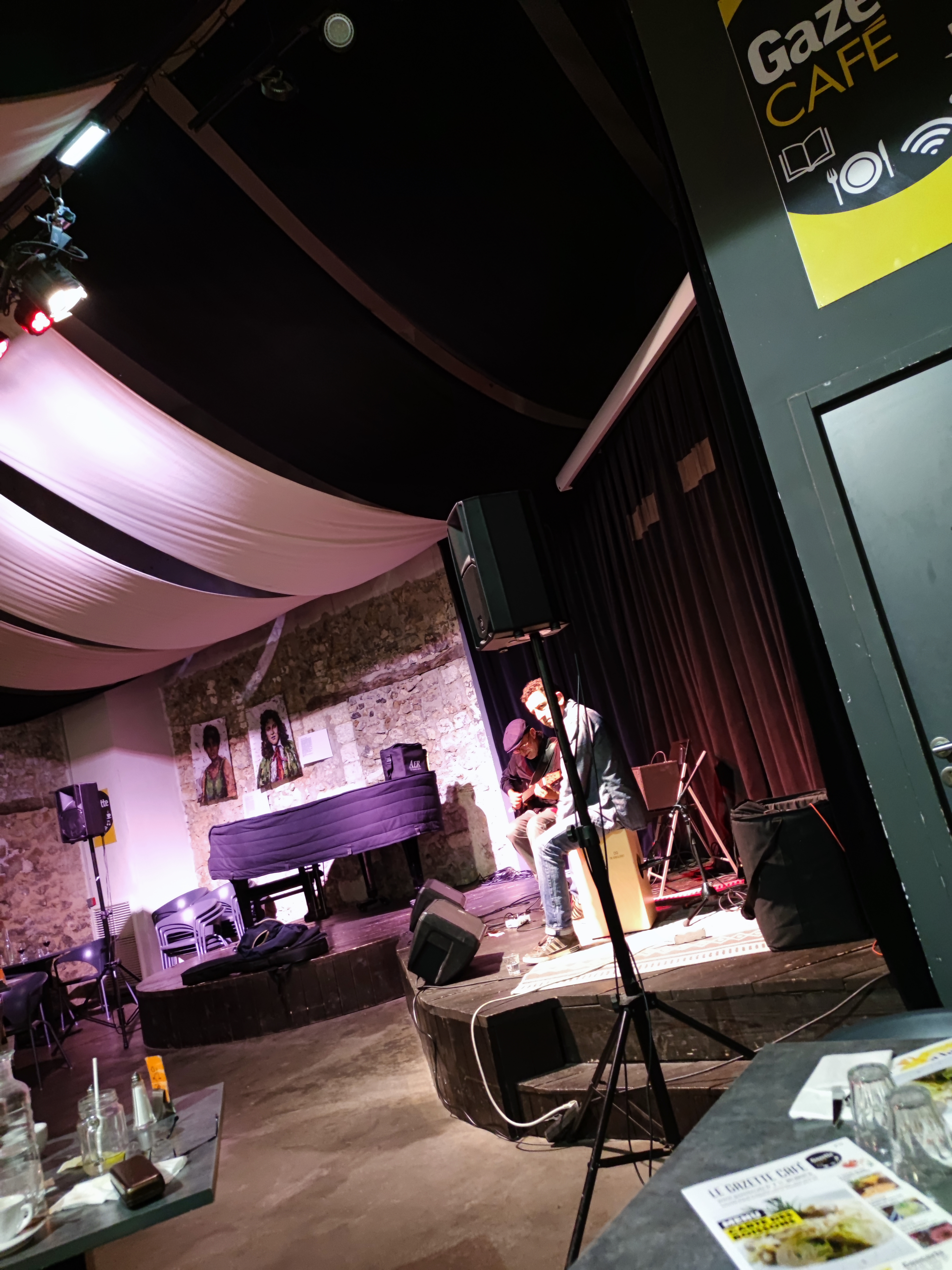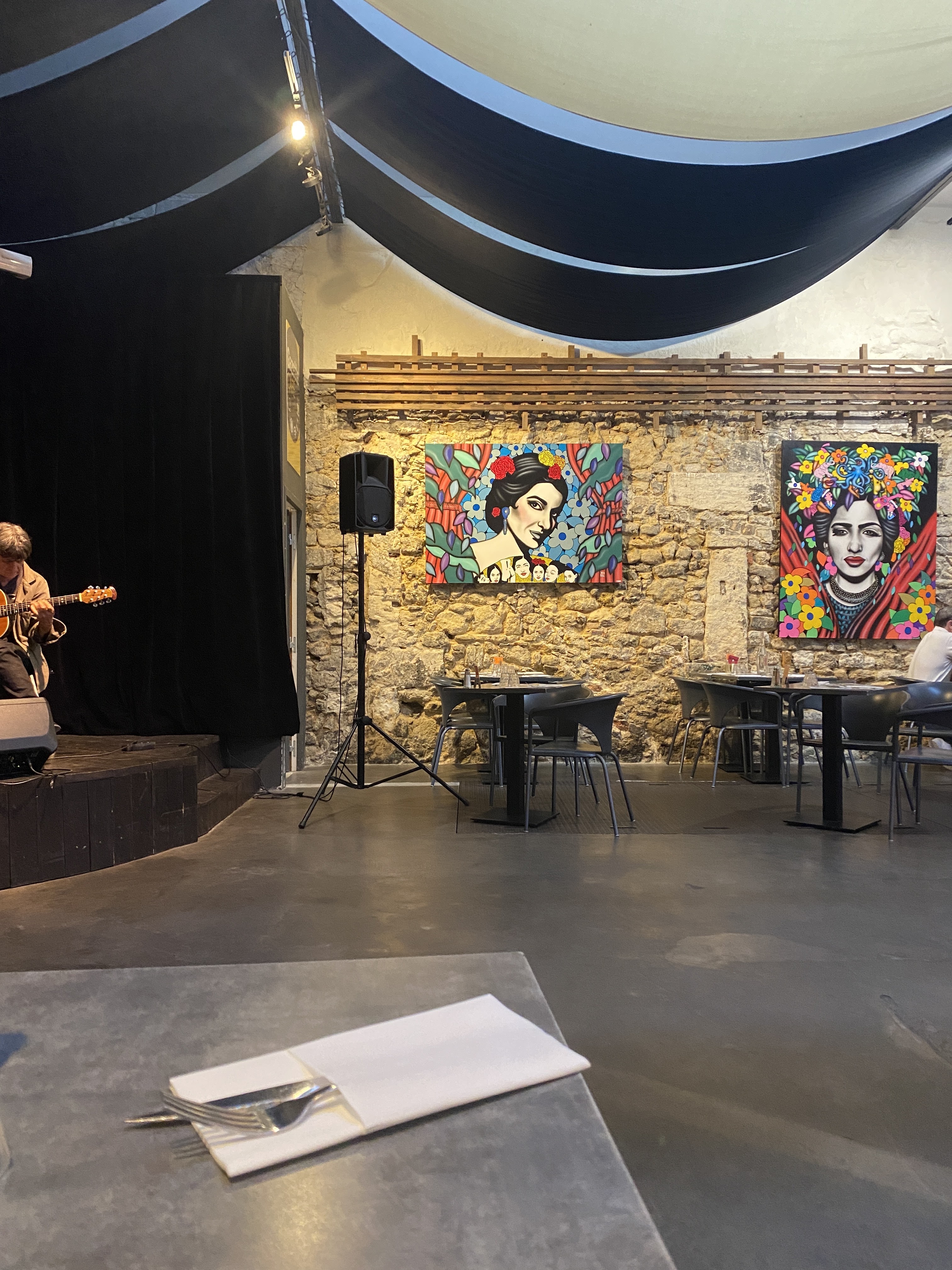 Un lieu très agréable. Une petite salle de conférence/concert privé. Puis une grande salle de restauration avec une scène pour artistes. Les tapas dégustés directement au bar étaient très bons et à un prix tout à fait correct