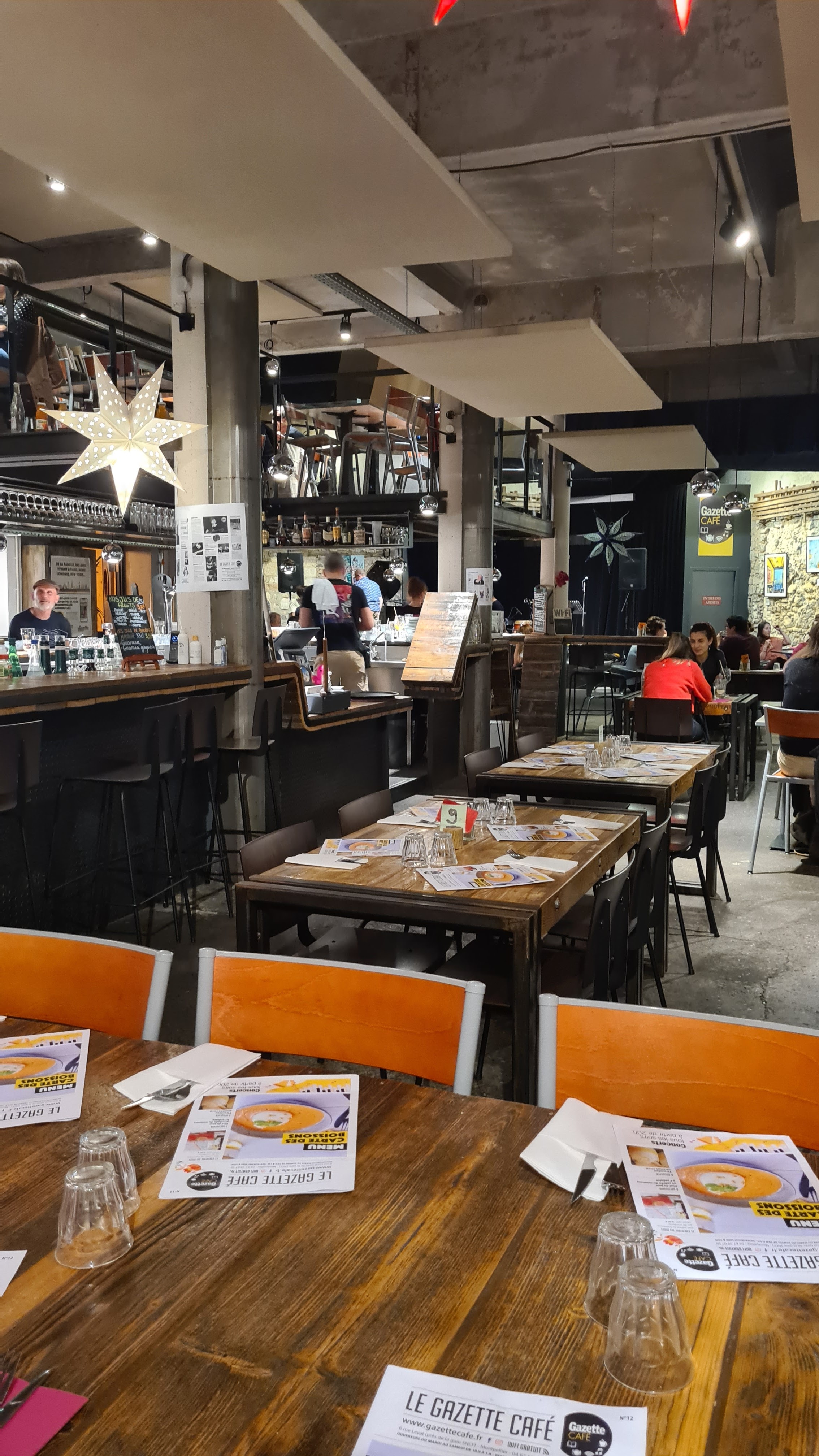 Lieu de rencontre et d'échange, à tout heure de la journée, une équipe agréable et souriante dans une ambiance détendue et populaire, La Gazette Café est vraiment incontournable à Montpellier. La cuisine est délicieuse et d'excellente qualité. Les cocktails sont originaux et préparés avec soin. Des événement (concerts, conférence , ...) sont organisés régulièrement et proposent une grande variété de styles et d'artistes. Si vous êtes de passage sur Montpellier, n'hésitez pas ! 😀