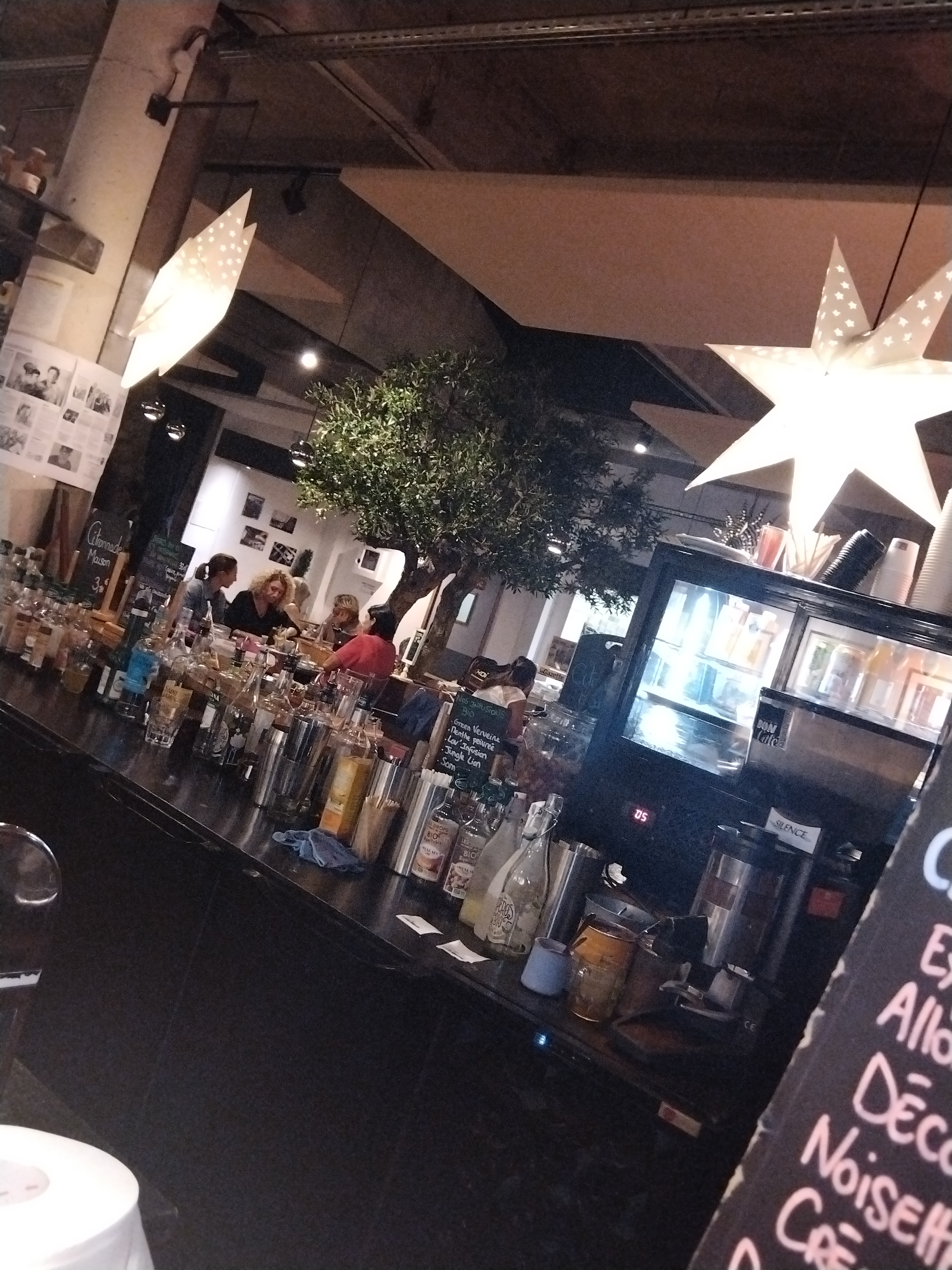Cadre style industriel sympa avec une salle plus calme et plus chaleureuse. Bons plats bios mais on aimerait retrouver la carte précédente plus variée. Conférences et soirées musicales très diversifiées (son un peu trop fort)