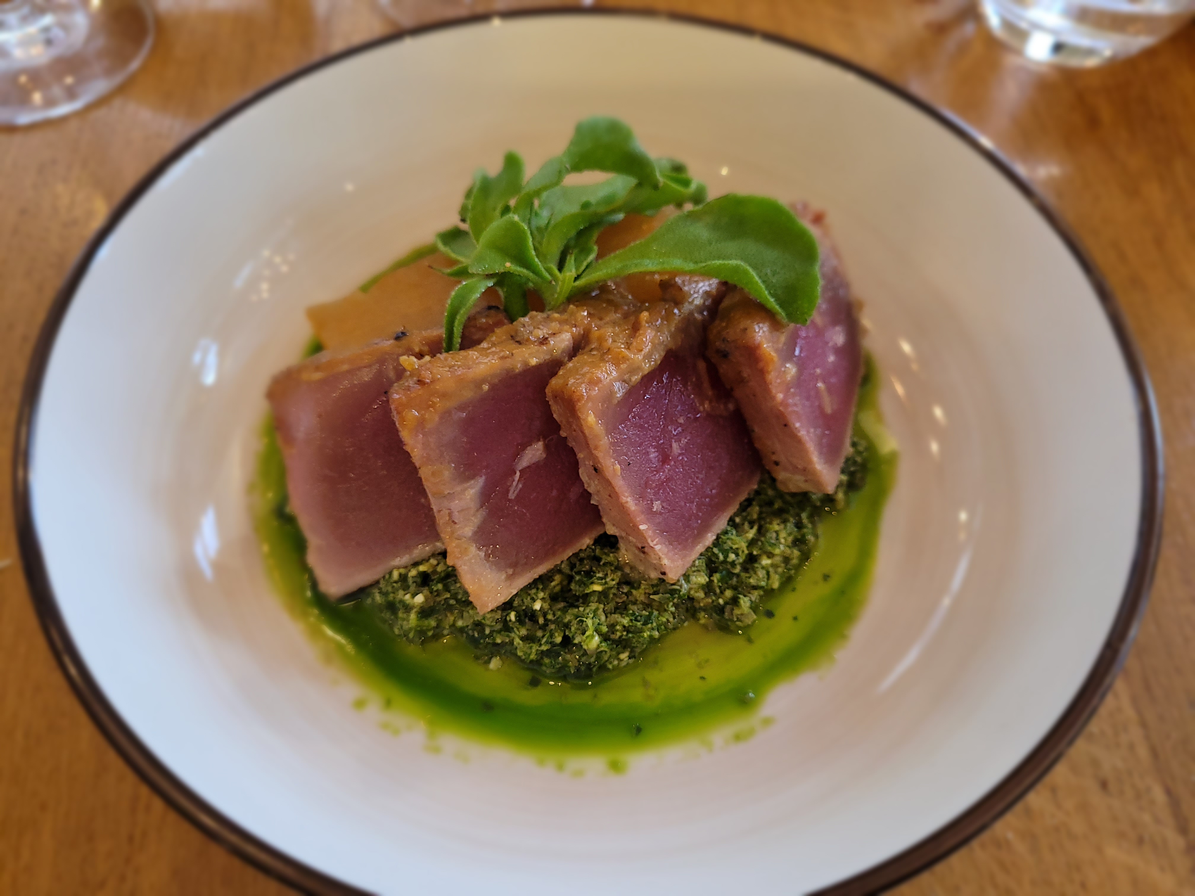 Service et cadre agréables. Bon vin blanc conseillé selon nos attentes. Un peu déçu par nos entrées et plats, plutôt simples en goût, manquant d’originalité et d’assaisonnement. Jolies présentations, bonne cuisson du thon, mais pas de l’œuf parfait.