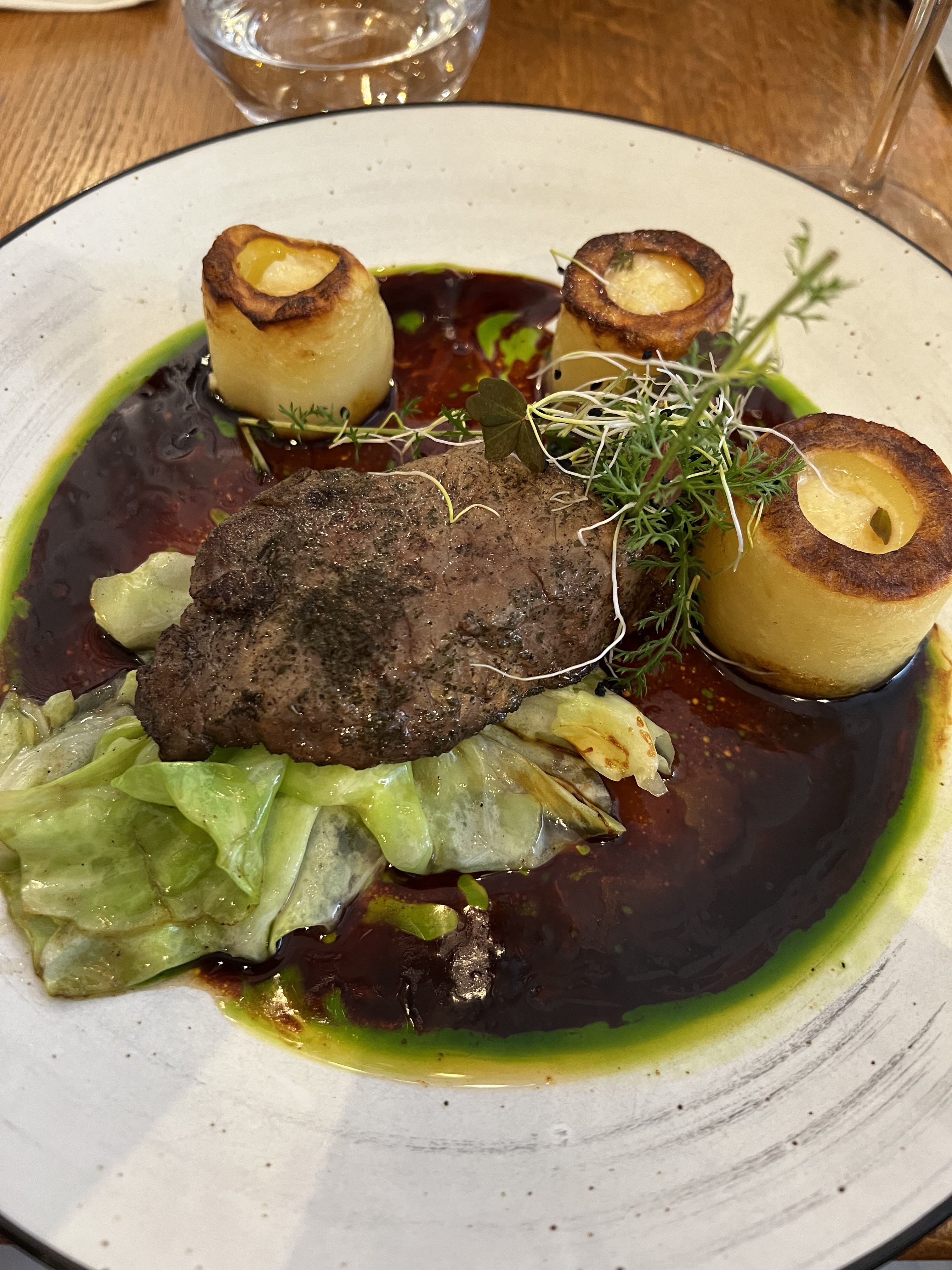 J‘ai adoré notre dîner chez Gegeor ! Les entrées étaient frais et goûteux, les plats joliment décorés et savoureux et les deux desserts qu’on a testé étaient simplement délicieux. On avait une entrée avec des asperges, comme c’est la saison maintenant, et du thon mi-cuit. Après, du veau avec une création de pommes de terre qui n’était pas seulement beau mais très très bon - particulièrement la sauce ! Et le moelleux au chocolat et le riz au lait comme dessert avaient un twist intéressant et délicieux. Mon copain a pris un verre de vin blanc qu’il a beaucoup apprécié. En plus, les serveurs étaient super gentils et attentionnés. L’ambiance était décontractée et sympa. Je suis enceinte et ils savaient directement de ce que je parlais - et en plus, presque tout était pasteurisé. Alors j’ai eu un plus grand choix que dans la plupart des restaurants qu’on s’est fait ce dernier temps. Mille mercis, on va revenir !