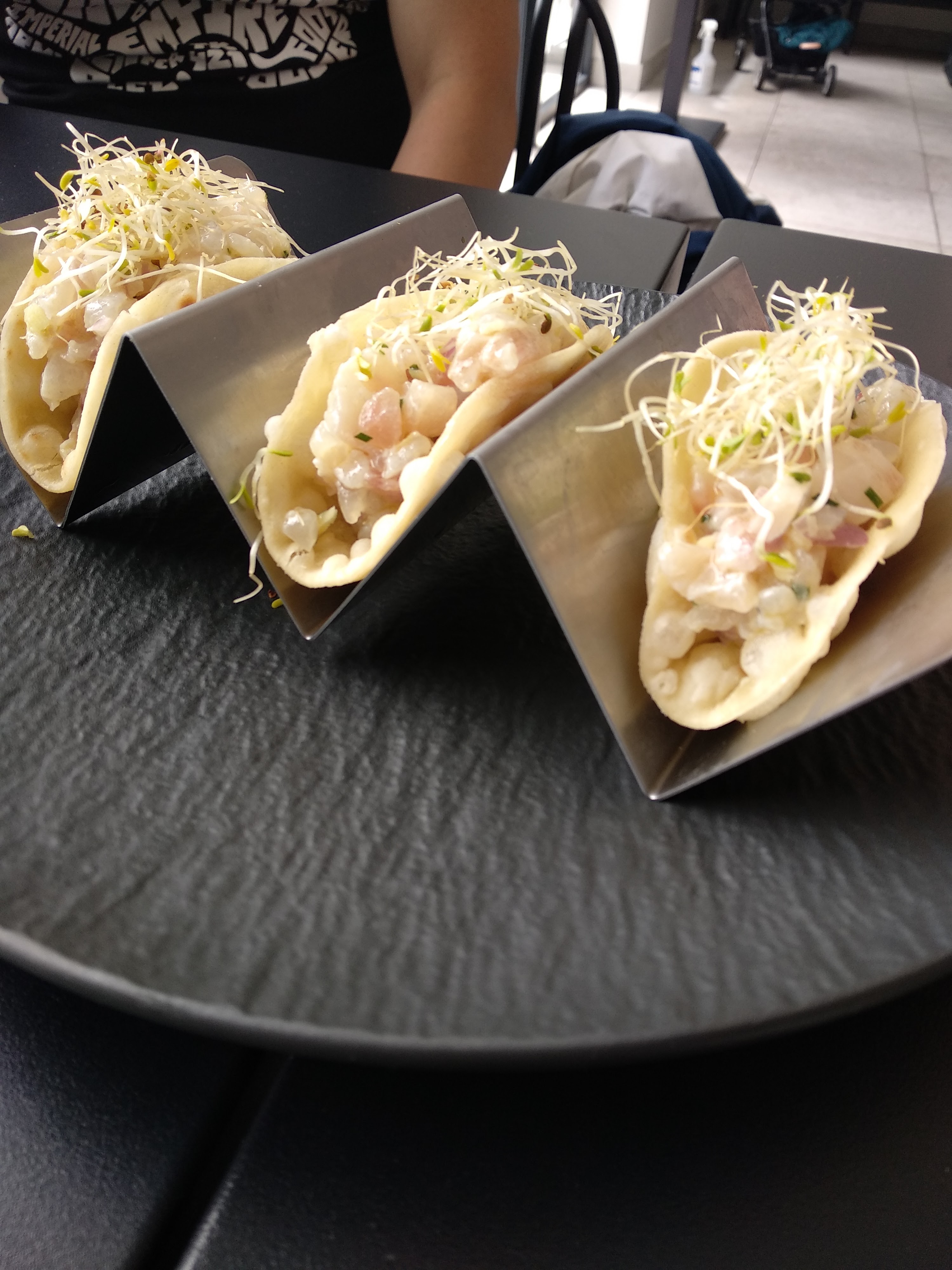 Excellente première expérience tant gustative que par la qualité du service. Un ceviche de daurade et ses tacos délicieux et copieux, mention spéciale pour le poulpe confit d une extrême tendreté même si la vue des tentacules entière dans l assiette m a un peu freinée😊 En bref nous renouvellerons l experience, mes papilles n etant pas faciles à satisfaire ayant un conjoint cuisinier. Merci aux serveuses très sympathiques. Bravo au chef!
