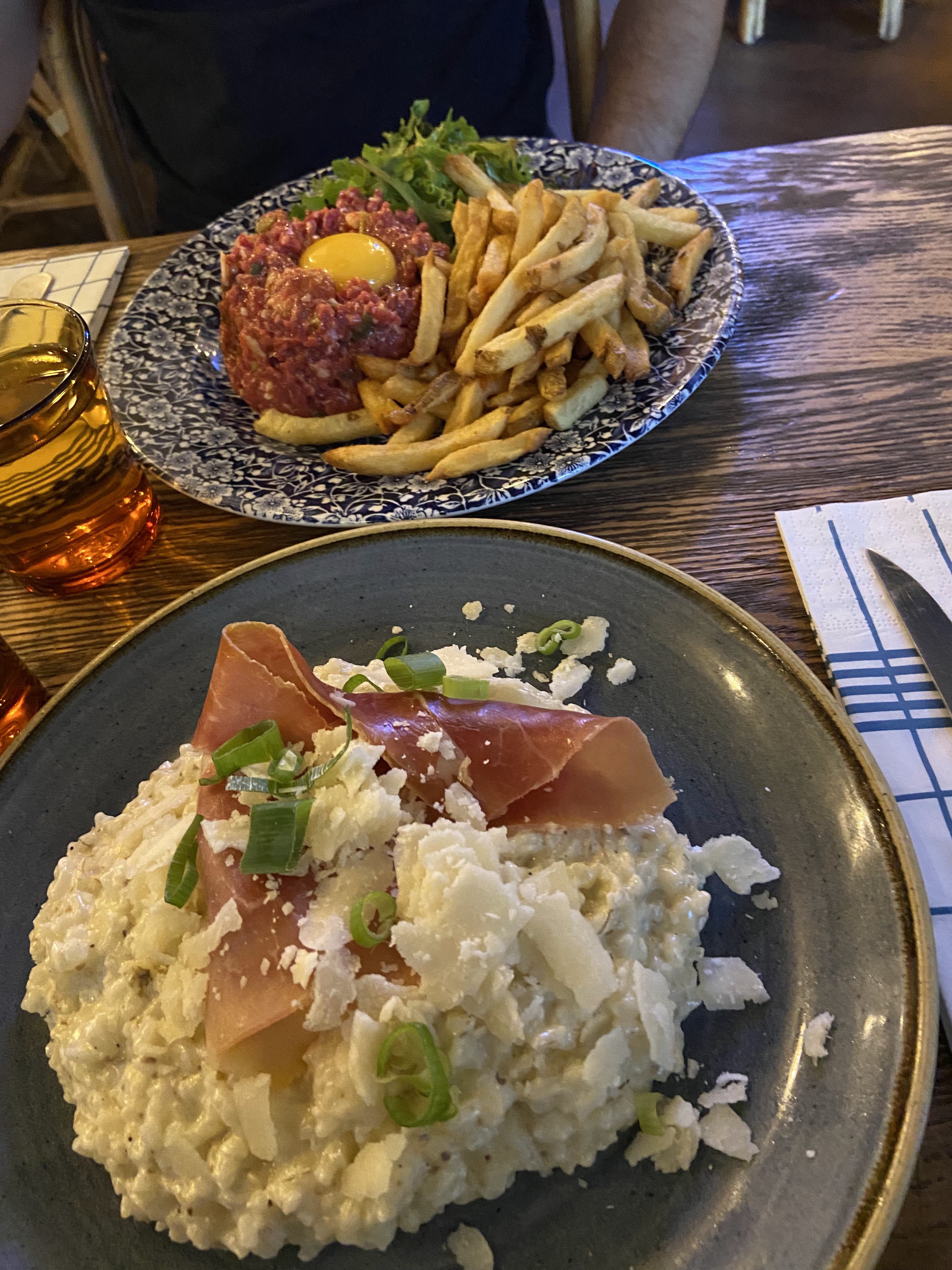 Mon mari et moi avons dîné sur la terrasse. Il avait une de leurs salades qui était très bonne. J'ai pris le steak tartare et la saveur était excellente mais, malheureusement, je suis une fille de texture et j'ai eu du mal avec ça. Le service ici était très bon.