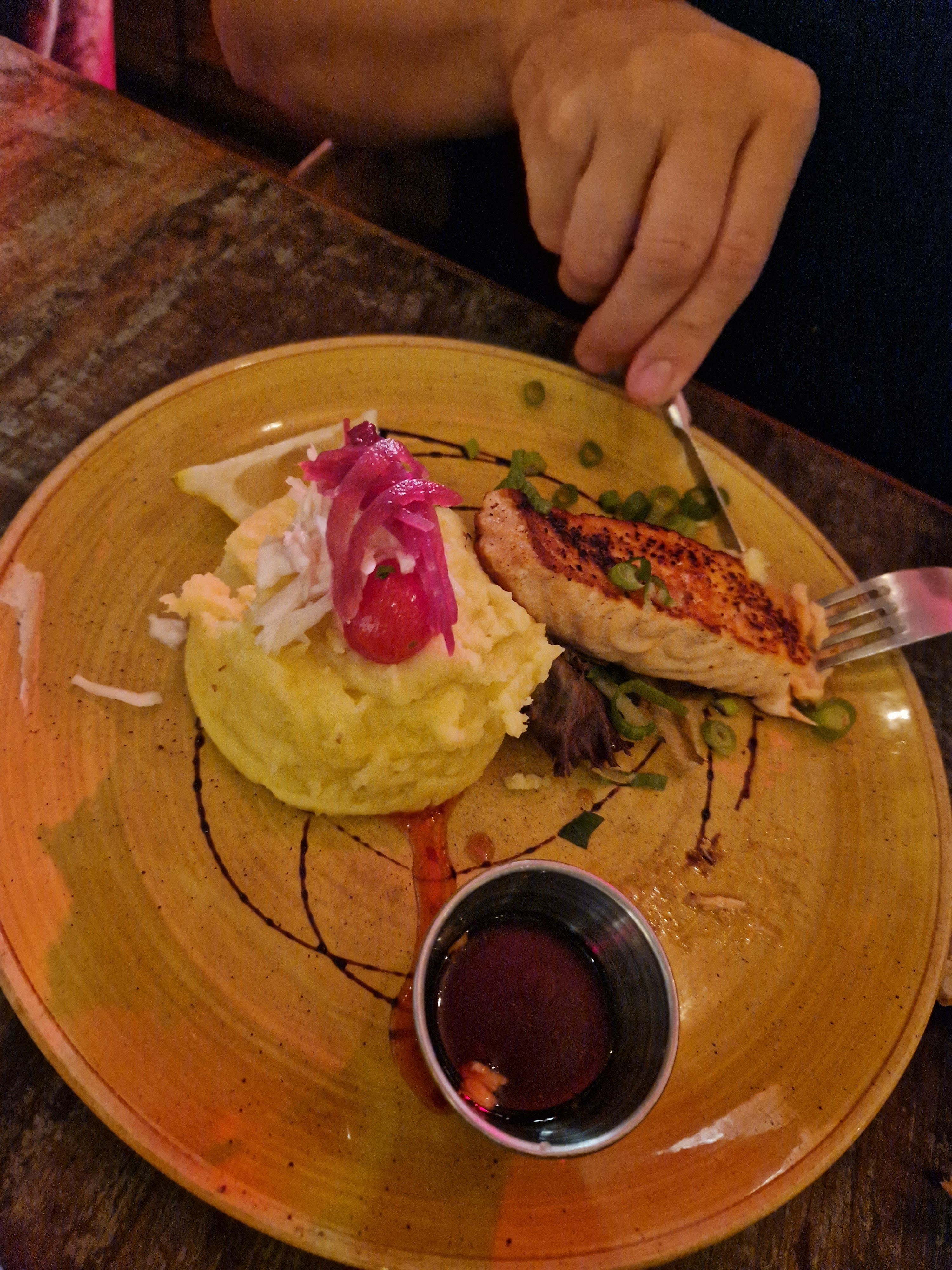 Le « saumon teriyaki aux petits légumes » proposé sur l’ardoise n’est qu’un pavé de saumon classique cuit à la poêle sans aucune trace de sauce teriyaki et sans petits légumes mais avec de la purée. Le tout est malheureusement fade et très classique. Donc une grosse déception, pas du tout ce qui était vendu…