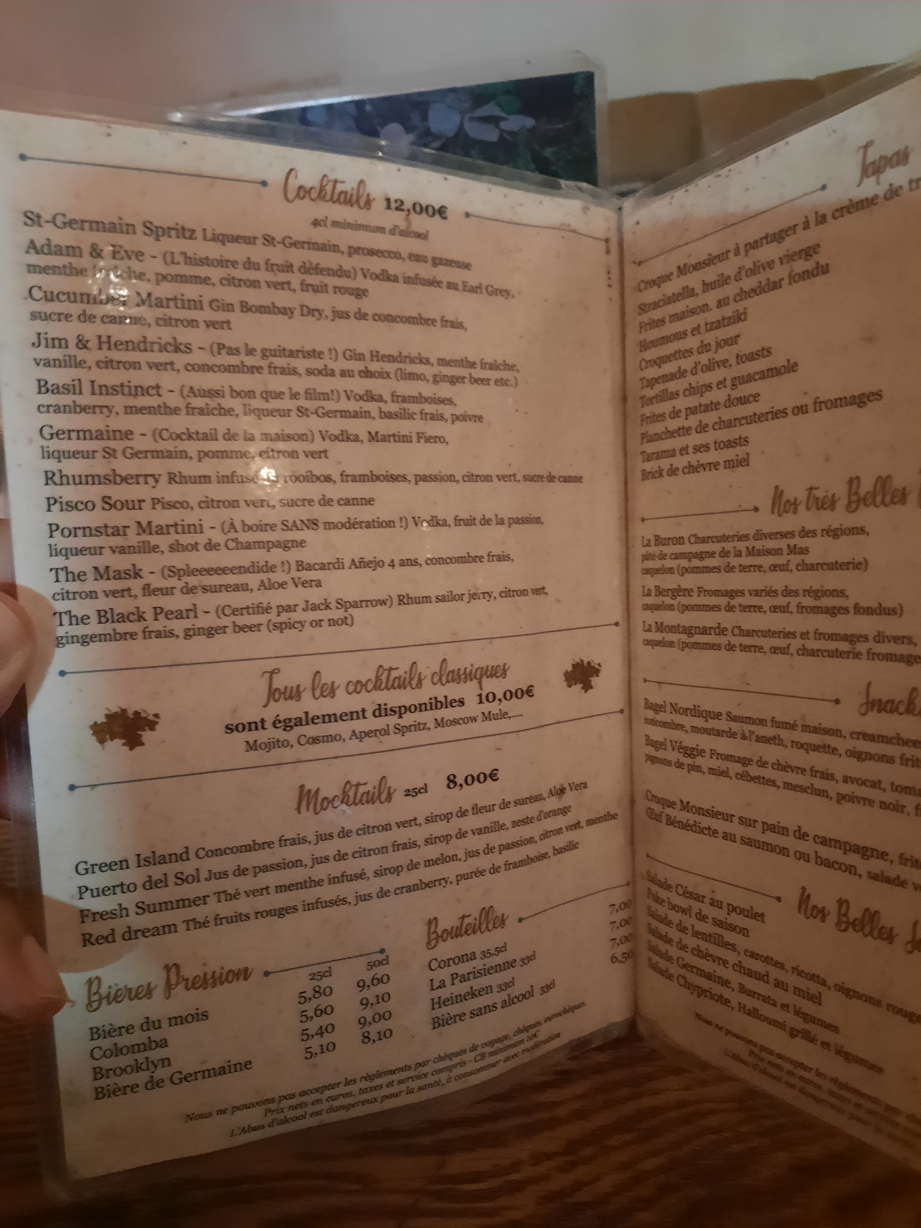 Toujours agréable de venir chez Germaine. Le lieu est très sympa dans cette petite rue de charme. La carte des tapas est conséquente et c’est un régal ! Dommage que certains produits ne soient plus disponible à 20h, ils sont pourtant si bons !
