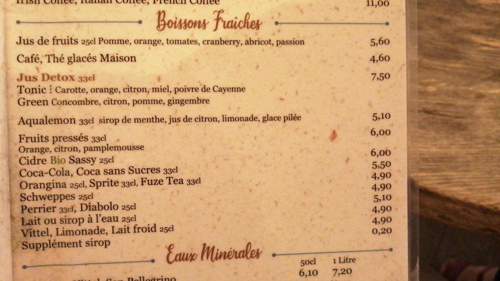 Produits de piètre qualité : un vin chaud sans arômes, ni épices au sein duquel flottent deux tranches de citron frais pour la forme... Un thé vert à la menthe verte fraiche servi en sachet industriel et sans menthe. 12 euros, par ici la monnaie !