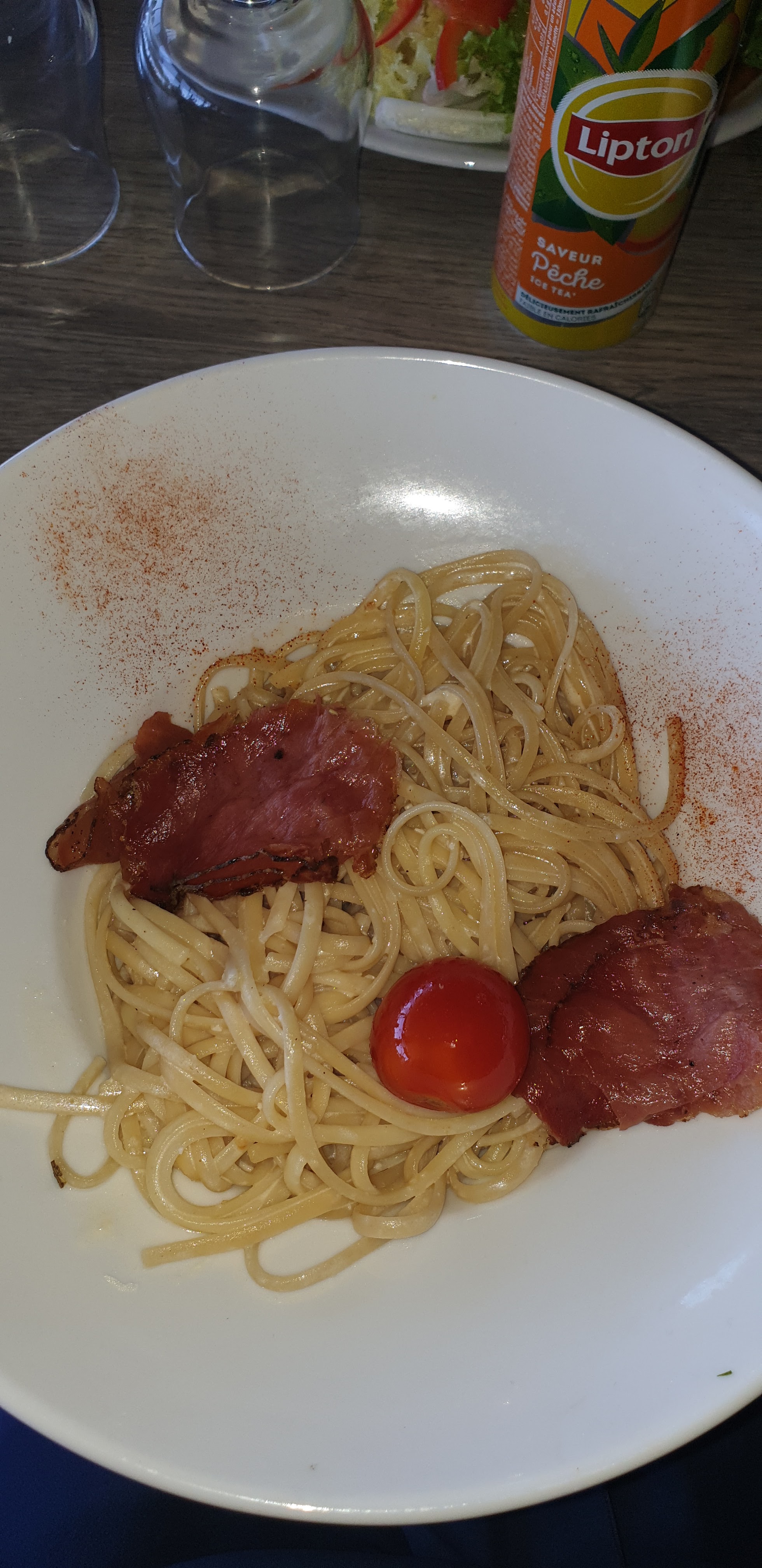 Service rapide, peu de salade verte dans la salade de calamars alors qu'elle est notée dans le descriptif. Le complément a été facturé. Pas de carte bleue.
