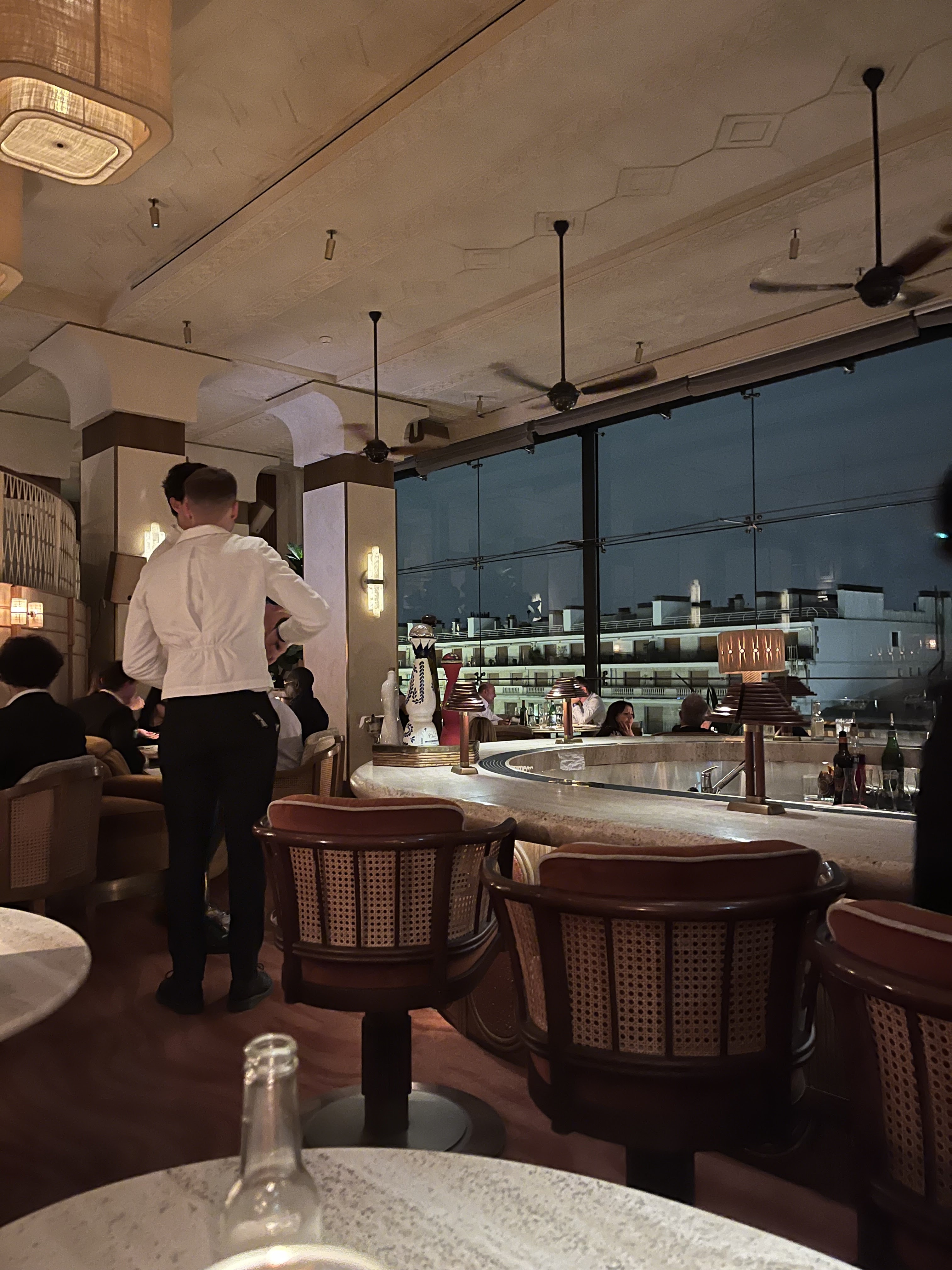 Super expérience dans un cadre magnifique, et une vue à couper le souffle. Le style rétro année 50 et la musique crée une immersion hyper intéressante. Le service est également top. Côté plat tout est relativement bon, mais clairement élevé néanmoins (+ de 100 euros / personne). Par exemple, on propose un fruit glacé de l'ordre de 59 euros. (j'ai quand même essayé le fruit à la passion à 20 euros) Bref, belle expérience, mais attention côté tarif vous savez à quoi vous en tenir :)