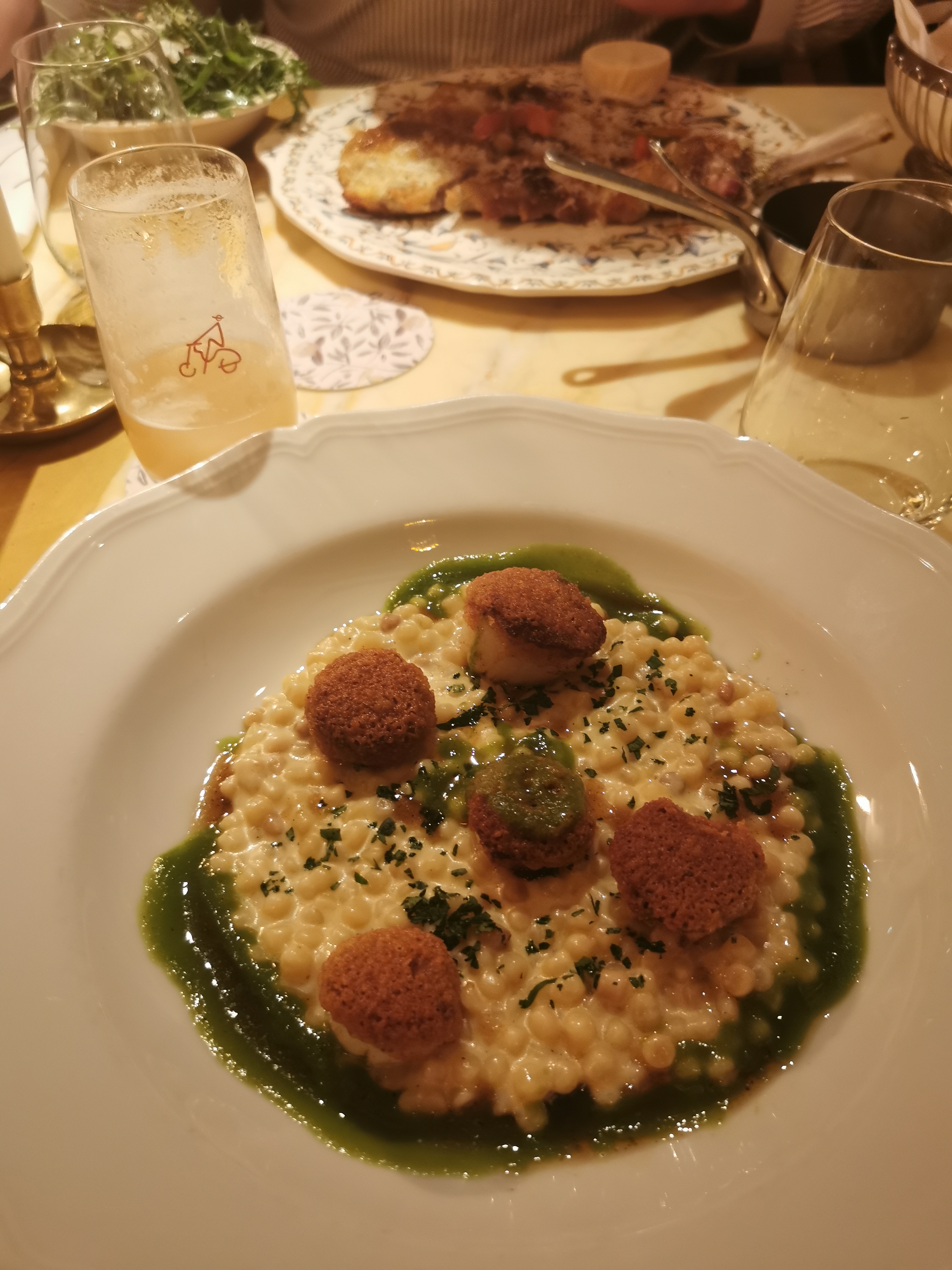 On s’attendait à une cuisine italienne délicieuse au vu de la difficulté de réserver une table mais ce ne fut pas le cas . Nous sommes extrêmement déçue par cet endroit : - cuisine insipide. - presque 100€ par personne sans alcool - longue attente pour atteindre le restaurant Les points positifs : - une serveuse très professionnelle et adorable - une belle décoration Il y a tellement mieux comme restaurants italiens à Paris . Et heureusement . C’est un endroit pour touristes . Tout simplement .