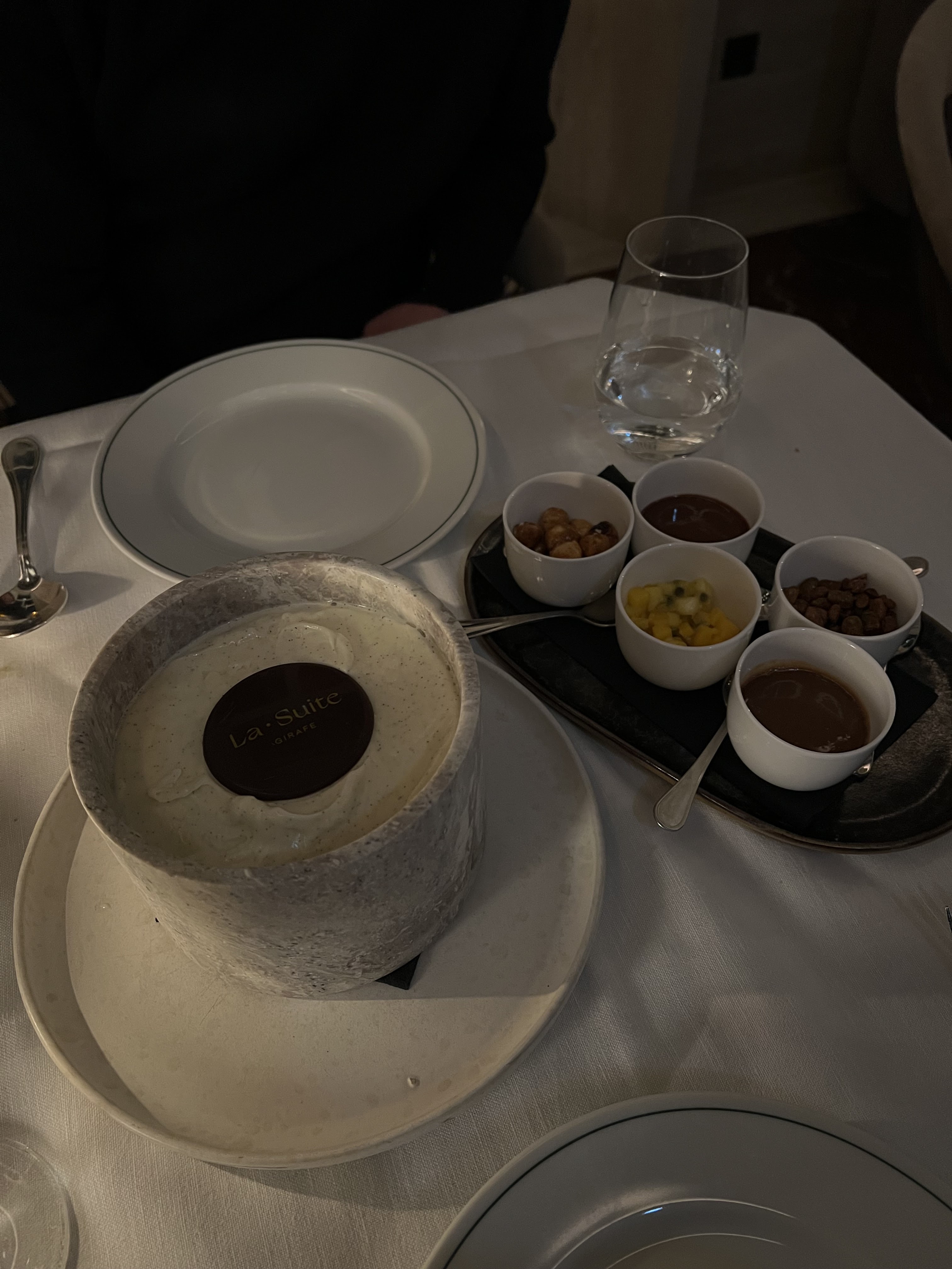 Nous avons réservé notre table et envoyé un mot disant que nous fêtions un anniversaire, l'Hôtel a rappelé, à notre arrivée on nous demande de monter dans la Suite. Nous nous sommes plaints et étions assis en bas. Le service de placement était très arrogant !!! Le service à table vraiment professionnel. La nourriture est excellente, ce qui est normal vu le prix.