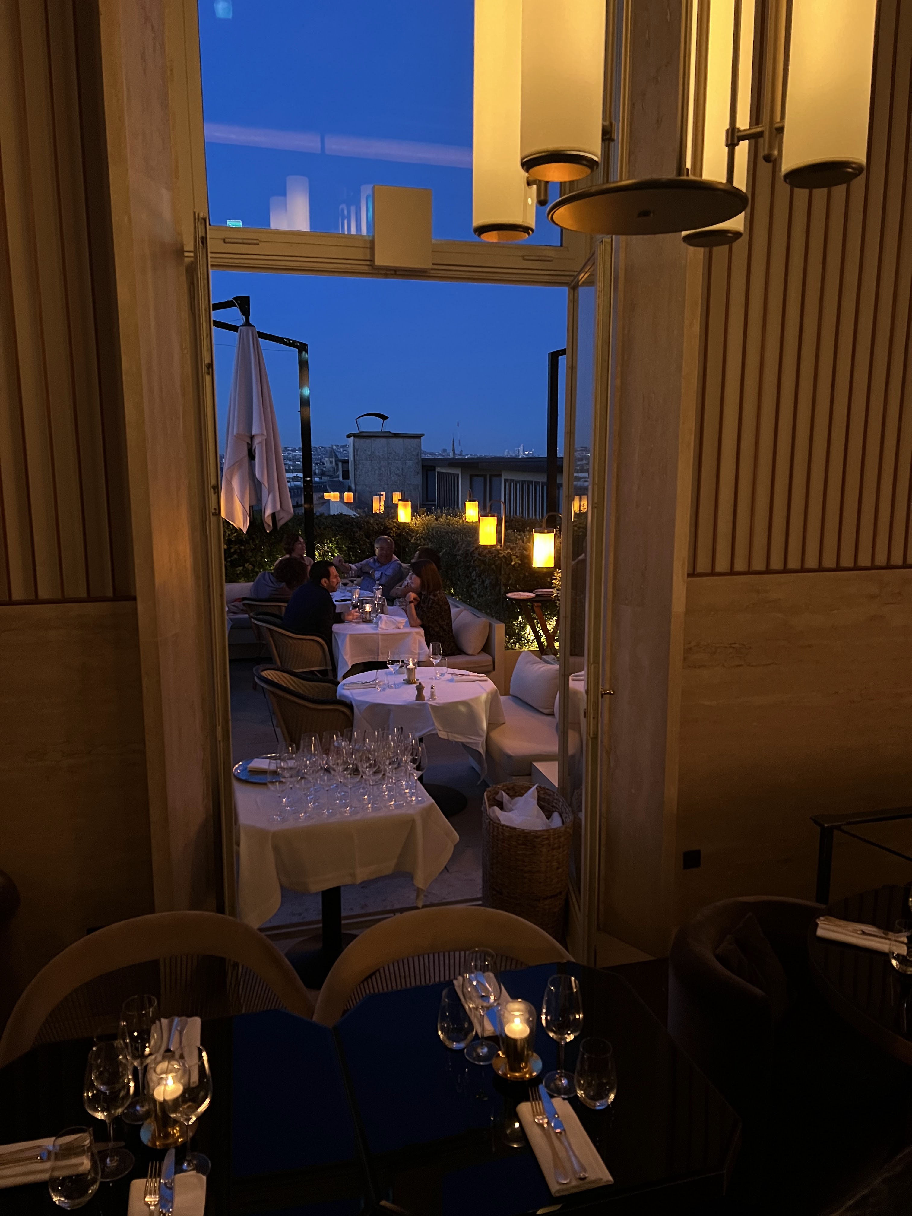 Il faut venir même juste pour la vue !! Le restaurant ouvre à 7 heures et nous n'avons pas de réservation, nous sommes donc arrivés vers 18h15 en espérant inscrire notre nom en premier. Mais la sécurité du bâtiment a refusé notre entrée et nous a informé qu’il était ouvert à 7 heures, alors attendez dehors. J'ai été surpris, peu importe si vous avez une résolution ou non, vous devez attendre jusqu'à 19 heures. Nous avons eu la chance d'avoir une table sur le toit ! La vue est tout simplement incroyable, au-delà des mots ! Ce restaurant est tellement beau à l'intérieur qu'à l'extérieur, mais je suggère de s'asseoir sur le toit ou sur la terrasse au rez-de-chaussée. La nourriture n'est en fait pas aussi chère que ce à quoi je m'attendais, mais les cocktails/vins sont assez chers ; 20 euros le verre en moyenne. Dans l'ensemble, la nourriture est plutôt bonne, les cocktails ont l'air et ont un goût incroyables, le dessert est 🤌, le service est excellent (tout le monde est si poli, difficile de voir ça en France mdr). Nous avons adoré notre expérience culinaire et pensons que cela devrait figurer sur votre liste de choses à faire.