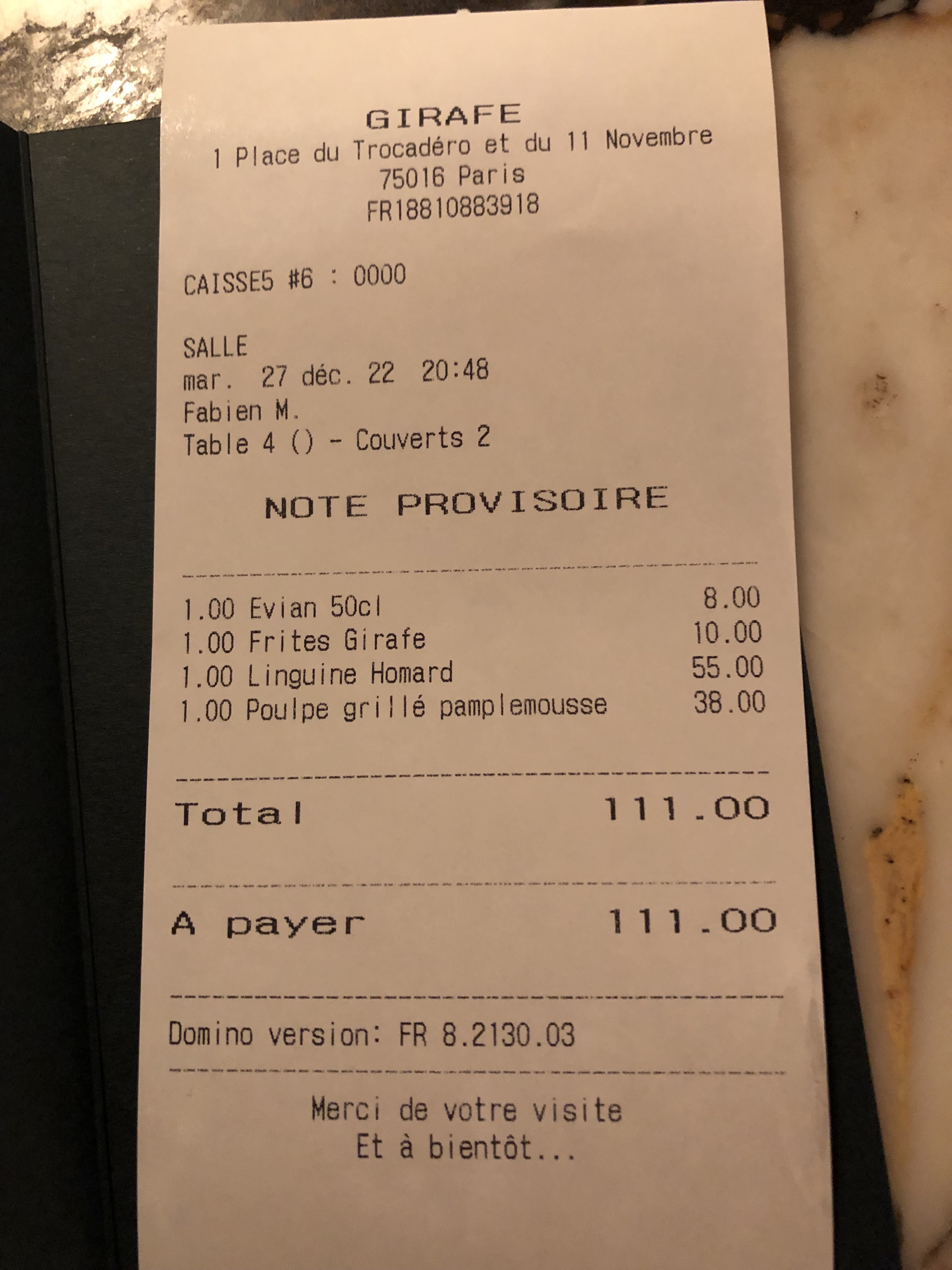 Le restaurant de la suite Le Girafe était mauvais. N'y allez pas. Voici pourquoi: -Pas de vue sur la Tour Eiffel depuis la plupart des tables même si annoncées. Nous étions assis dans un coin au fond. -Mauvaise qualité de service et globalement très lent. - Il y avait beaucoup d'erreurs de la part du serveur et la plupart ne parlaient pas anglais. Ils ont mis du temps à corriger leurs erreurs. -Les éléments manquants étaient inclus sur la facture. - Des assiettes supplémentaires apportées par erreur (que nous n'avons pas commandées) étaient incluses dans la facture. - La nourriture pas assez cuite a été mal réparée et n'a pas été retirée de la facture. -Ils nous ont préparé les mauvaises boissons. -Gestionnaire grossier qui n'a même pas essayé de régler la situation. J'ai porté des accusations et je me suis mis en colère contre mes commentaires. Je n'y retournerais pas. C'était comme s'ils s'étaient trompés sur tout ce qui était possible. Je ne pouvais pas y croire. C'est la seule mauvaise expérience que j'ai eu pendant 3 mois à Paris. Honnêtement, cette expérience a gâché notre dernière nuit à Paris. Au fait, je suis allé au restaurant habituel Girafe et c'était bon.
