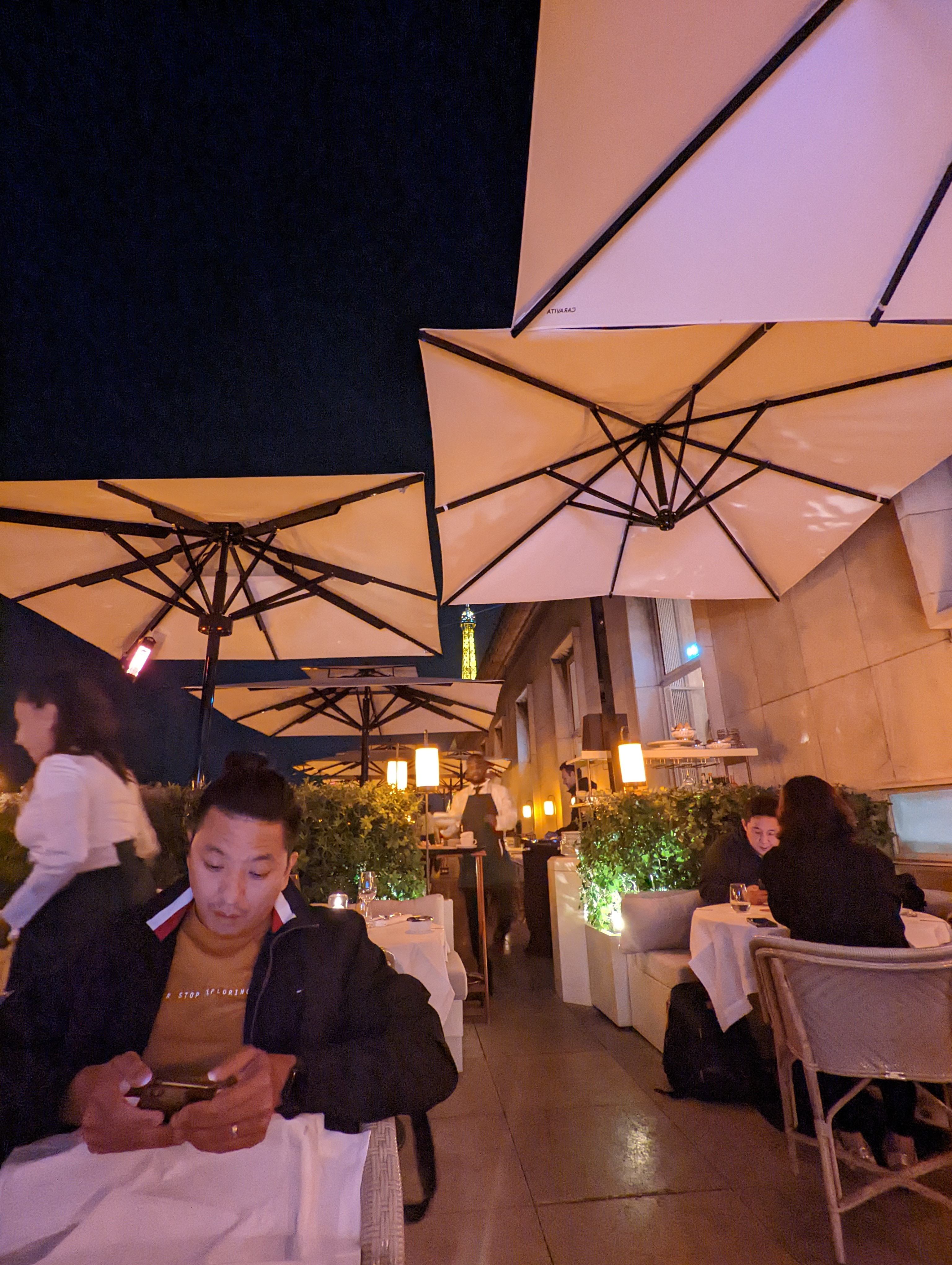 Soyons honnêtes, les gens viennent ici pour avoir des vues. Extrêmement déçu d'avoir organisé avec impatience les réservations pour cet établissement, longtemps à l'avance, pour me faire dire à notre arrivée que le patio était entièrement fermé. Oui, il fait froid en avril, mais nous n’avions même pas le droit de sortir pour prendre une photo. La nourriture est moyenne. Le service est moyen et plutôt impoli, pour être honnête. Je vous recommande de vérifier que le patio est ouvert si vous venez dans l’espoir de dîner avec vue. Extrêmement déçu de ce concept de Paris Society.
