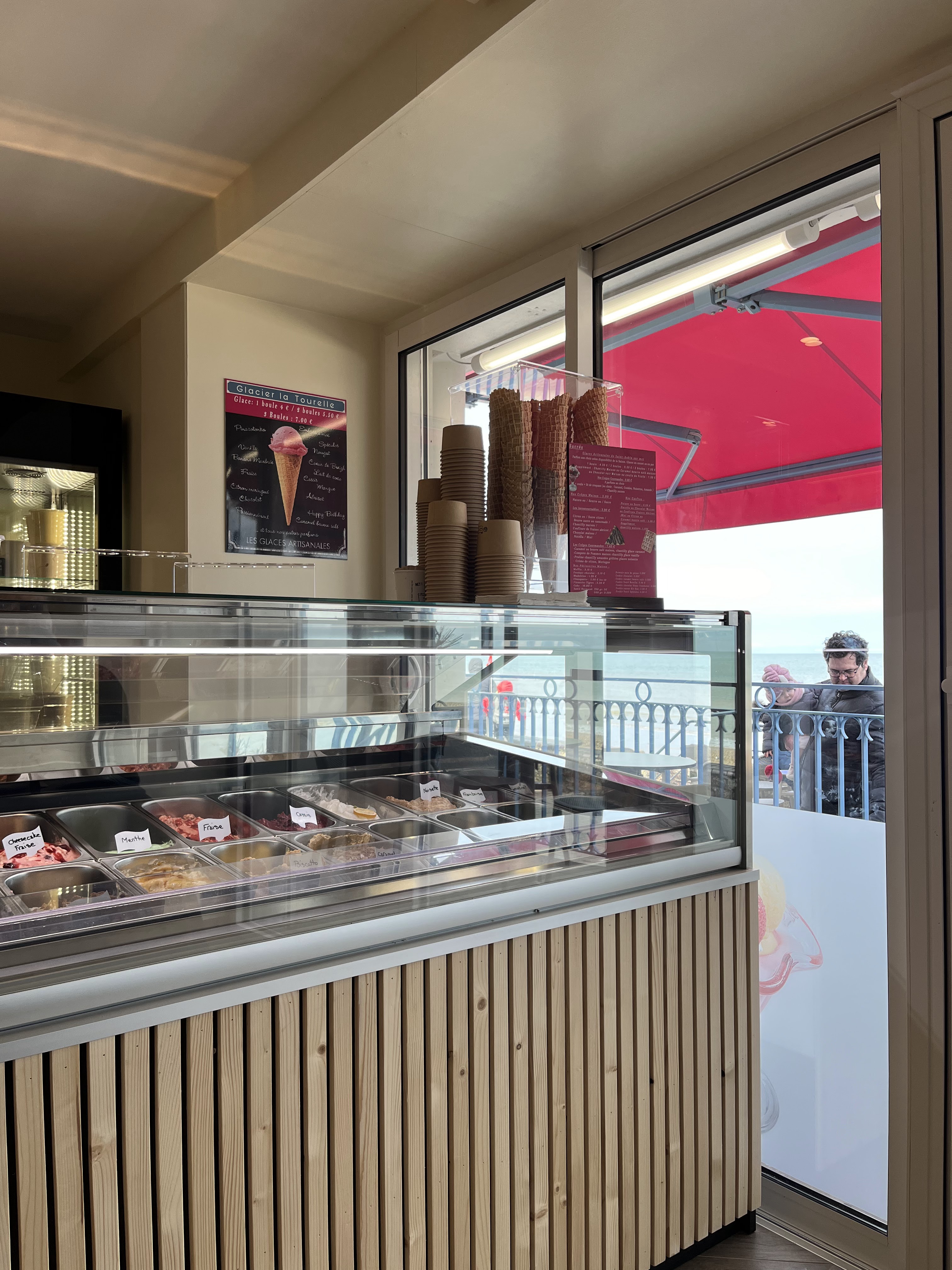 Glacier en front de mer. Les glaces artisanales étaient délicieuses. Ils devraient afficher les parfums de leurs glaces sur les vitres extérieures, ce qui permettrait de fluidifier et de limiter l’attente.
