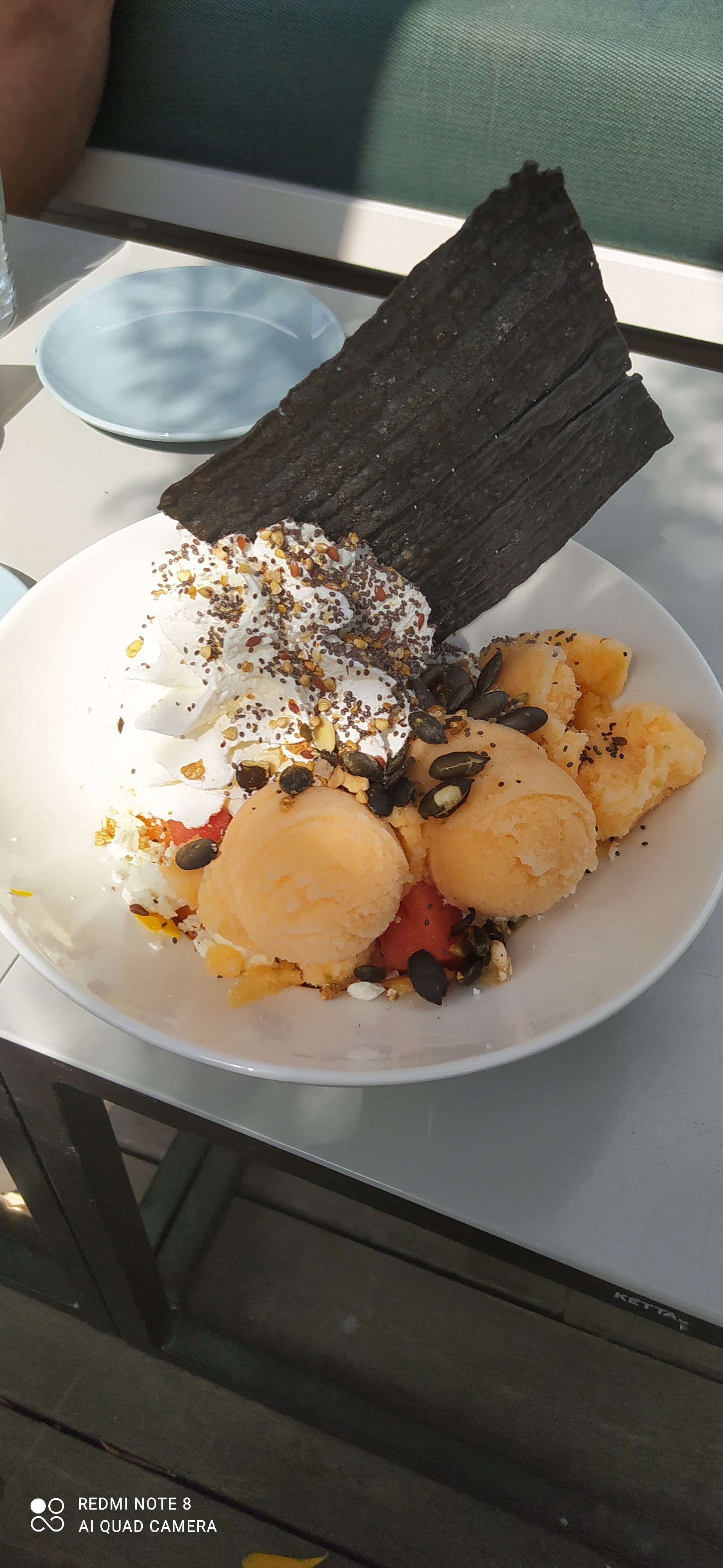 Sorbet mangue rate trop àcide tuiles amandes carbonisées surcharge de céréales petit dej ser i assiette à moules glace à 16 euro ou étais tu Pierre ? Sûrement pas à goûter tes glaces gros regret