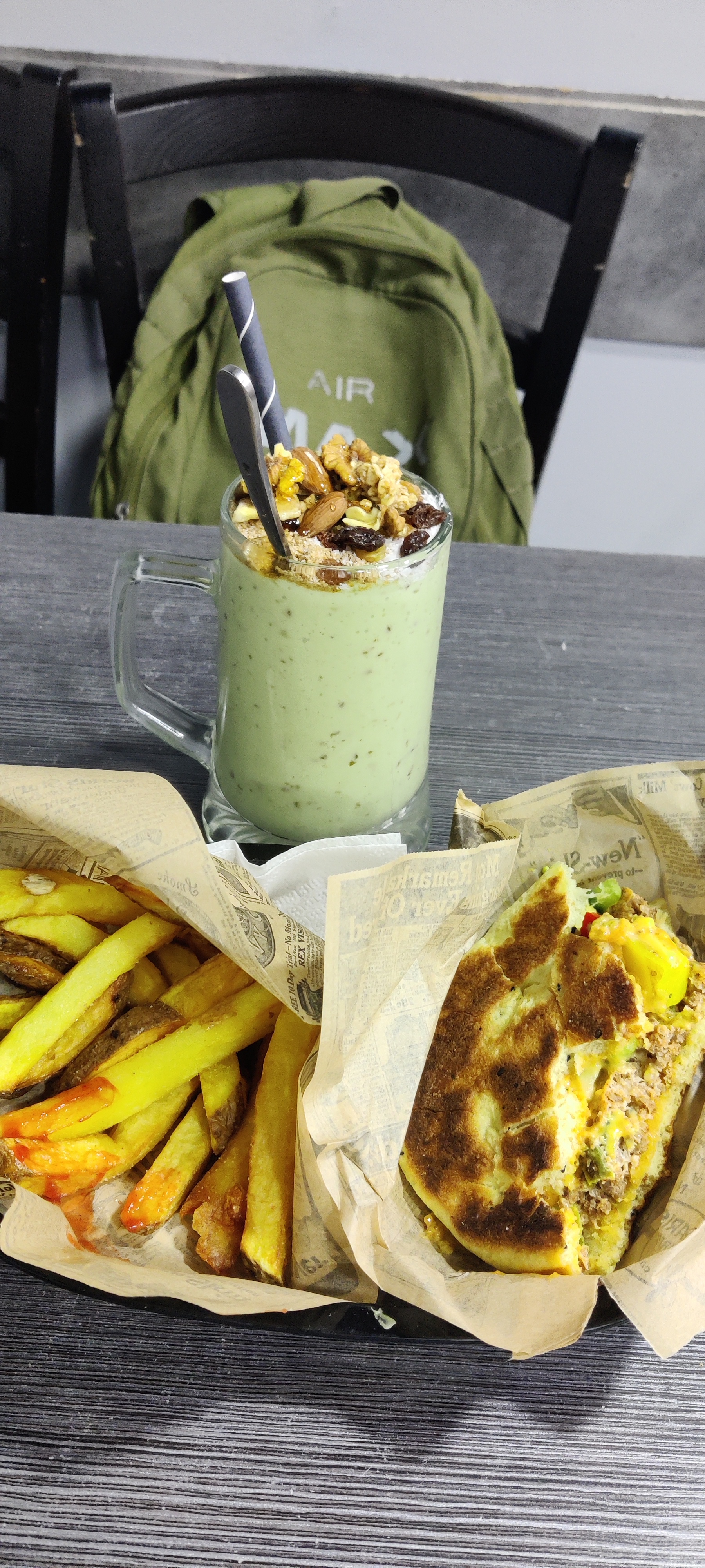 Très bon smoothies, personnel accueillant . Mon amie a pris un sandwich avec pain batbout, il était excellent