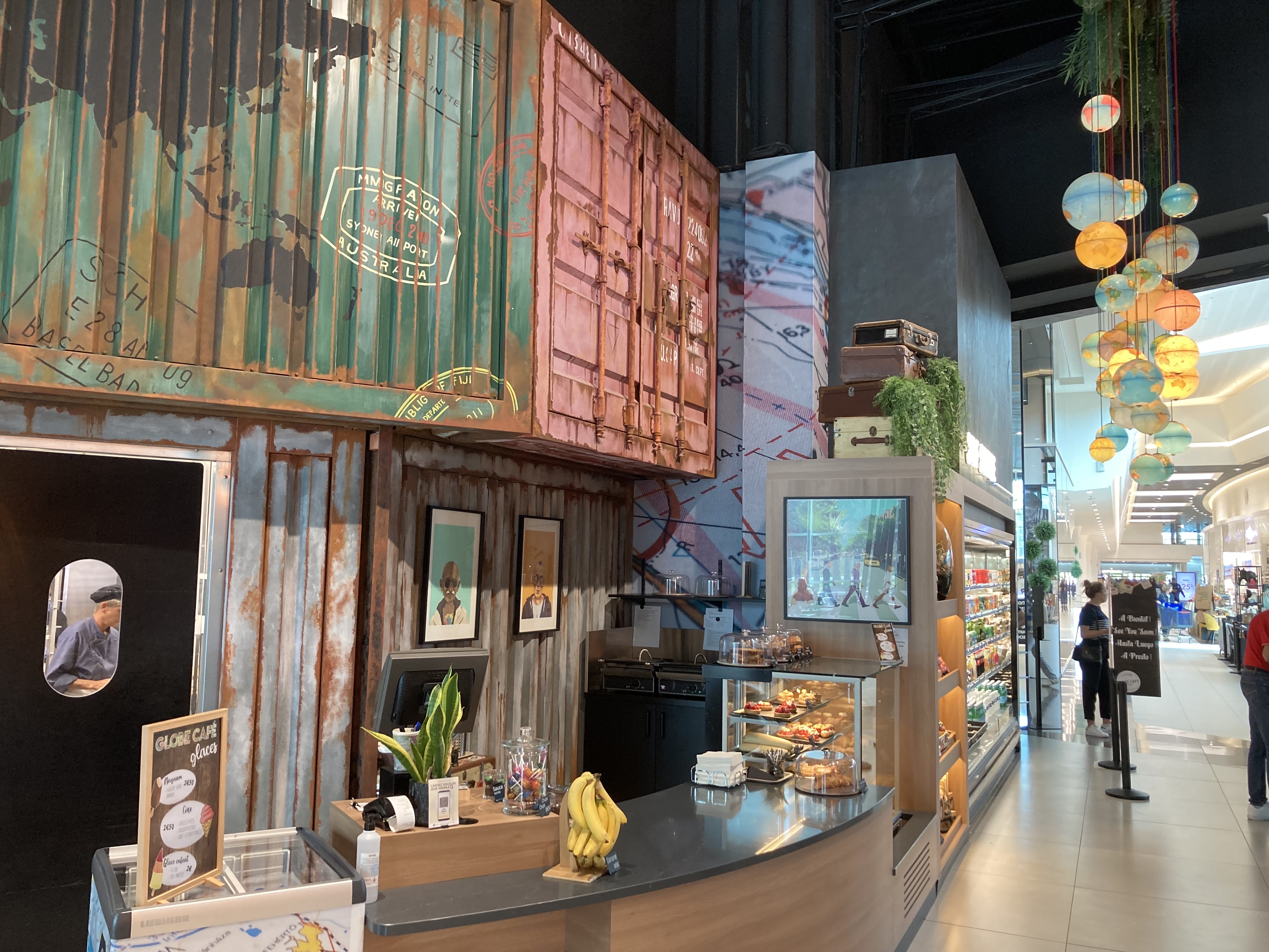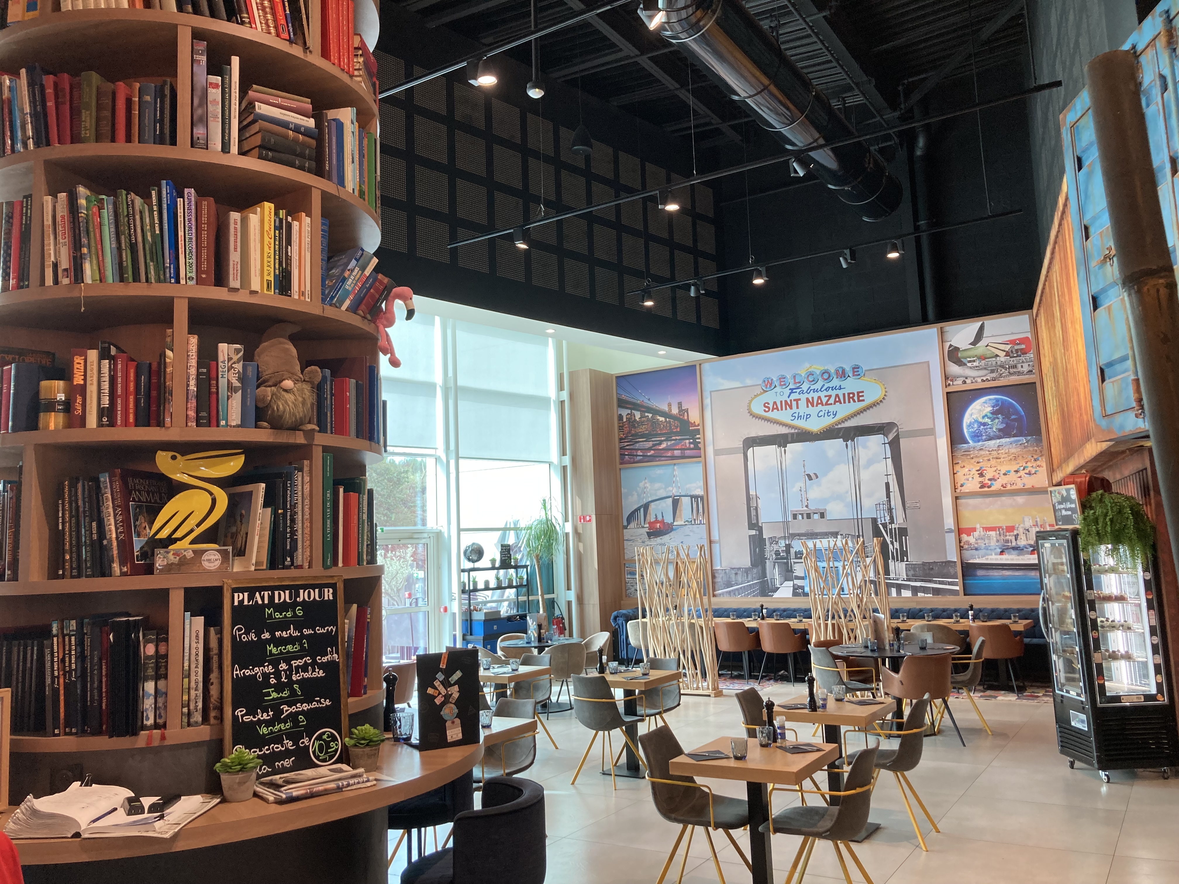 Pour un café dans une galerie marchande, il s’agit d’une magnifique surprise de ce lieu victime de son succès. En effet peu de places disponibles prises d’assaut dès 12:00 pétantes. Il faut donc réserver si vous voulez être certain de ne pas attendre, ce qui est disons le à l’encontre d’un concept de café de galerie. Le service se veut rapide et en moins d’une heure vous avez enfilé les plats. La carte épurée ‘brasserie’ propose des plats un cran au dessus à un prix très abordable! Le menu par exemple avec entrée/plat/dessert est tout juste proche des 20€ La décoration axée sur le globe regorge d’anecdotes et de curiosités (plage sur la lune par exemple). Même si on n’y va pas pour cela, c’est tout de même sympa. Le service, qui se veut donc rapide, manque peut être un peu de chaleur… après tout si nous cherchions l’inverse il faut aller plutôt dans un restaurant qui se déclare comme tel. À noter qu’un service de vente à emporter de sandwichs existe sur place. Cela nous a moins convaincu, malgré la qualité des desserts maisons faits sur place (dans l’hypermarché ou en cuisine?) Beaucoup mieux donc qu’une cafétéria classique ou qu’un fast food pour un prix et une qualité de produits toute autre! Pensez y en passant par le quartier de l’immaculé à Saint-Nazaire!