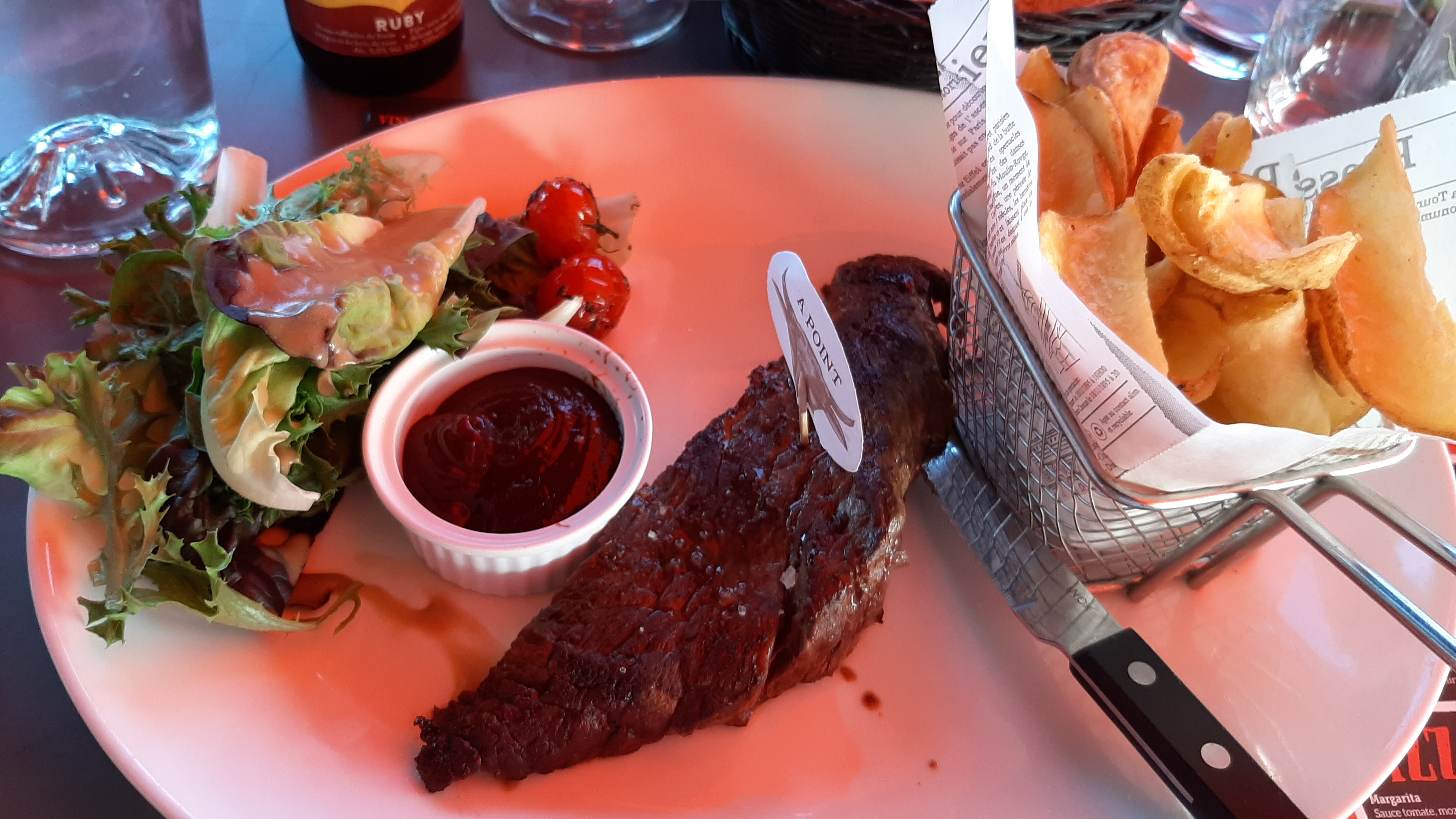 1etoile et encore je suis gentille car on peut pas mettre moins.jai téléphoné ce matin pour une table pour 21h15 le soir même.au téléphone je me suis entendue dire qu il fallait pas trainer car la cuisine fermait peu de temps après.pas soupe au lait et étant de la génération de la seconde chance on est venu pour 21h...la commande des apéros passé,on est venu avec insistance 5fois en 10minutes nous demander si on avait choisir nos plats...et bien non.on peut pas réfléchir quand on se sent épiés...c'est donc le second point négatif. Le 3eme est arrivé très vite quand la salade Cesare de chéri de son menu a 19.90€ est arrivée...raplapla...deux bouts de filets de poulet pané même pas croustillant et manque de sauce.ca sent très clairement l industriel a fond...mais bon je me dis vivement le plat...une pièce du boucher.cuisson bien mais le panier de frites a Moitier remplit....même a macdo on en a plus je pense...le dessert sera une panacotta camarel dont la serveuse ventait peu les mérites de son caramel de break France pour finalement quand je lui pose la question m entendre dire qu ils ont changé pour celui de métro bien meilleur....purée...sérieux? Mais réfléchit avant de parler c'est un conseil....quand a moi,fruits frais...pas trop mauvais. Et bien on y retournera pas.on est déçu .on savait que ça serait pas du fait maison entièrement mais quand même un minimum...un topping caramel c'est du sucre de la crème et une pointe de beurre...dresser les desserts sur le passe plat est encore une erreur car la chantilly en bombe c'est pas top .le mieux dans tout ça? La table de derrière qui parlait doucement et qui avançait les mêmes arguments que ce que je vous cite...je déconseille