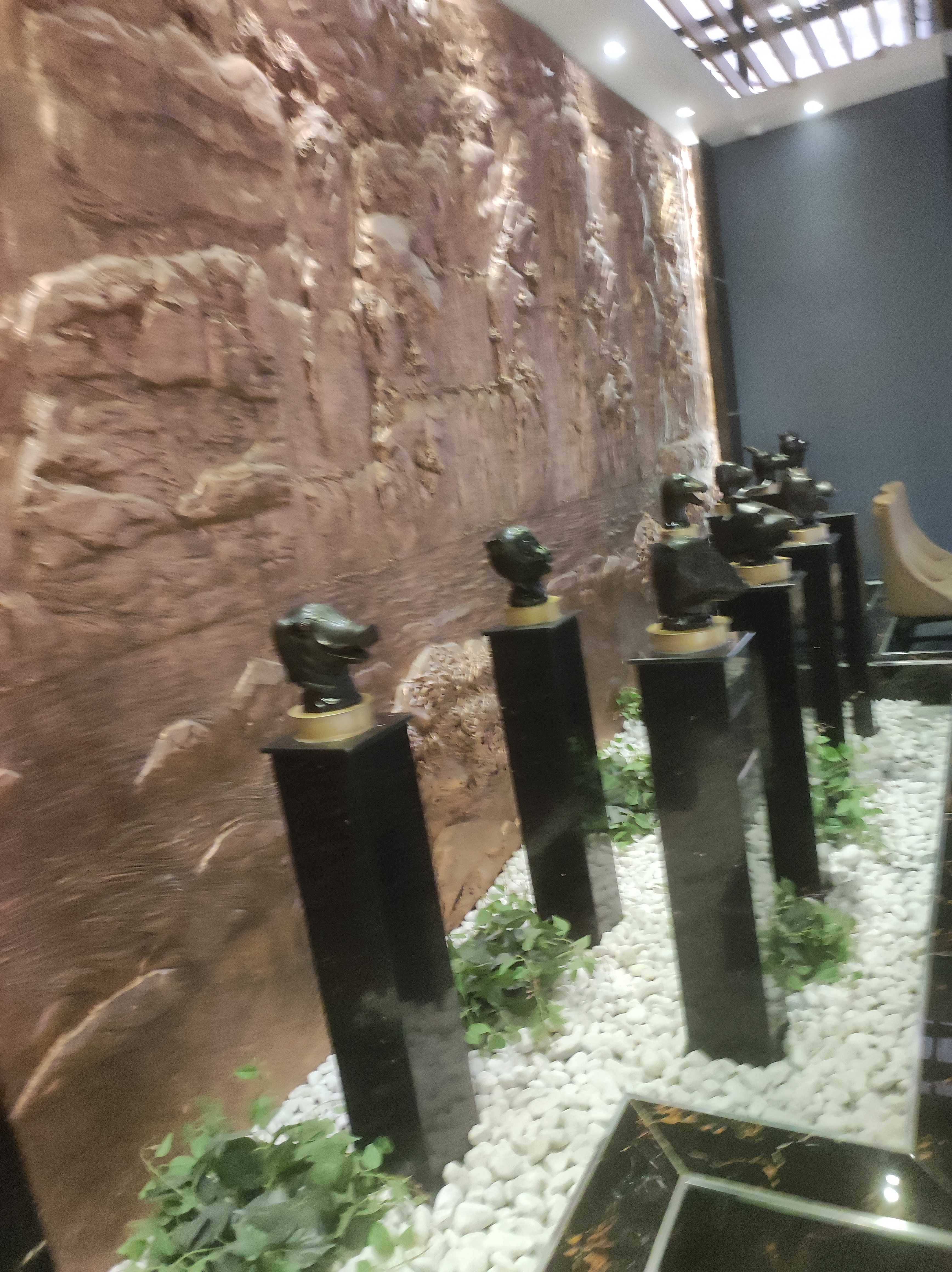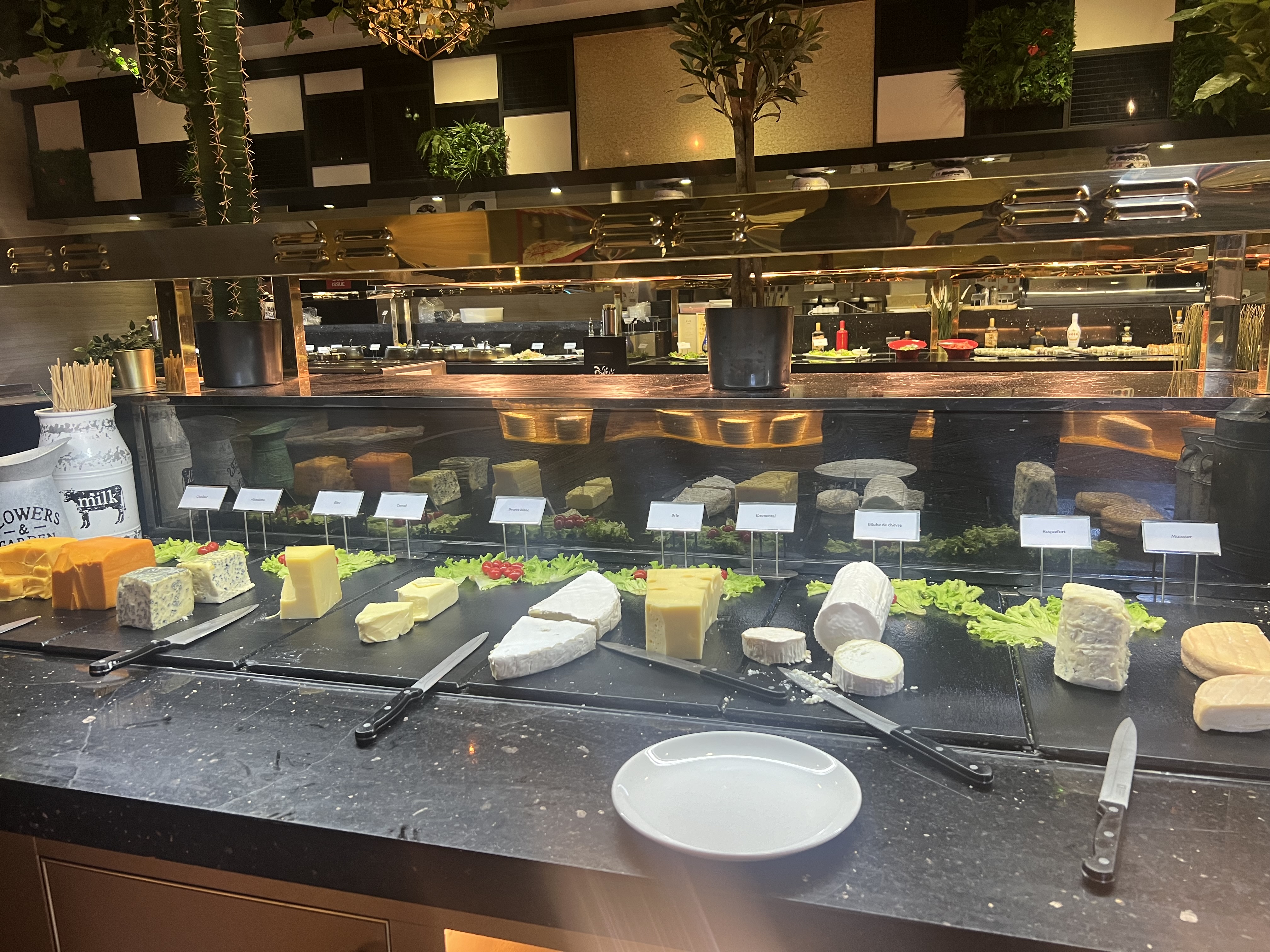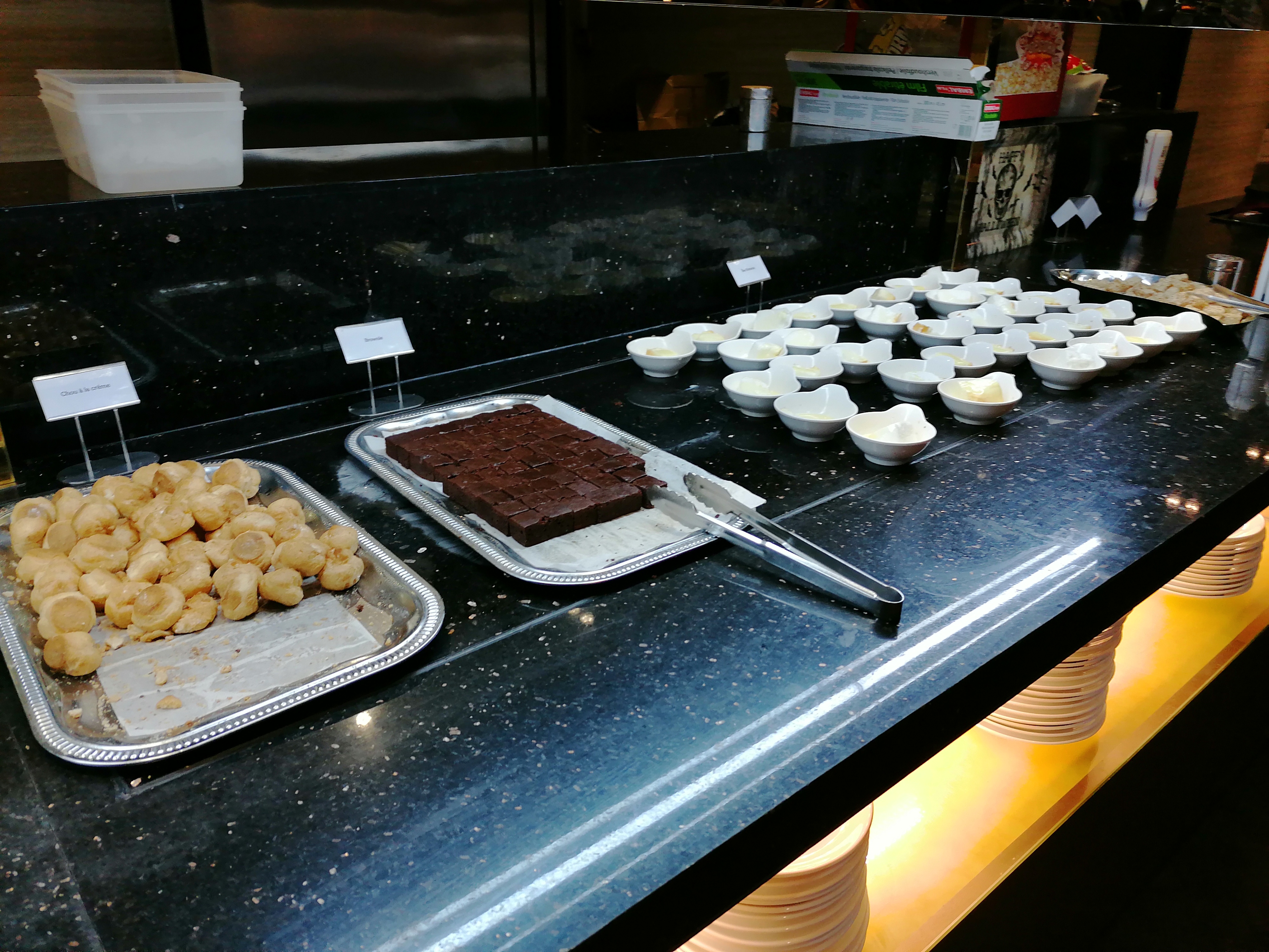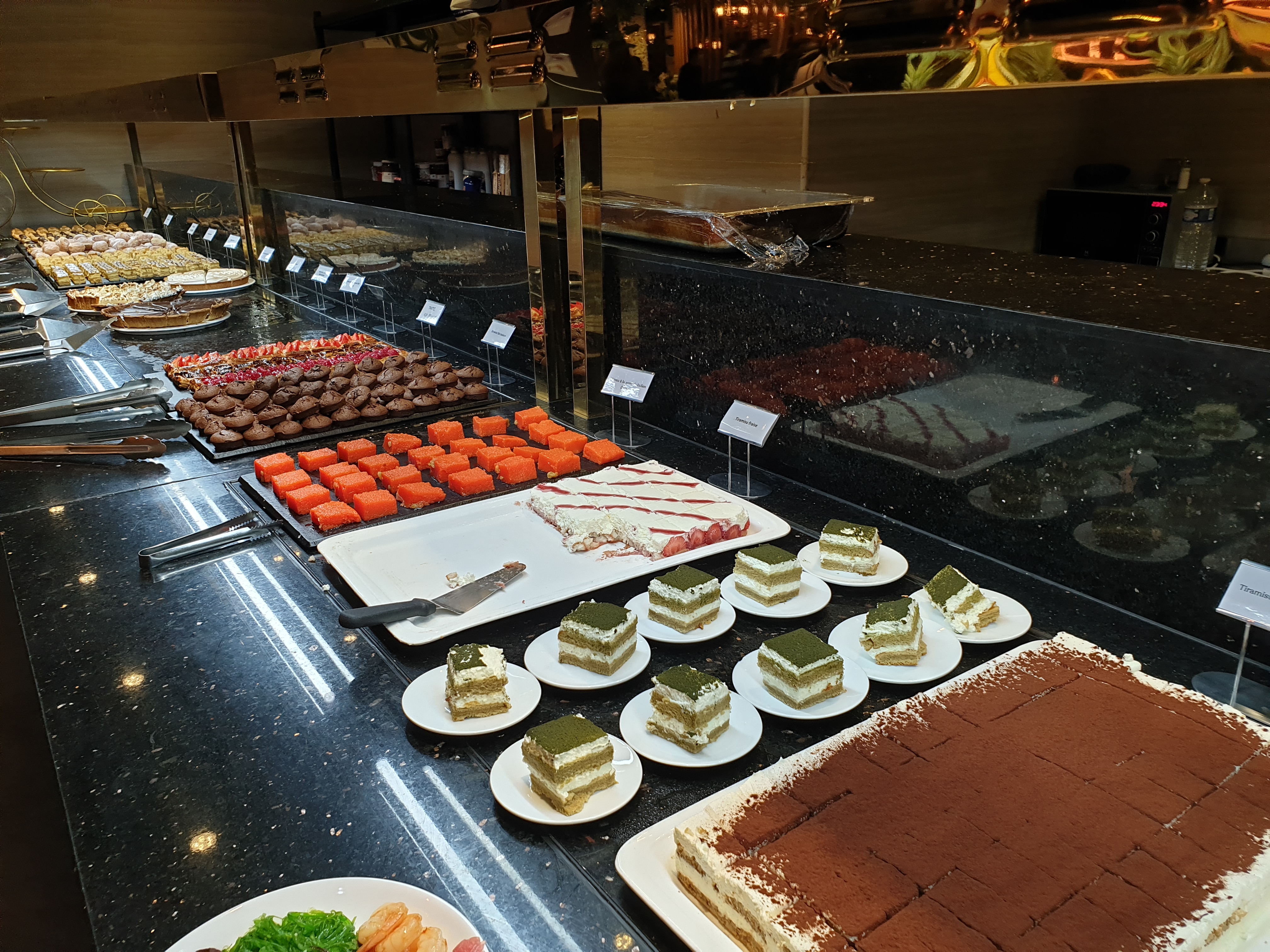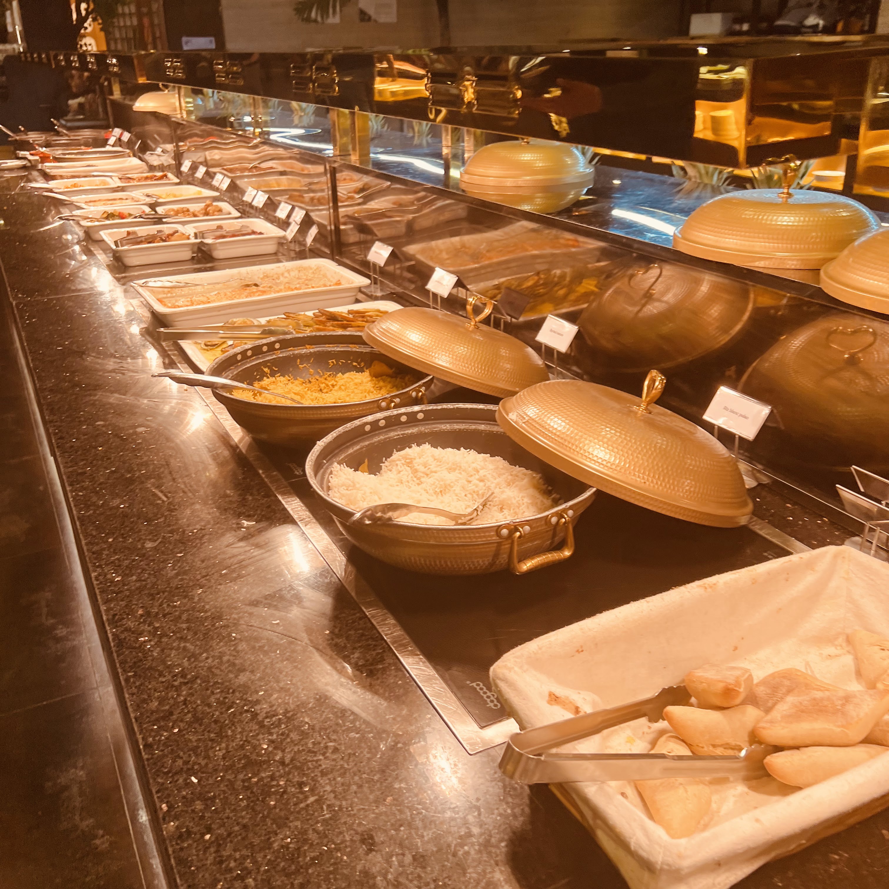 Le thème du restaurant est si sombre. Les canapés ne sont pas confortables du tout et sont très bas par rapport à la table, vous avez l'impression d'être accroché à la table pour manger. Pour être honnête, les options de restauration ne sont pas si délicieuses, à l'exception de la section des friandises et des desserts. Trop cher!!!