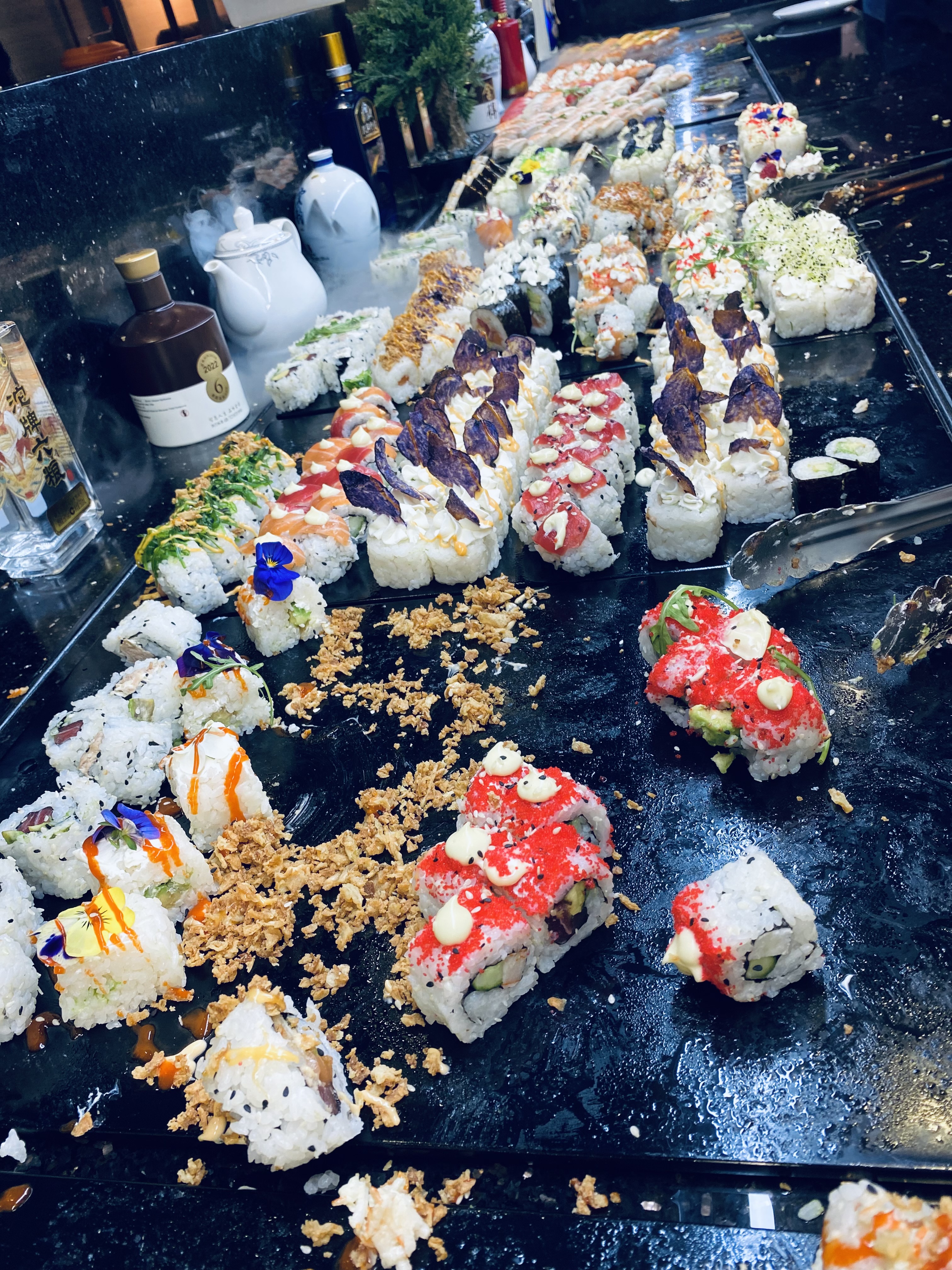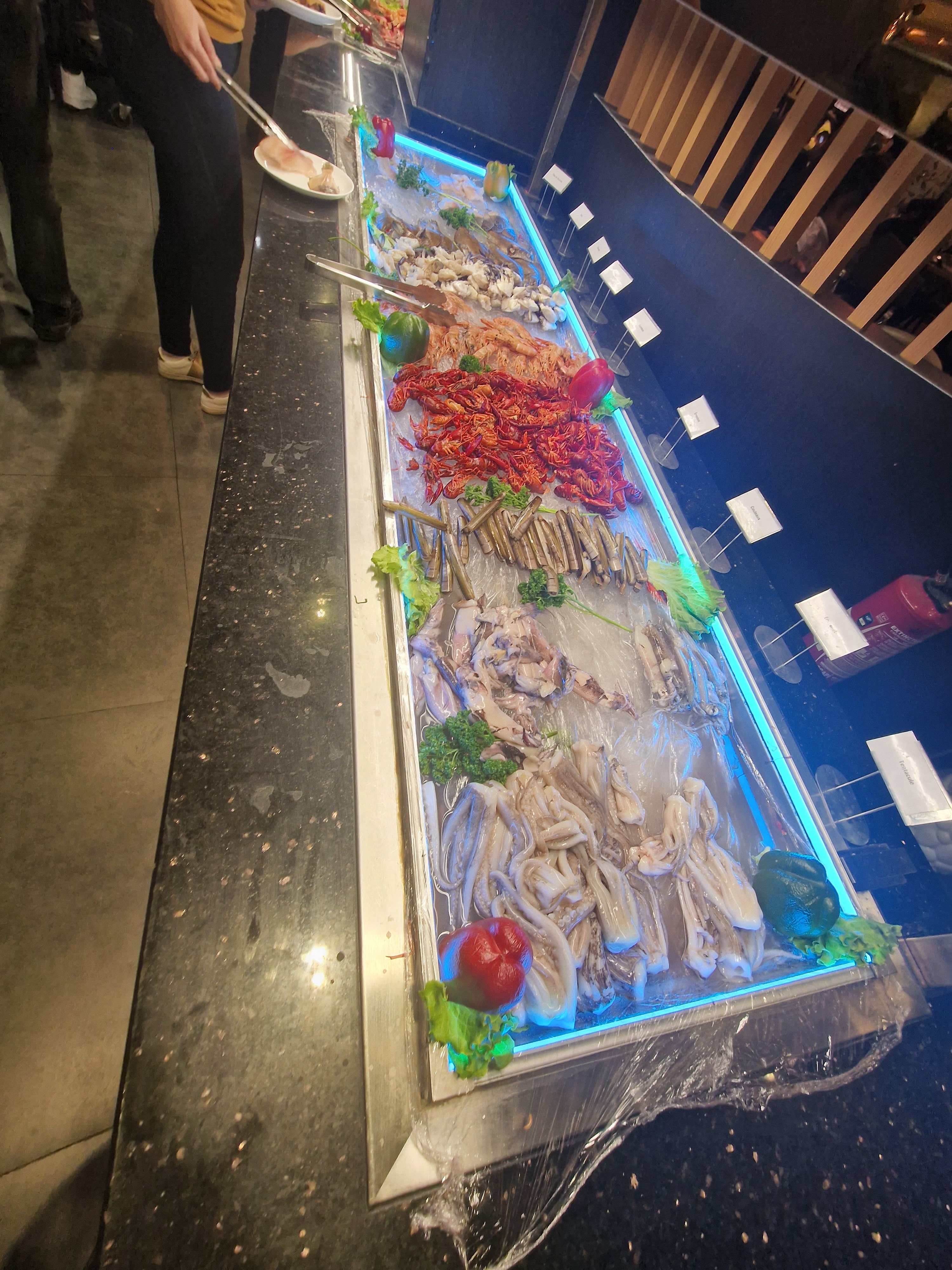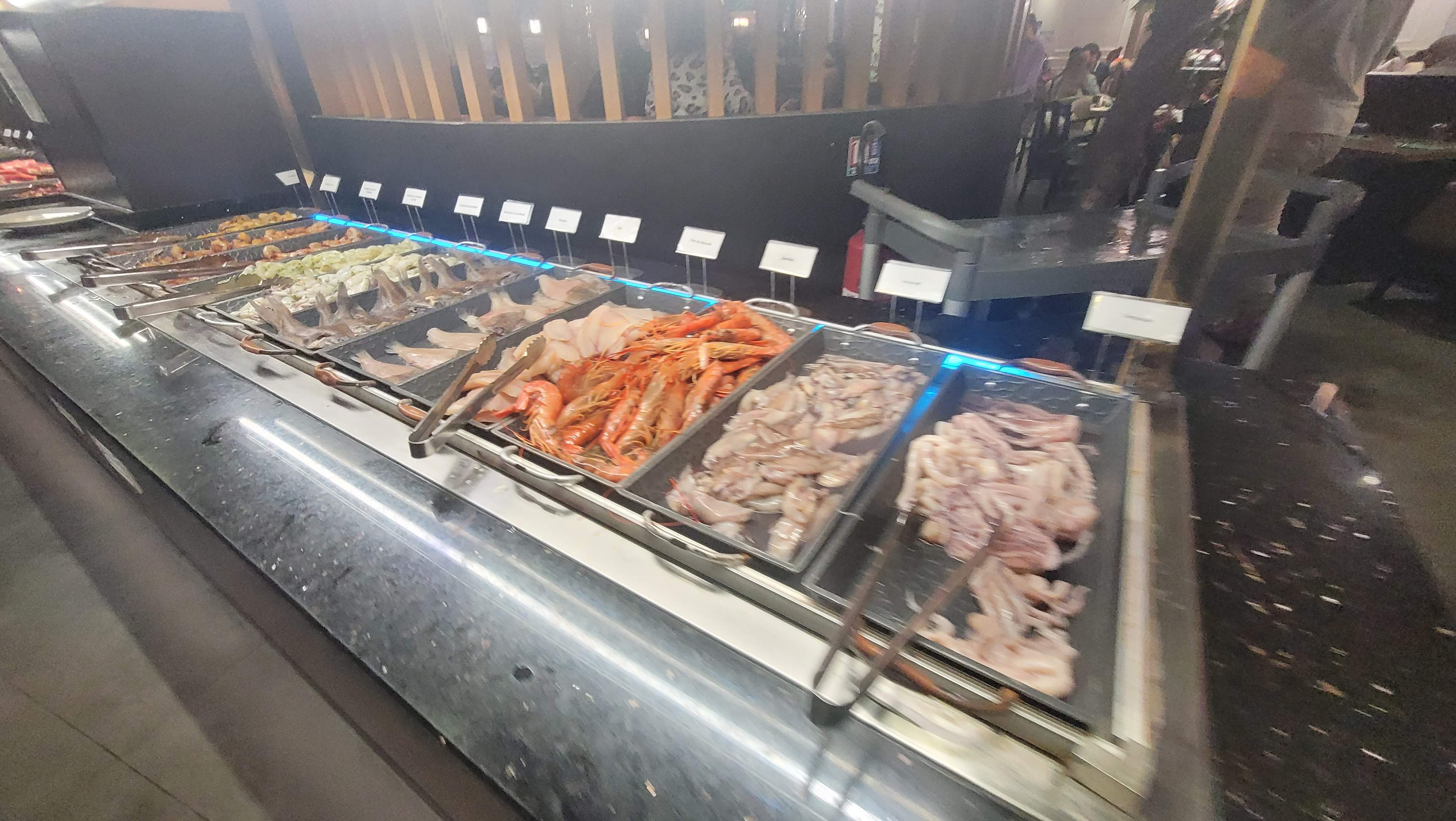 Nourriture sans goût, goût de la flotte du congelé !, si on arrive à 22h. On paie le prix fort et y a plus rien sur le buffet, Clairement y a pas d'ambiance ni de service sauf pour la boisson, lieu très bruyant! Ce resto est fait pour ceux qui aiment manger beaucoup. Stop.