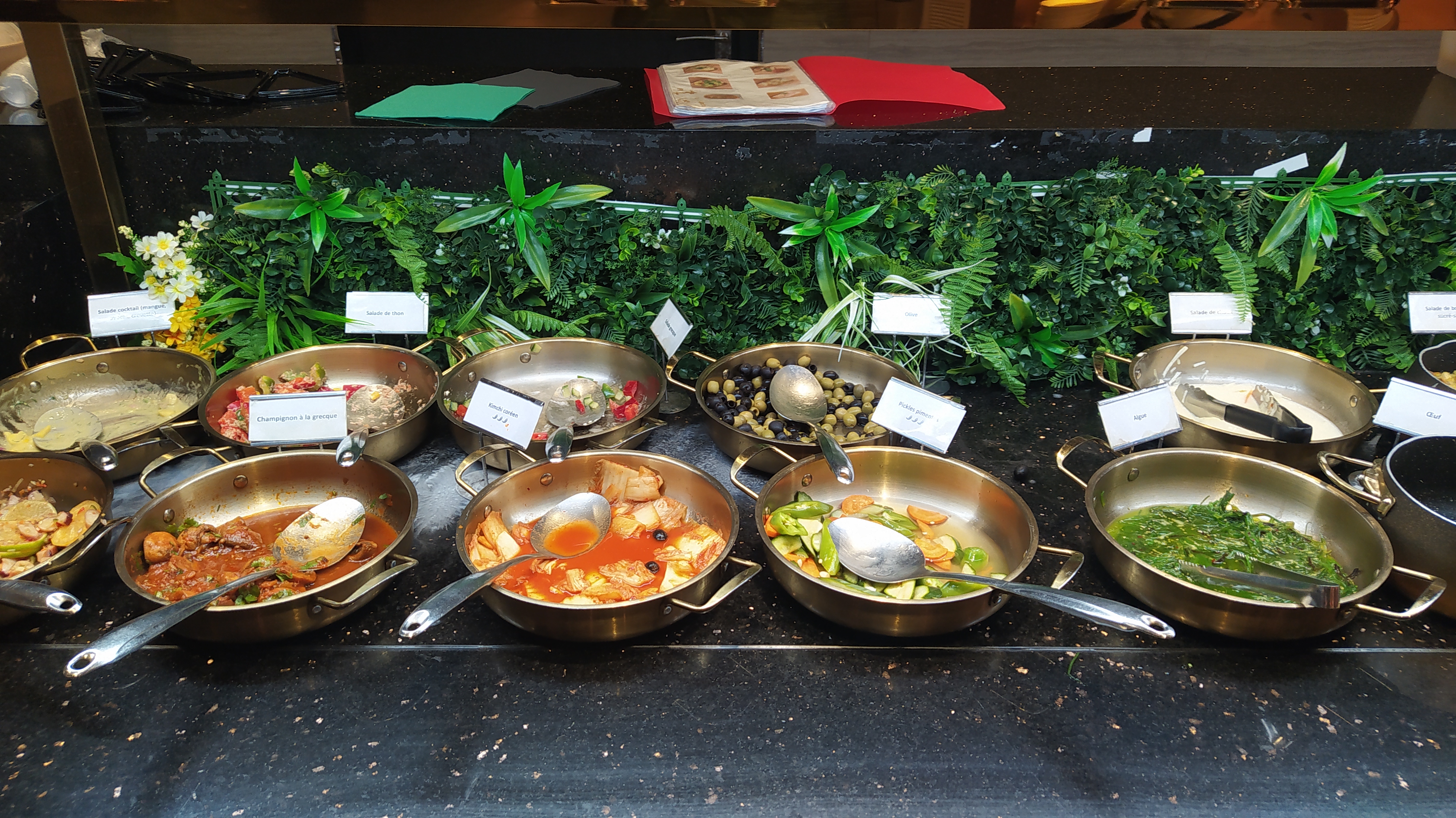 Après une séance de bien-être, mon amie à voulu me faire découvrir cette endroit, mais nous sommes arrivés à 14h10,donc avant encaissement, la personne à l'accueil nous à bien dit que rien allait achalandé, et qu'il fallait se servir un peut de tout, et qu'à 14h20 il commenceront à tout ranger et qu'à 15h c'était fini, ce que nous avons accepté car nous avions faim,au premier à bord, j'ai vraiment apprécié la décoration, de l'entrée du restaurant à la table, tout ce qui est nourriture, je peux juger sur ce que j'ai pû trouver, mais il y avait quand-même pas mal de chose, ensuite, c'est moyen niveau qualités, je penses que c'est énorme les quantités à travailler pour la proposition, donc je dirais que ça se mange, et un belle effort sur le dessert sauf la salade de fruits sans goût. Voilà je reviendrais quand-même tester le buffet complet. À bientôt.