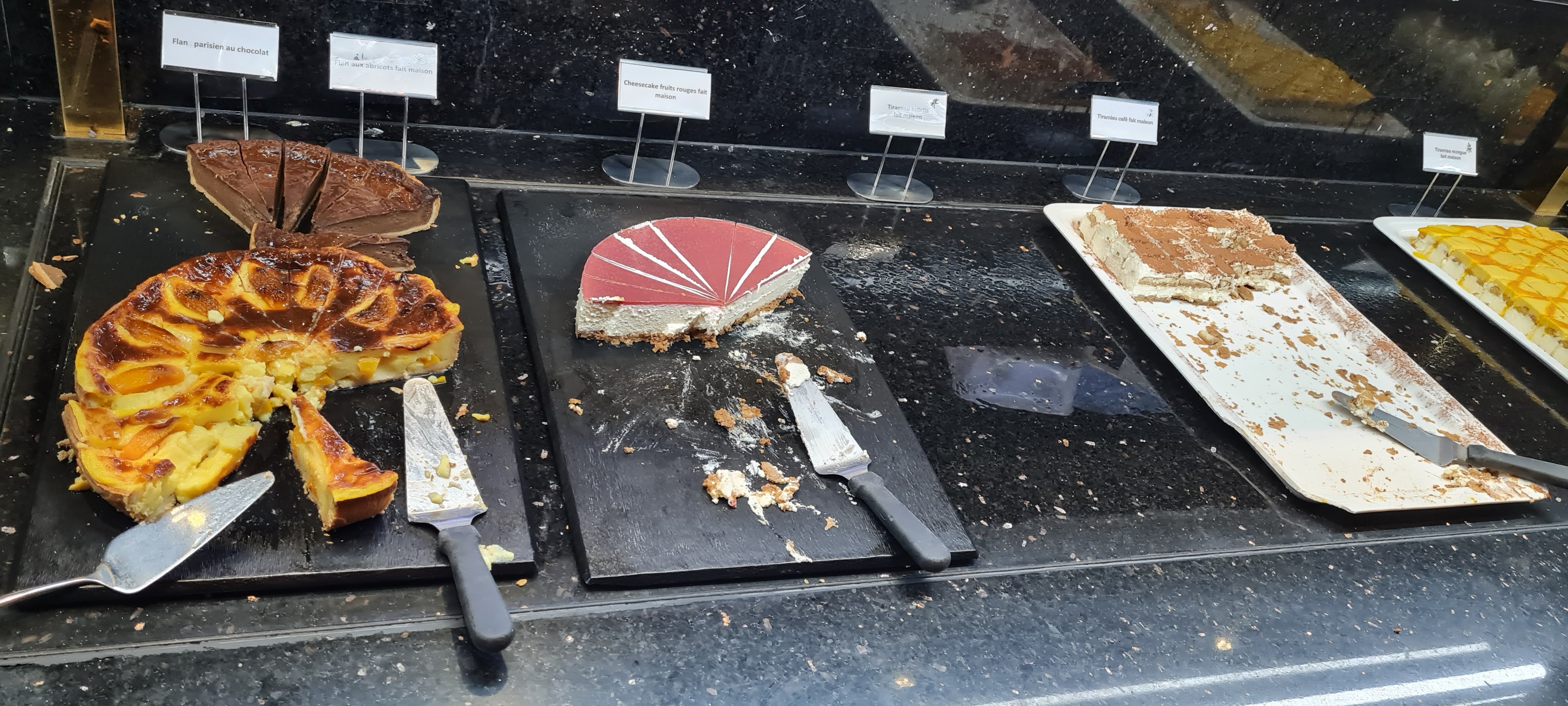 Endroit magnifique,il y a beaucoup à manger, mais c'est un piège puisqu'il a du choix et à la fin,on arrive pas à finir son assiette, c'est un Self service, pas de contact avec le personnel,la pâtisserie est peu moyenne à mon goût.