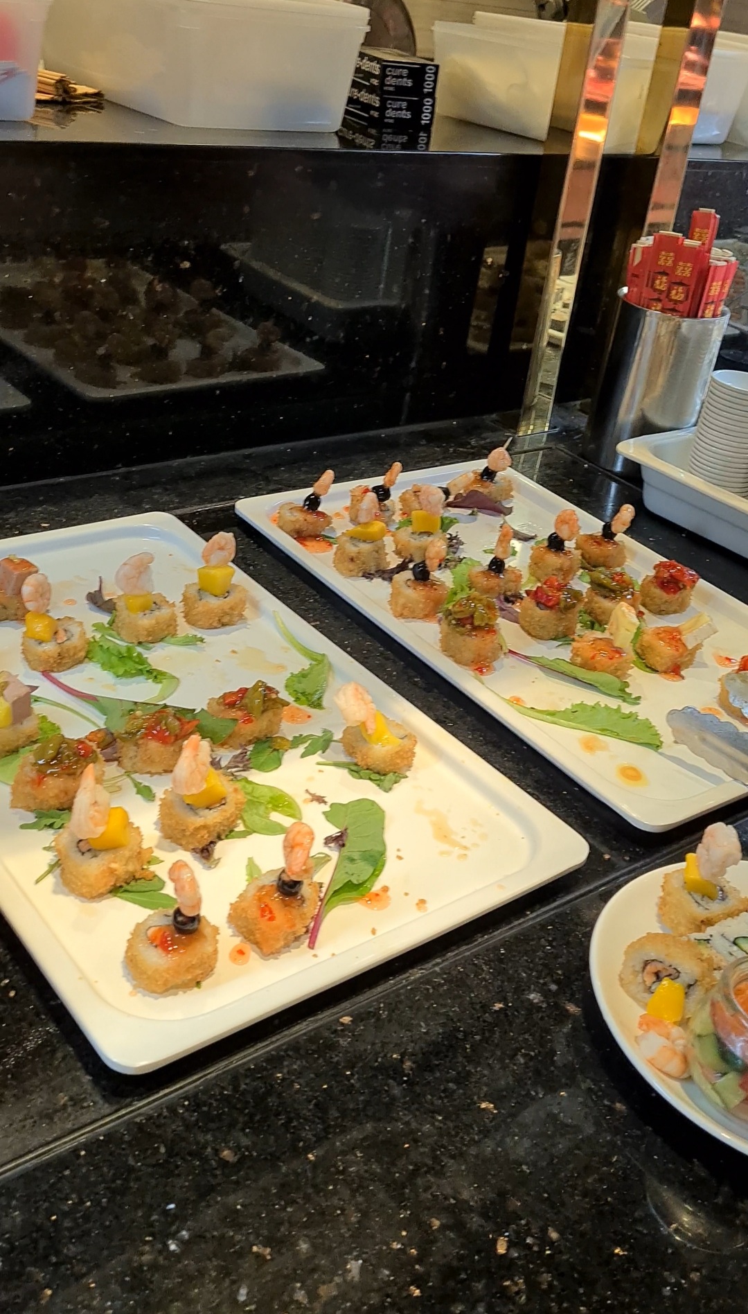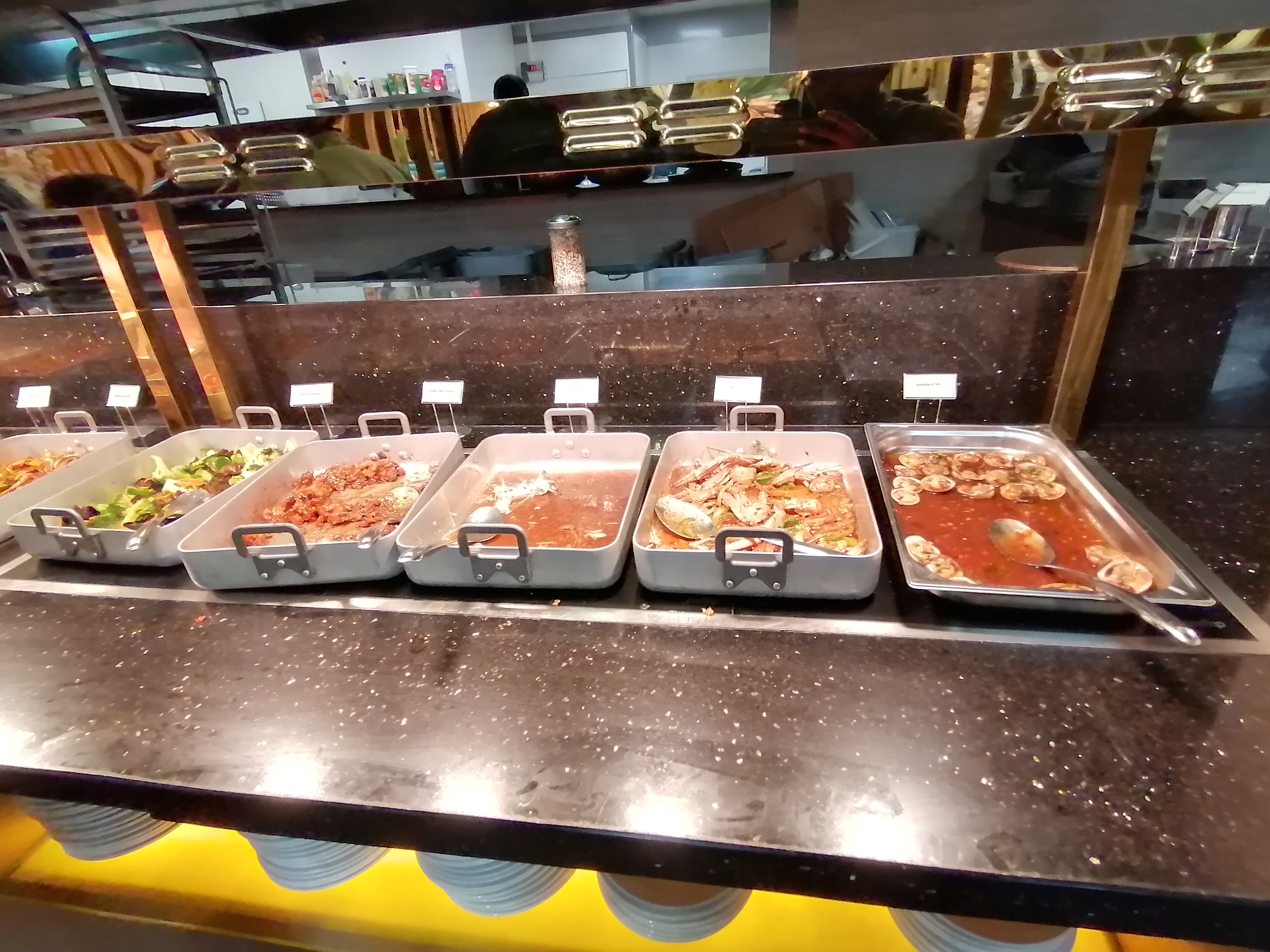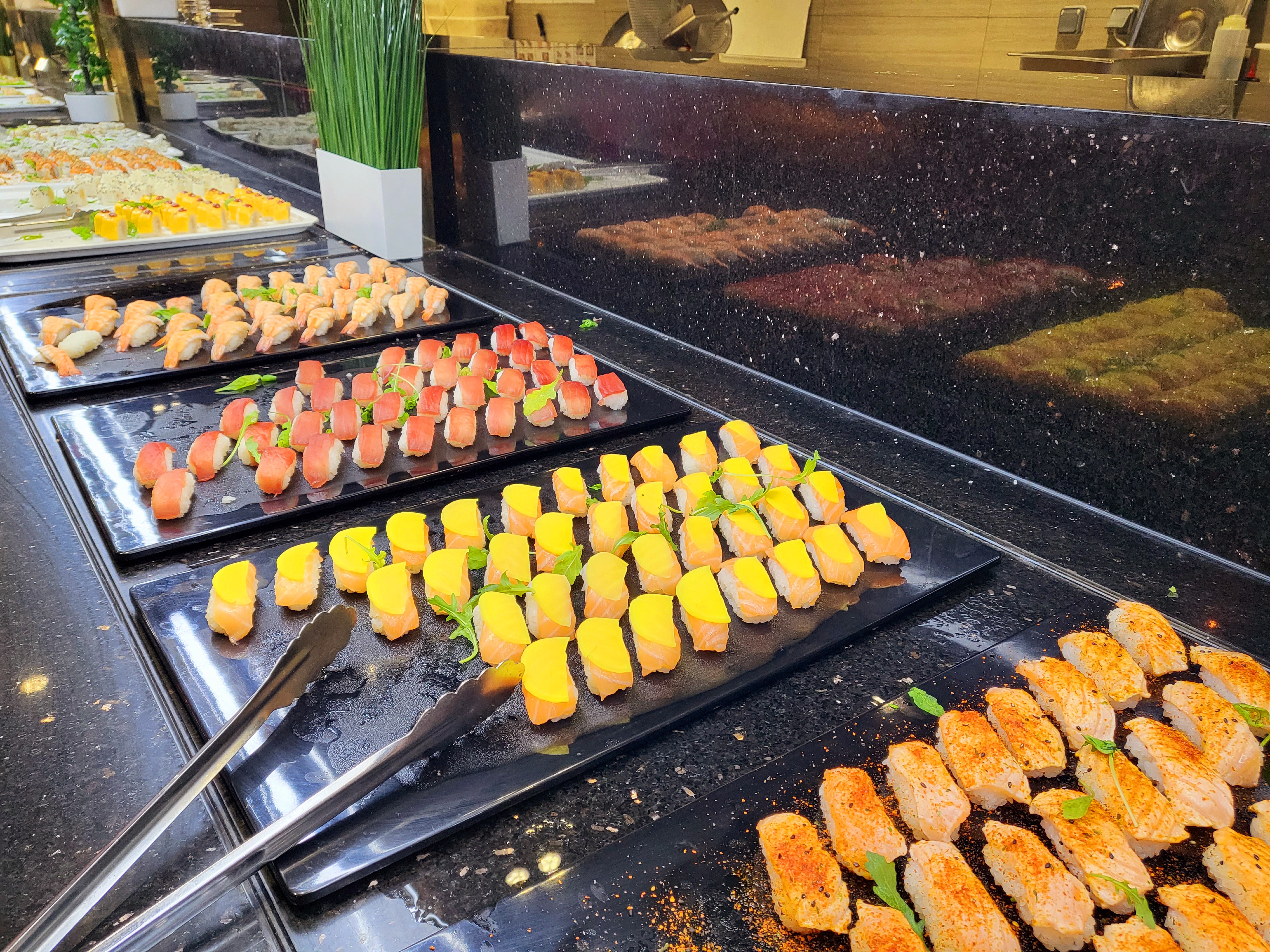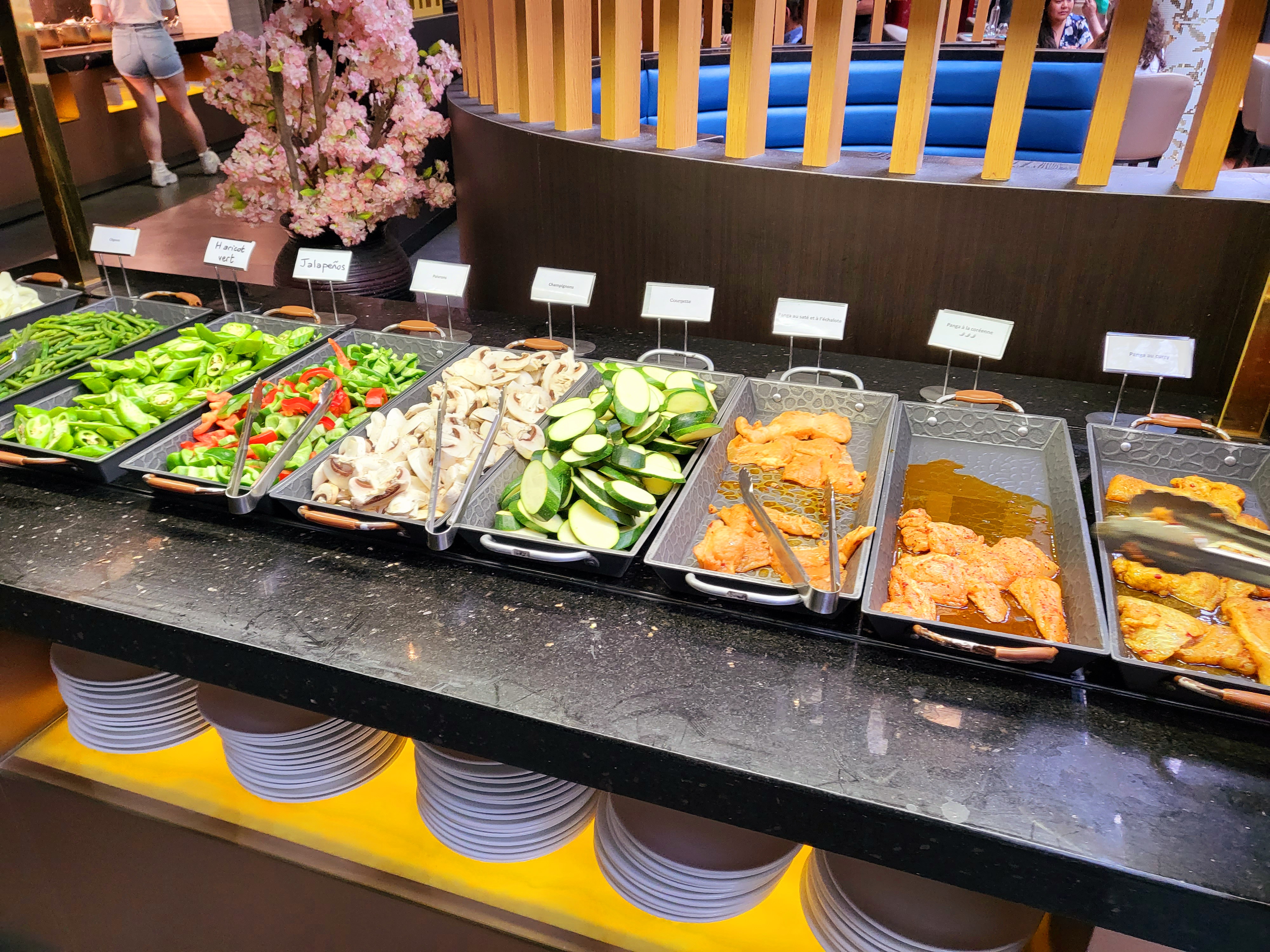 Les buffets sont vraiment diversifiés il y en a pour tous les goûts. Mais trop de monde. Ce lieu est immense trop bruyant. Certains mets sont moins goûteux que d'autres. Le prix est un peu élevé.