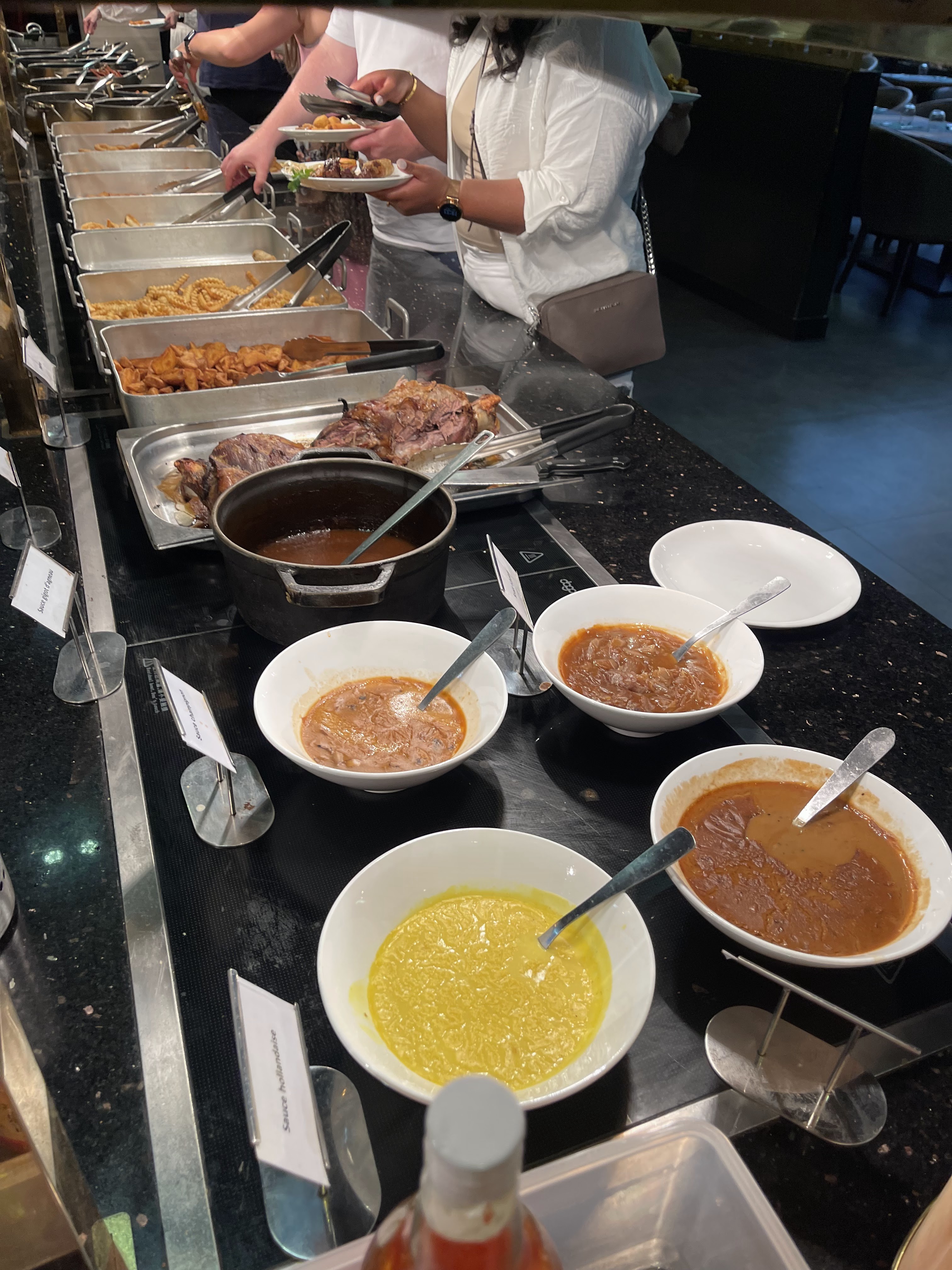 J'ai été très déçue par ce restaurant. Déjà la file d'attente, ensuite le prix (32.80 pour un buffet à volonté). Nous avions fait plus d'une heure de trajet, nous avons donc serré les dents. Nous étions cinq: deux d'entre nous ont vomi dans le parking et une autre a eu la courante. Les plats étaient froids, très peu de choix pour la salade, les merguez étaient beaucoup trop salées. Par contre les bouchées piquantes au fromage et les pizzas, un délice. J'ai bien aimé le framboisier. Et un grand merci à un des jeunes hommes aux grillades qui a été bienveillant. Reviendrai-je? Non Pourquoi? La qualité n'était pas là.