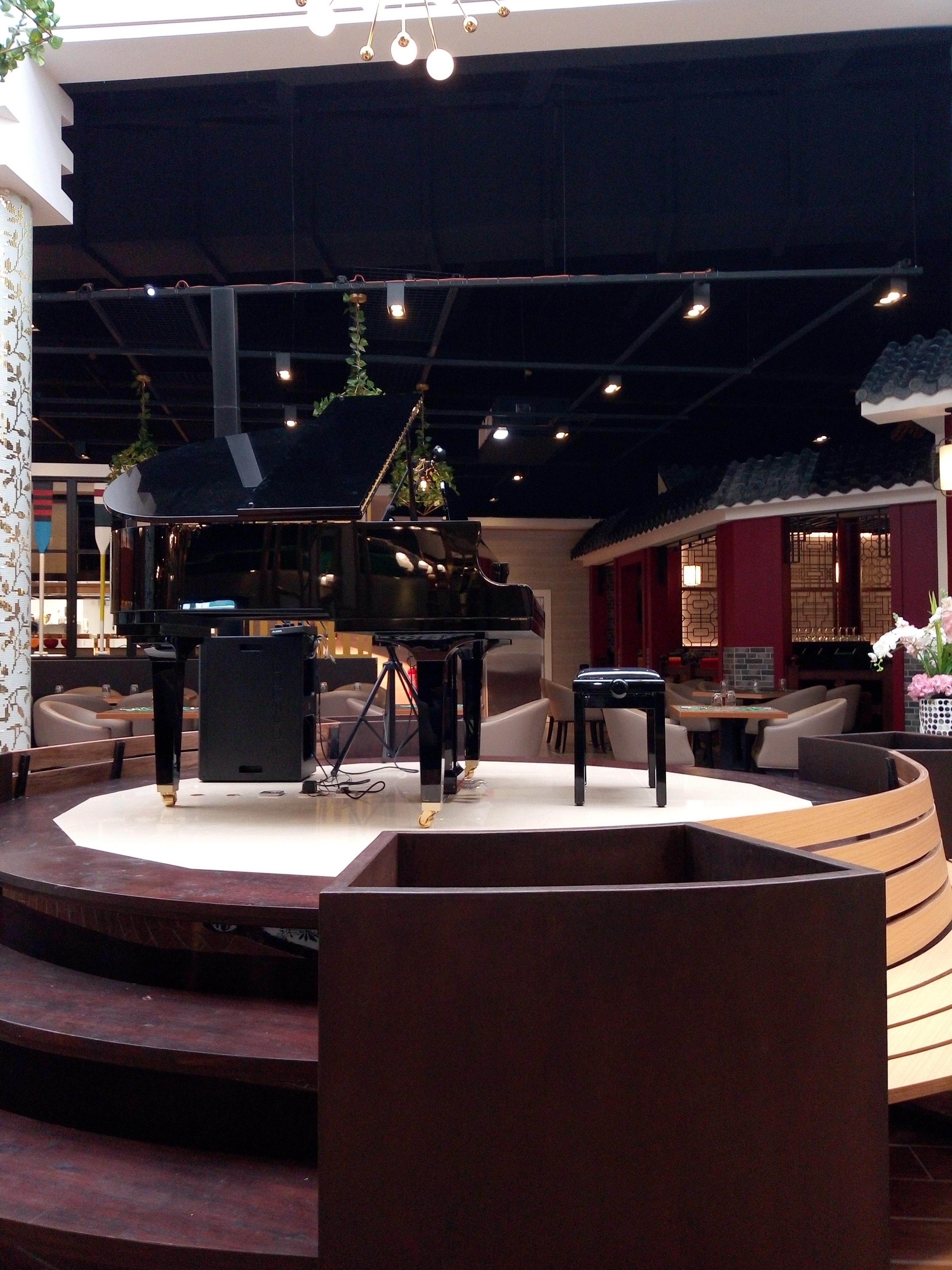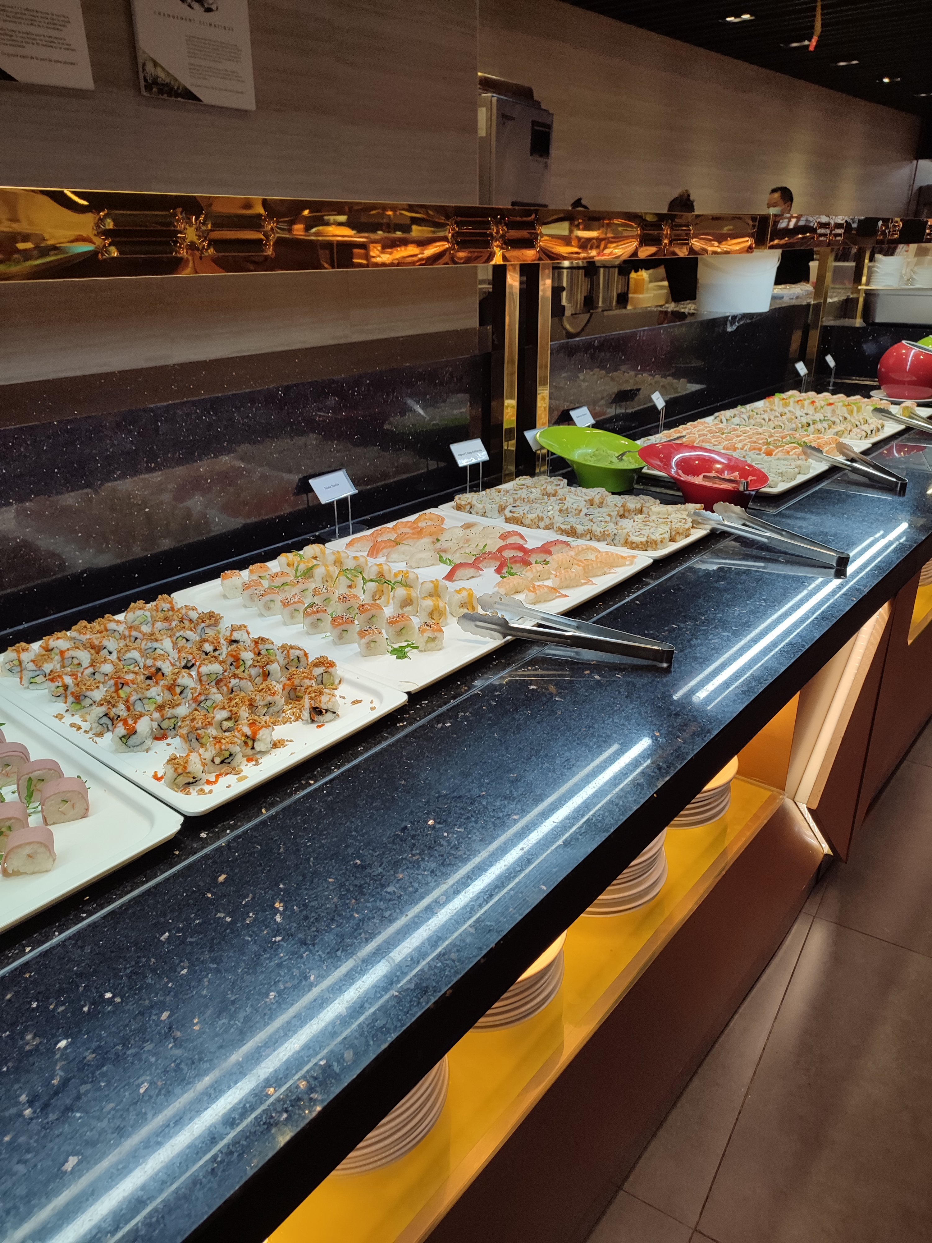 Le cadre la décoration est jolie! La scène avec le piano aussi. Le pianiste joue bien bravo à lui! Le service est plutôt rapide et ils sont sympathiques. Ce n est pas facile d enlever autant d assiettes rapidement...Cote salle Asiatique il fait un peu frais par contre ! Il y a de larges choix de plats de viandes..sushis. fruits de mer. Cela est bon les desserts aussi! J'ai aimé. Un peu cher pour deux personnes quand même mais moment sympathique !