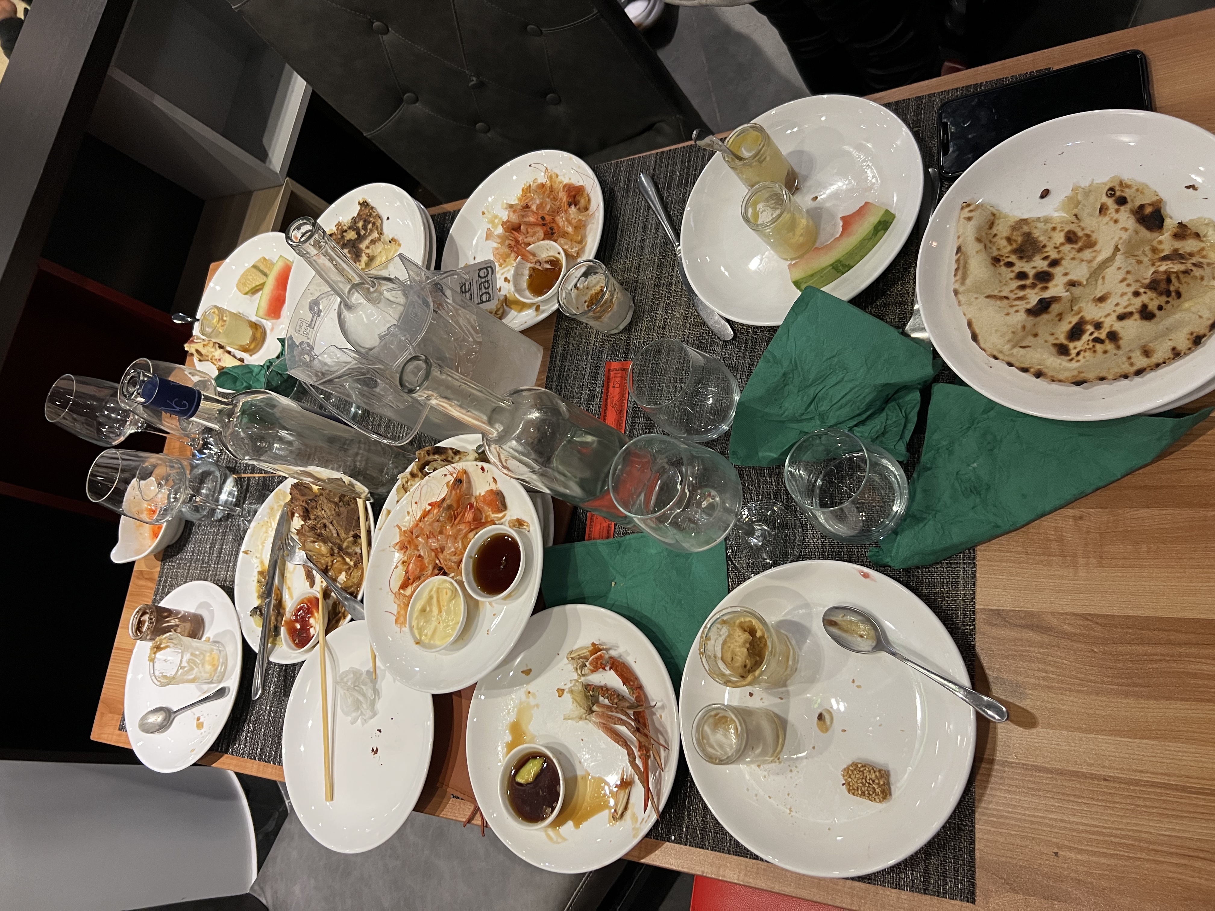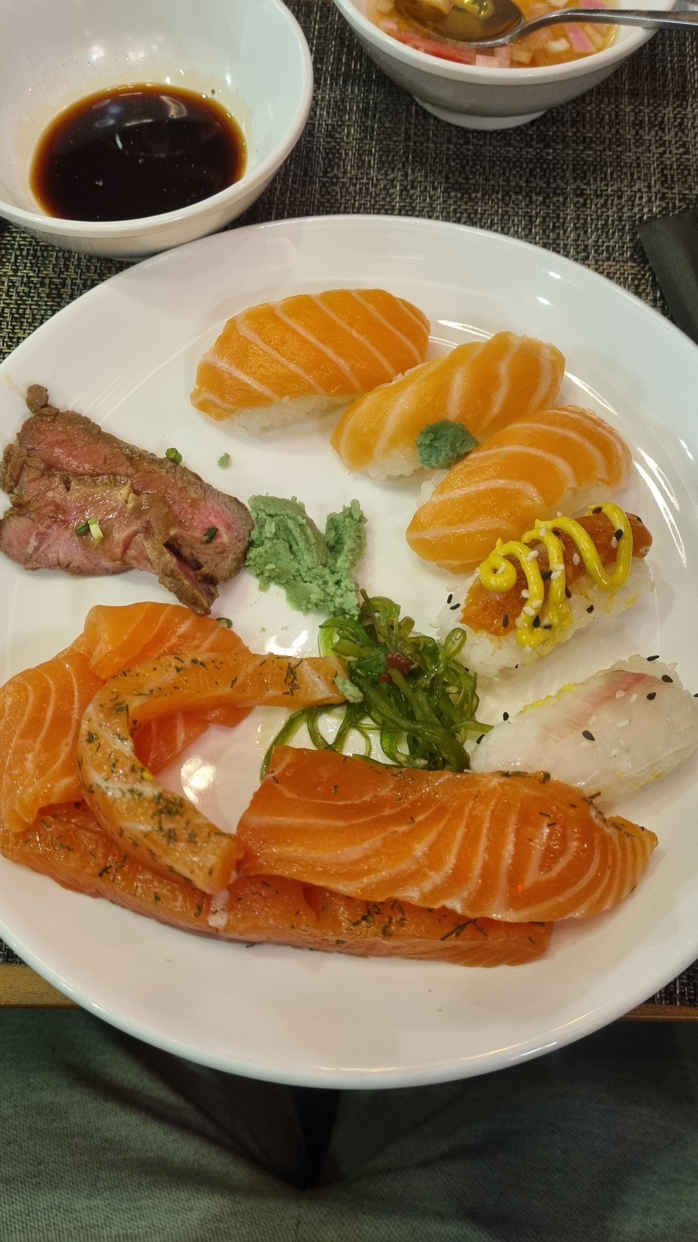 Tout est moyen. Obligé de demander à ce qu'on nous place alors que personne d'autre n'attends sûrement un manque de communication des équipes. On nous apporte les margaritas très rapidement alors qu'on demande plusieurs fois une carafe d'eau ; en passant la pire des margaritas que j'ai bu (pas de glace pilé, chaude et seulement le goût de l'alcool). Point positif beaucoup de choix, les grillades dont très bonnes ainsi que les fruits de mer. Crêpes et naan fait à la demande. Point négatif trop de riz dans les souchis et maki pour peu de garniture et le poisson pas forcément frais, les fritures sont dures et froides du fait de restée longtemps à l'air libre.
