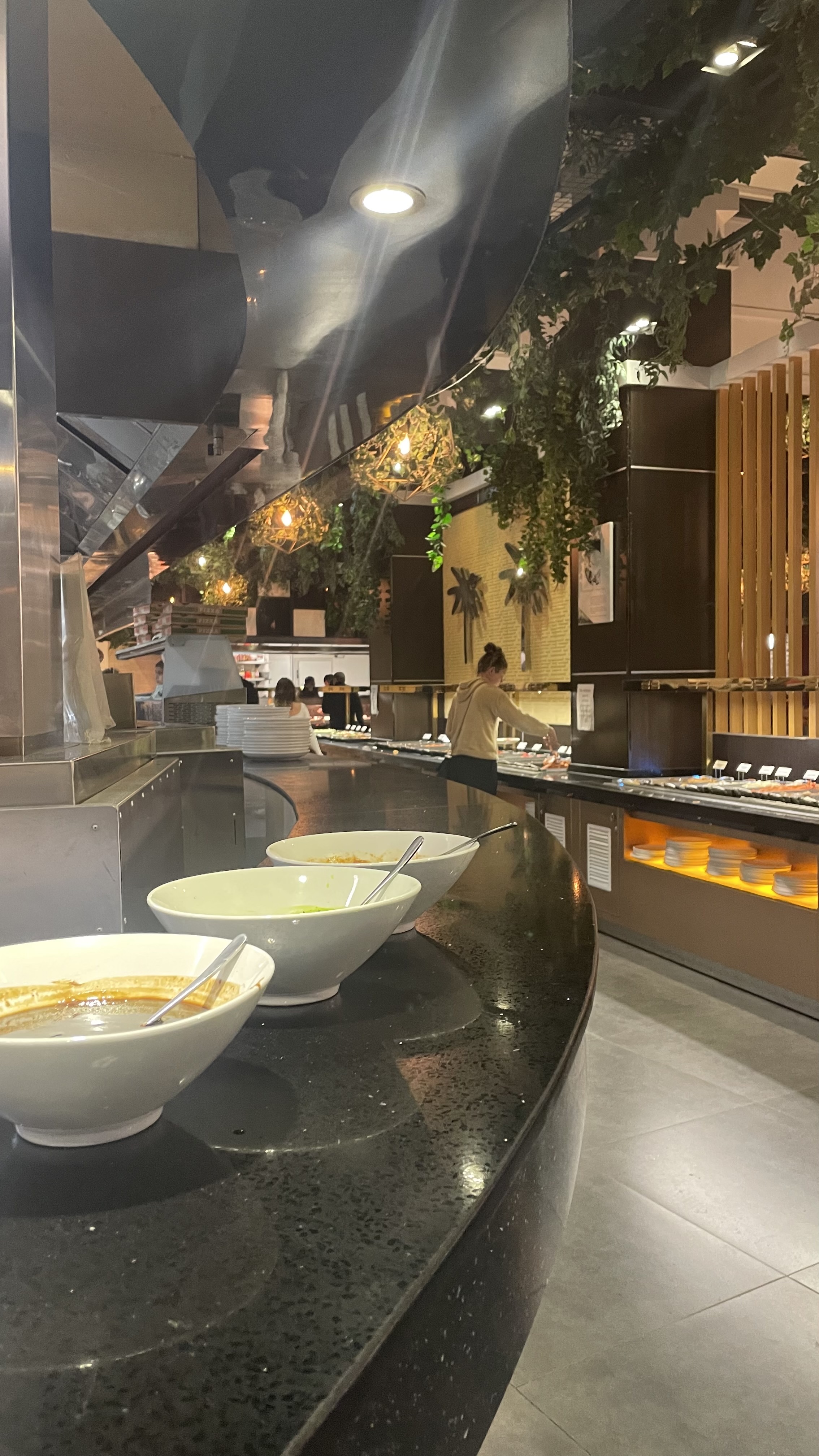 La décoration est juste superbe😍😍🤩 Il y un coin ou les places sont façon asiatique donc au sol avec une table basse. Le restaurant est grand et a une bonne variété de plat. Il y a la queue dès l'ouverture 😂 Ont a pas spécialement le temps de manger tout ce qu'on veux vue qu'il y a beaucoup de monde et que la nourriture pars vite. Personnel sympa avec qui on peut discuter.👌🏽👌🏽 Un employé passe pour récupérer les plats vides (peut être un peu trop insistent parfois 😅) Les lasagnes etaient juste 🤌🏽🤌🏽