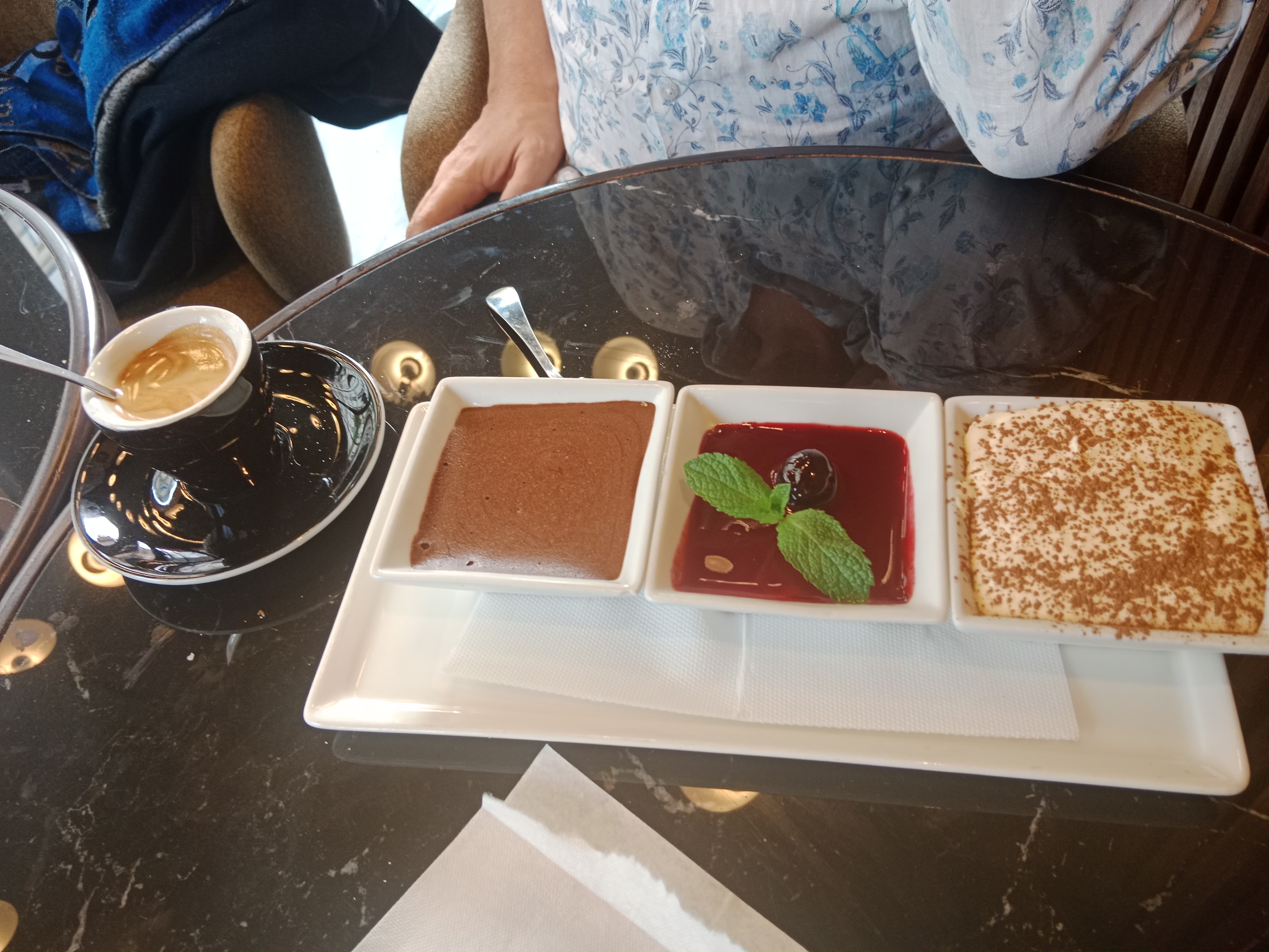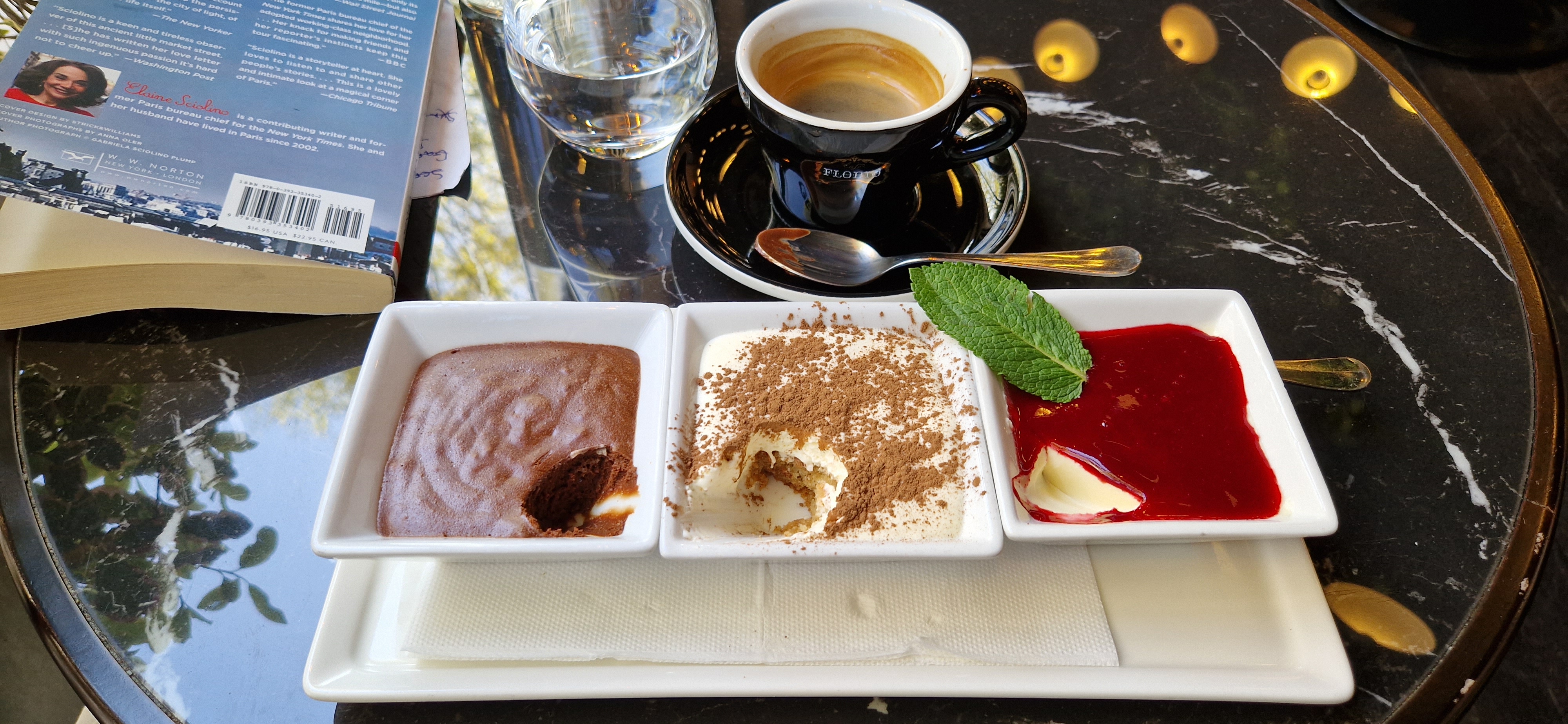 Délicieuses pâtes au saumon et café gourmand. Les serveurs serviables ont compris mon horrible français.