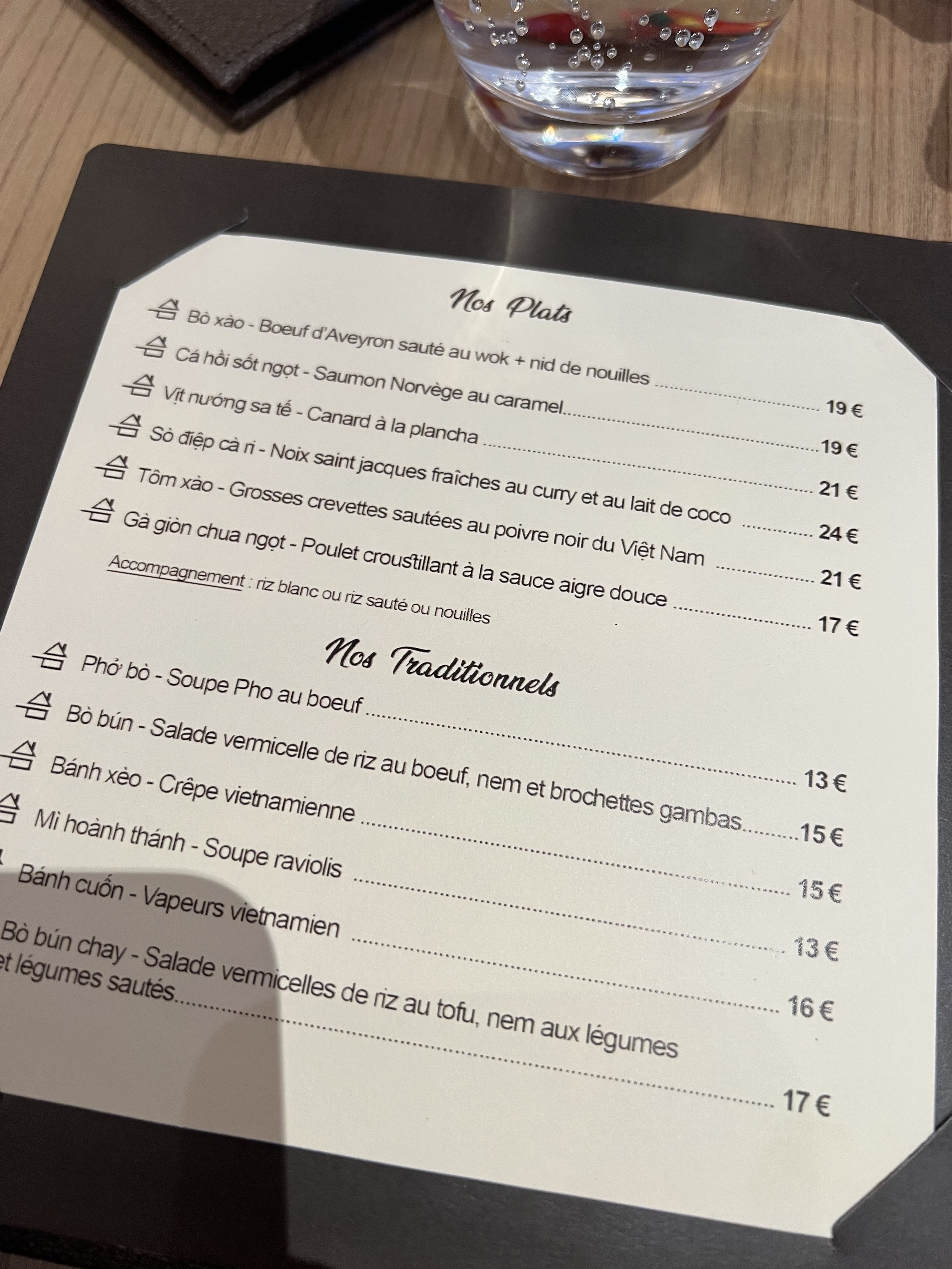 Cuisine vietnamien excellente, surprenante de saveurs et originalement présentée. Les plats sont copieux avec un excellent rapport qualité prix. 12 à 24€ le plat. De même les boissons ne sont pas chères. 4.50€ le verre de vin de bons crus locaux. Ambiance raffinée. Seul bémol, service un peu long et perfectible.