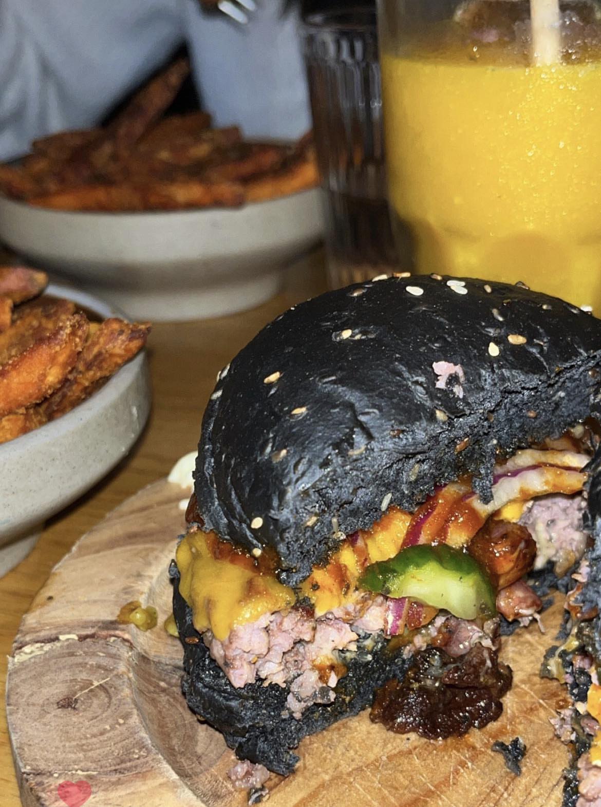 Nous avons testé le fameux black Burger. Effectivement, il vaut le détour. Accompagné de frites de patates douces, il a régale nos palais. Seul regret, nous avons vu les cocktails en partants et ils avaient l'air top aussi ! A refaire pour tester les autres plats et boissons. Concernant le prix le Burger plus frites est à 18 euros.